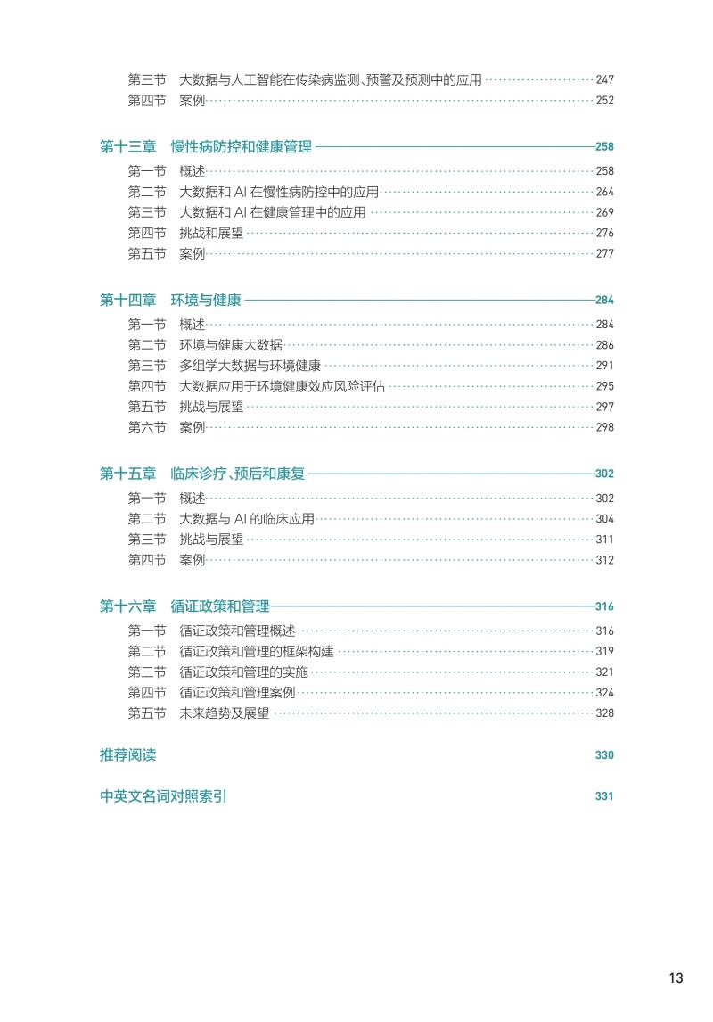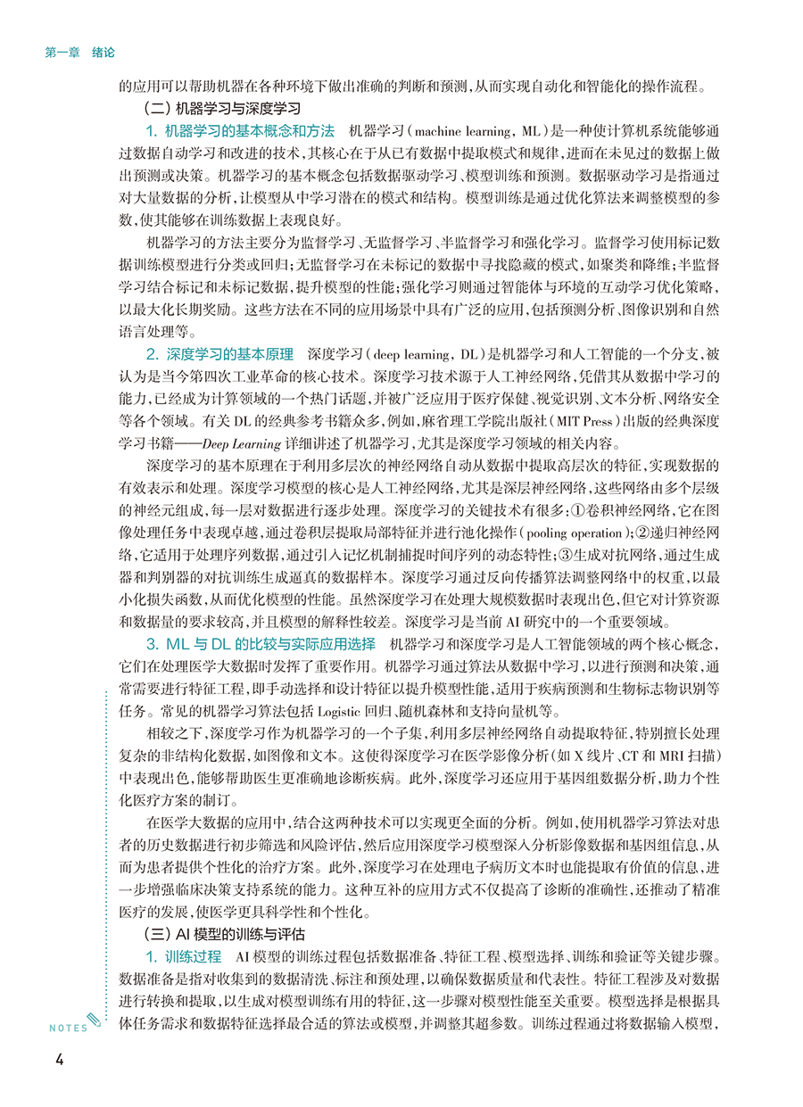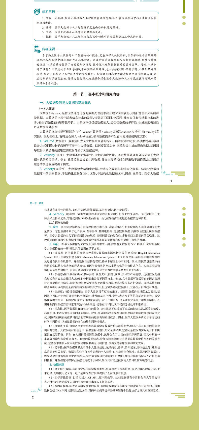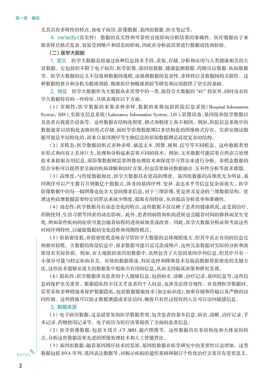 本教材共设置四部分内容。**部分以医学大数据基础知识为主线,阐述医学大数据的基本特点、研究及应用、所面临的挑战;以及公共卫生大数据、医疗健康大数据、生物大数据等三种主要的大数据类型。**部分重点介绍医学大数据处理、管理和治理,包括数据提取、处理、数据降维,医学大数据的管理、治理及伦理。第三部分介绍医学大数据分析技术,包括常见机器学习模型和常见深度学习模型等。第四部分介绍机器学习在医学大数据分析中的实际应用,包括多个精选案例的真实数据或模拟数据应用。