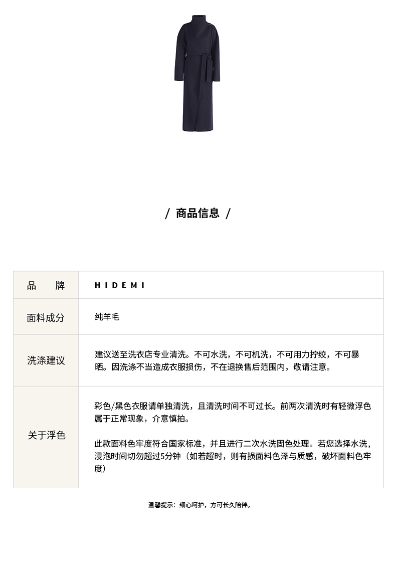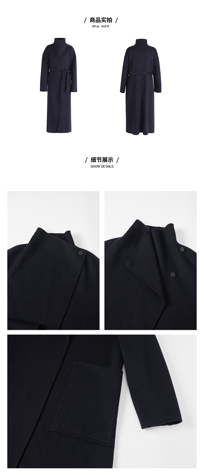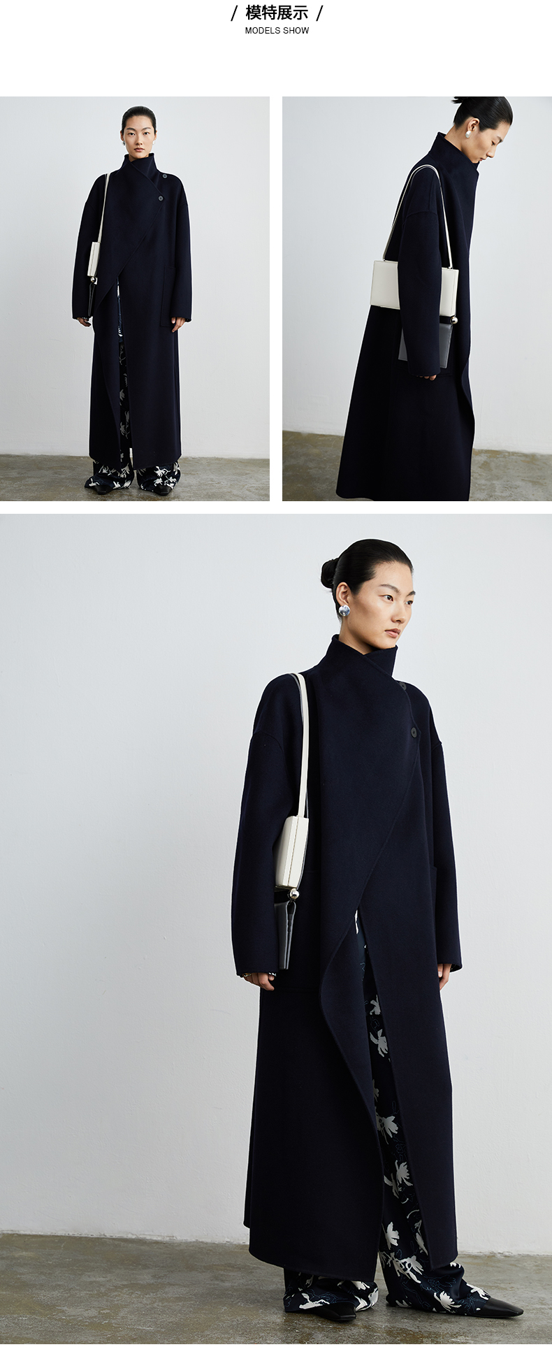 HIDEMI 藏蓝色两粒扣设计感立领腰带式不对称长款澳毛大衣