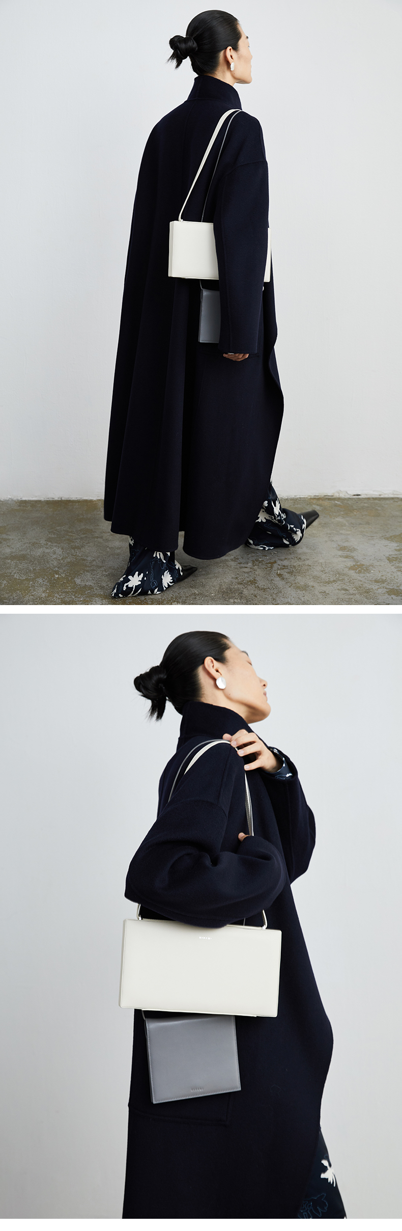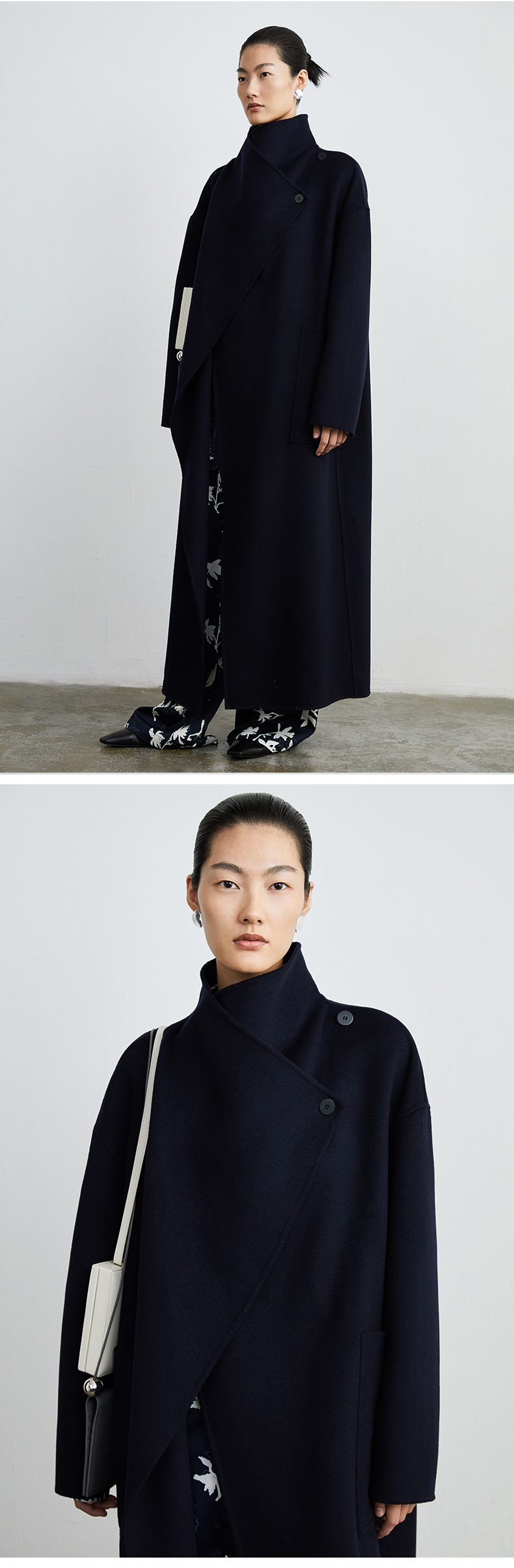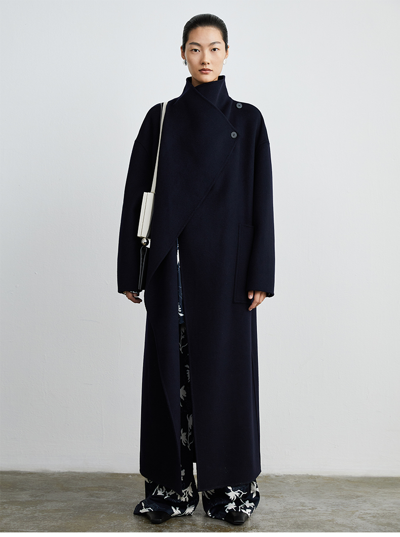HIDEMI 藏蓝色两粒扣设计感立领腰带式不对称长款澳毛大衣