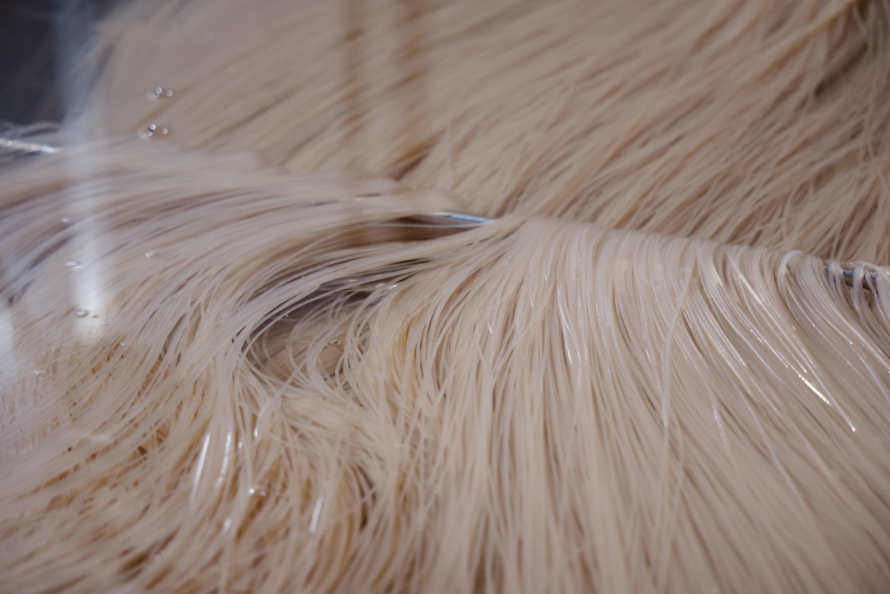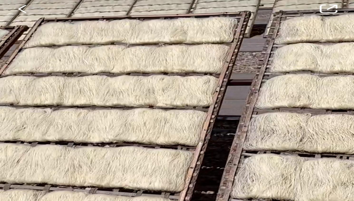 6、将蒸熟米线泡水搓散丝,平铺晒干或挂起晒干