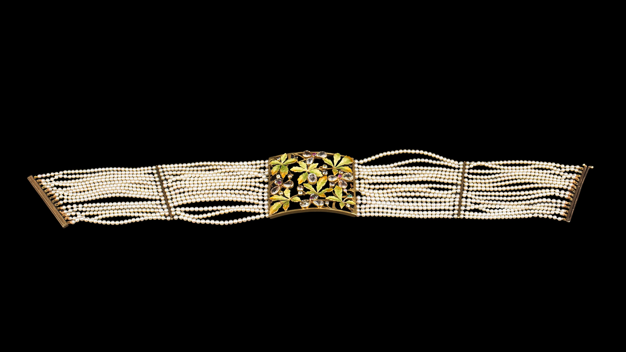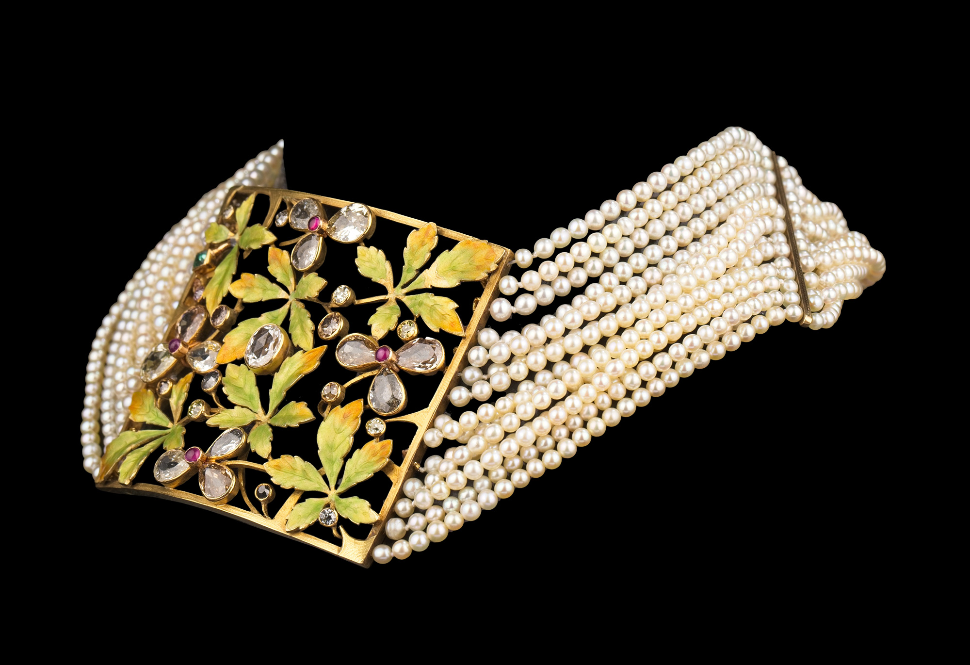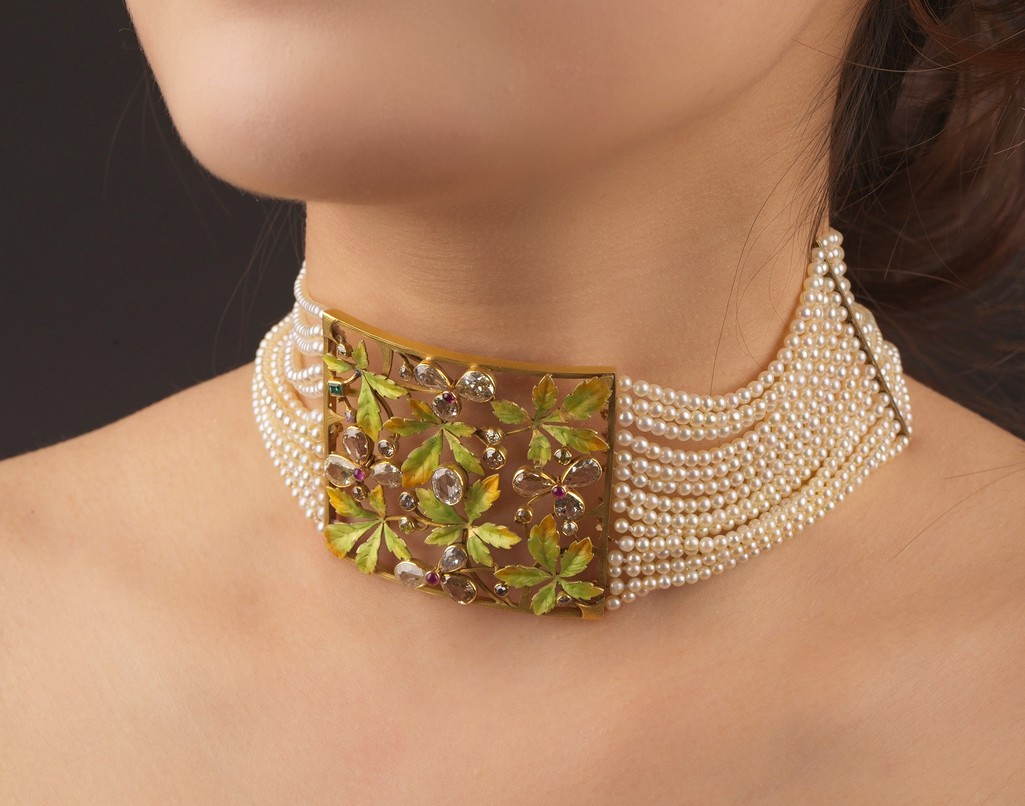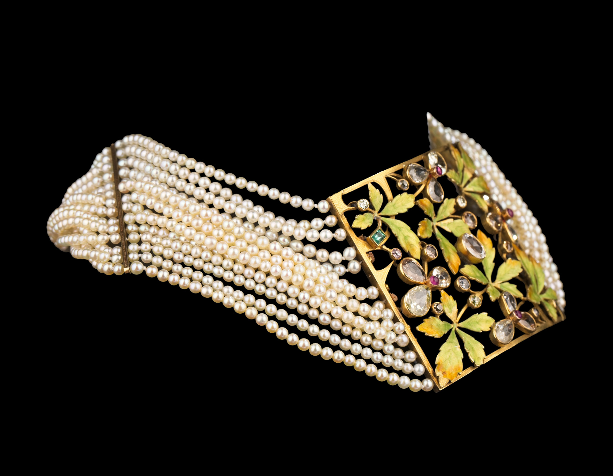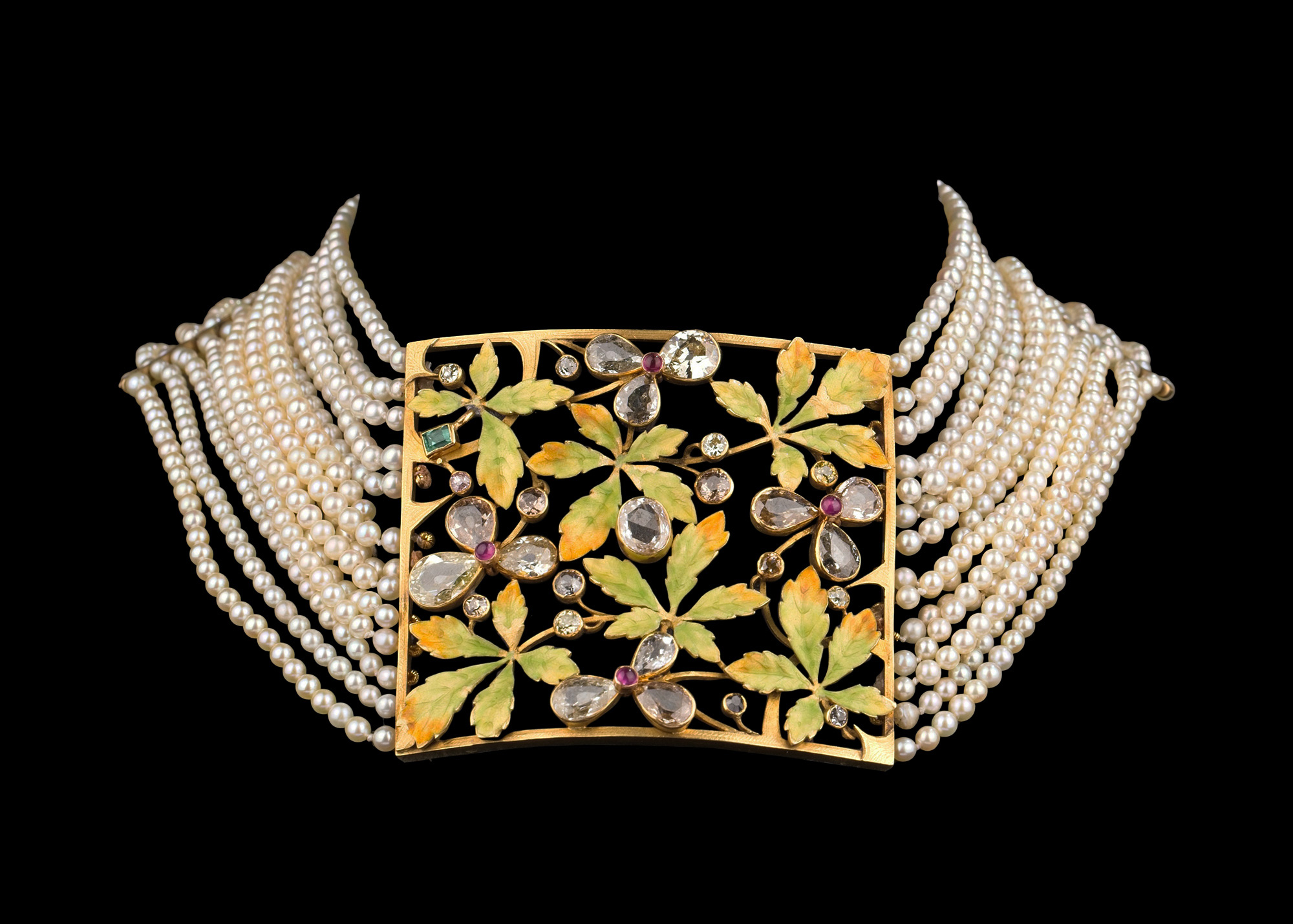 20世纪法国出品新艺术风格18K黄金嵌花叶造型空窗珐琅钻石红宝石及祖母绿装饰多股天然海水珍珠项链