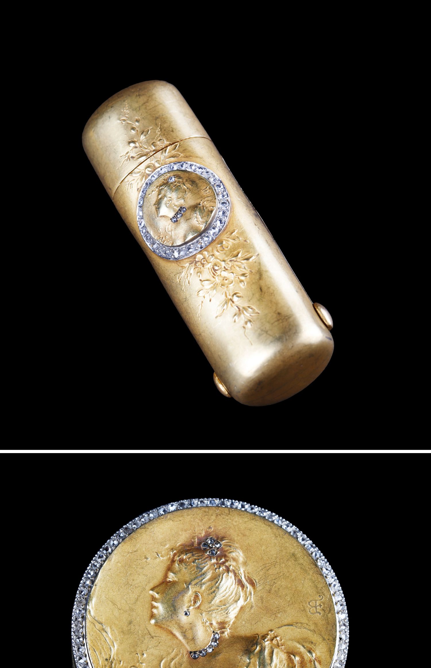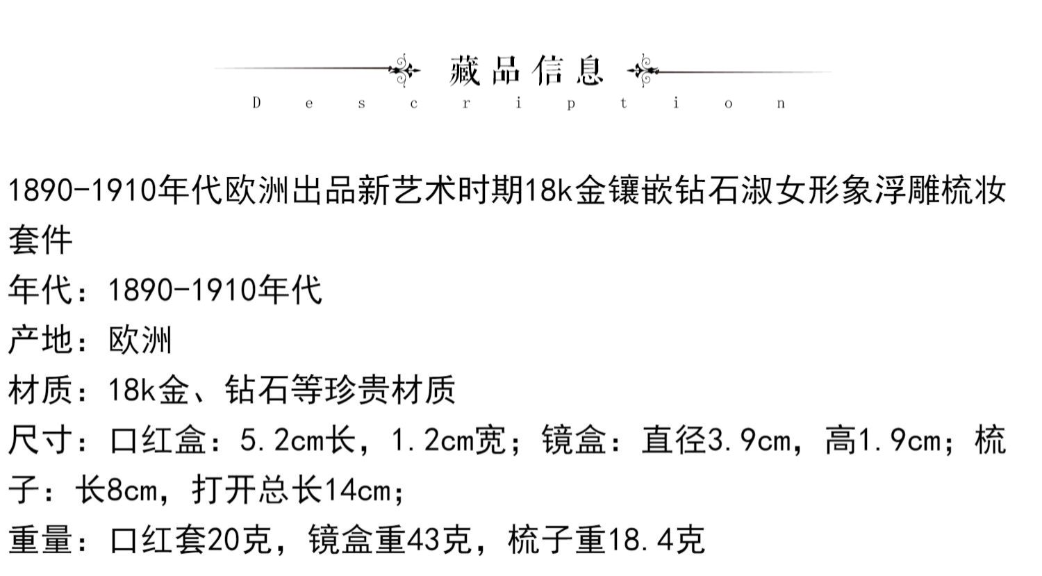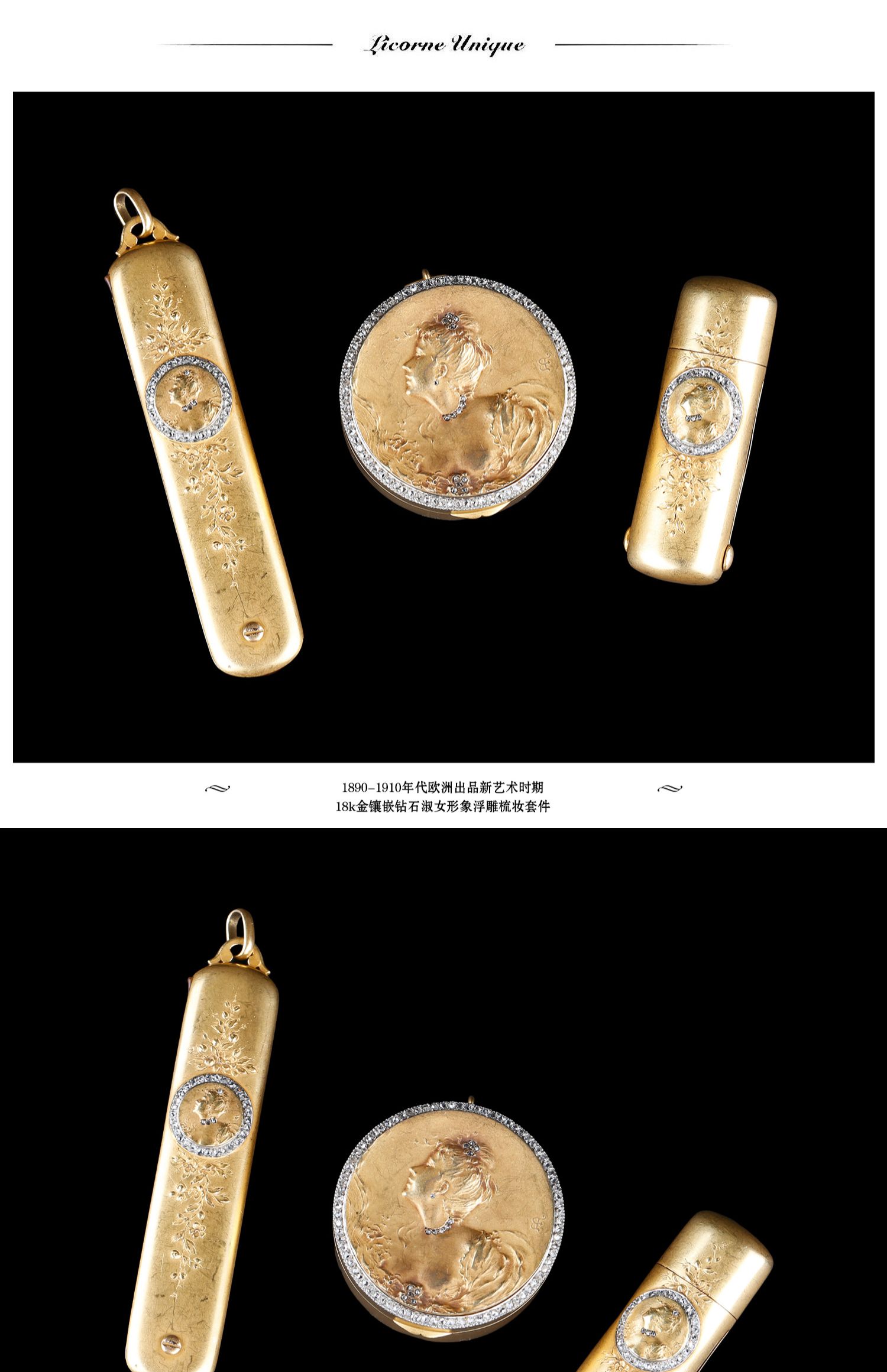 独角鹿西洋古董欧洲新艺术时期18K金镶嵌钻石淑女浮雕梳妆套装