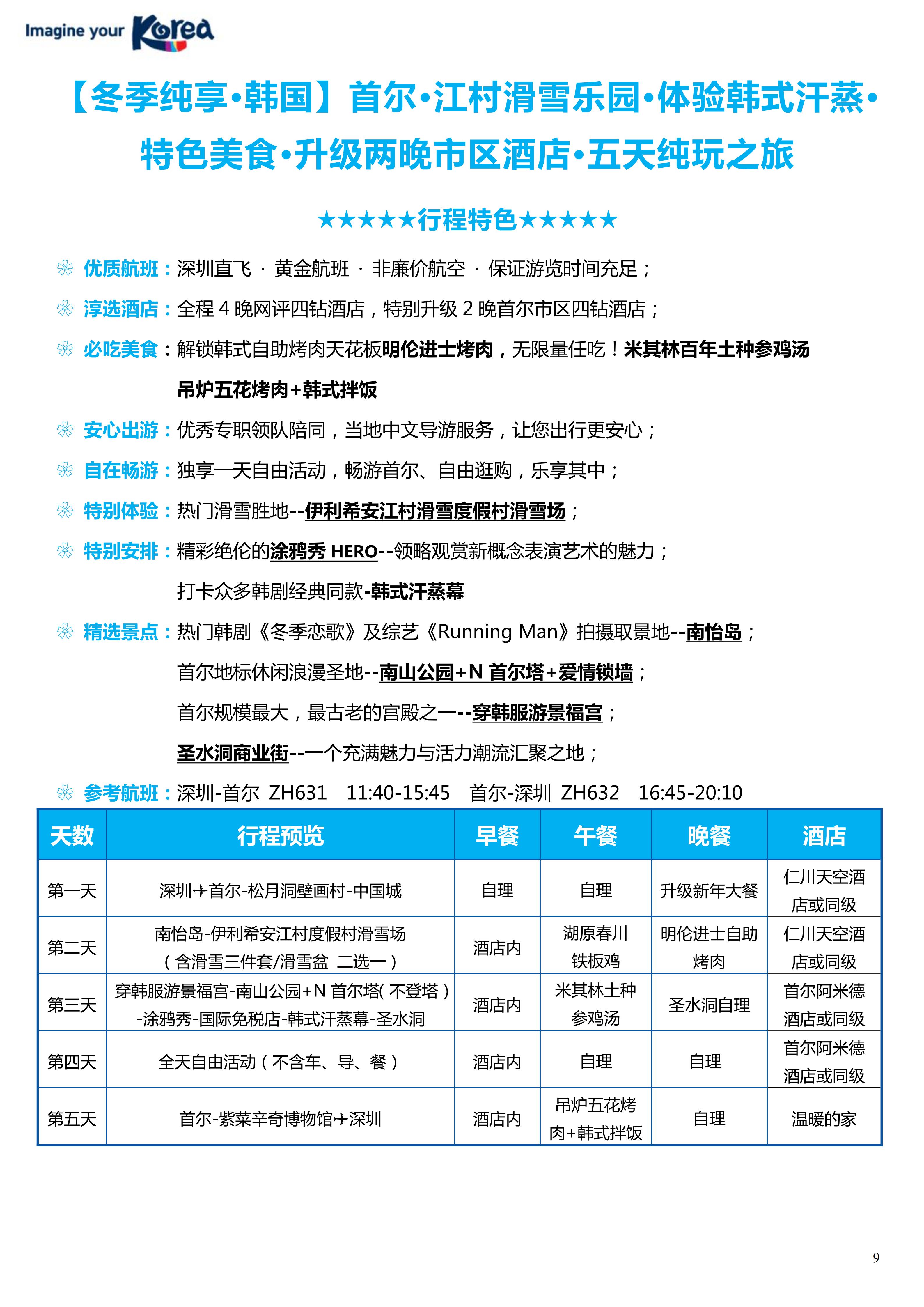 【春节、寒假】<韩国首尔·伊利希安江村滑雪度假村滑雪场·体验韩式汗蒸· 特色美食5天-深圳直飞往返>特别安首尔1天自由活动、升级2晚首尔市区4钻酒店