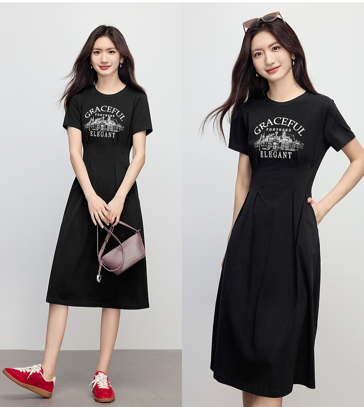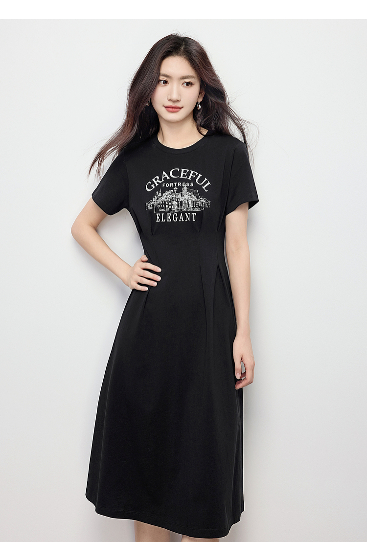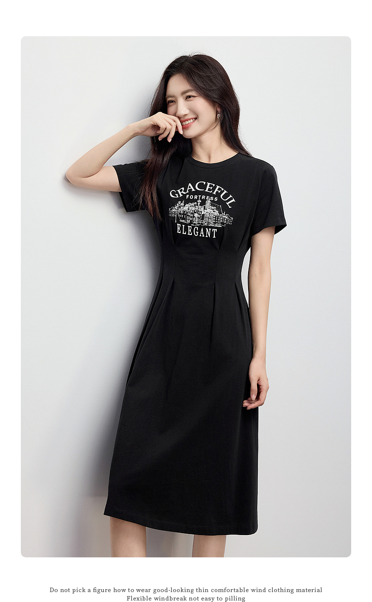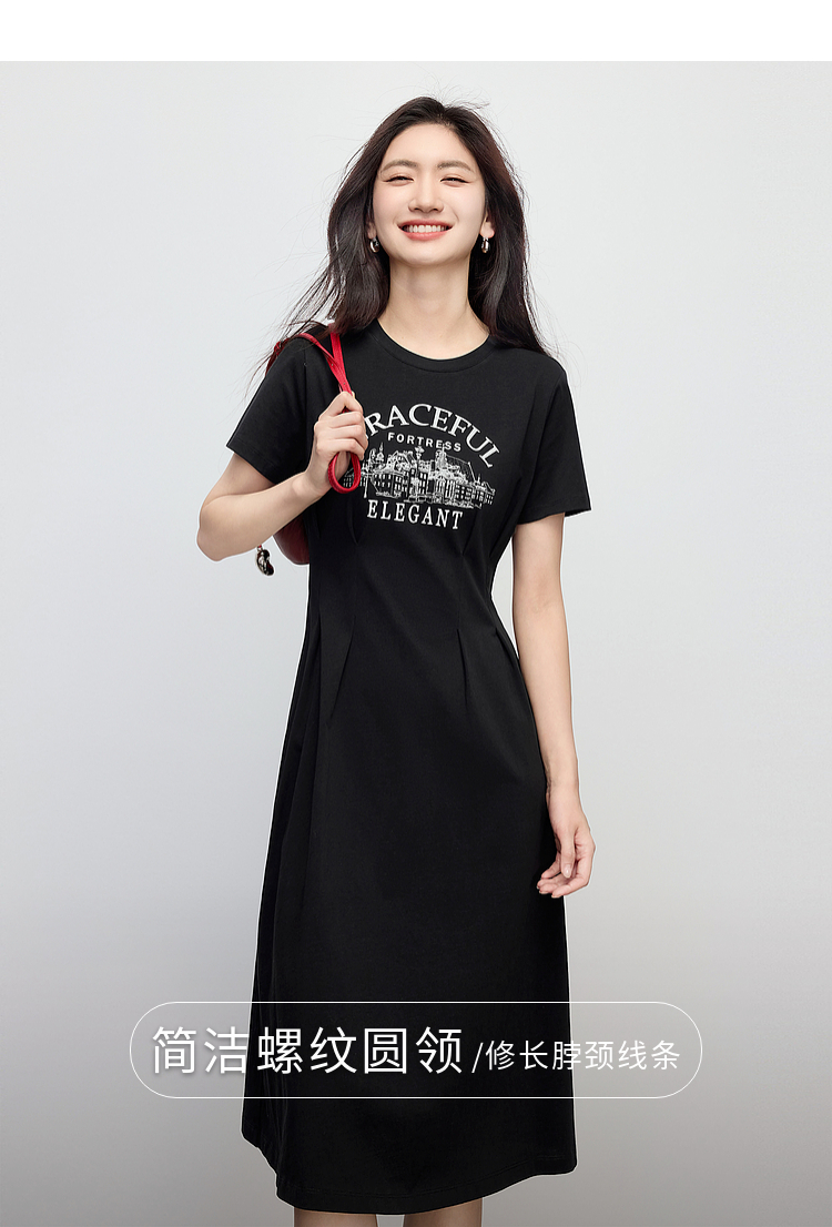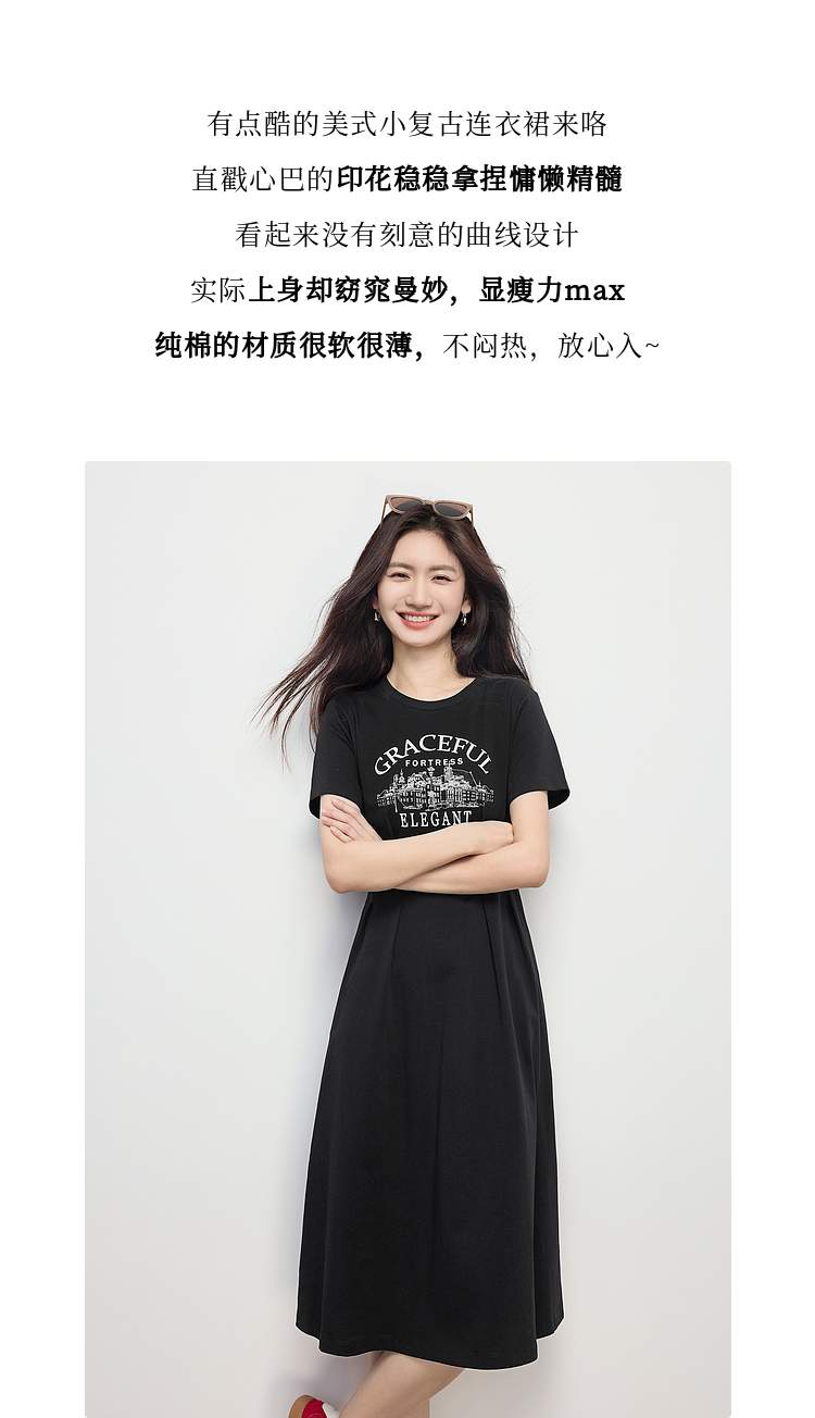 【专属特价】熙世界美式复古印花连衣裙女夏装休闲收腰修身黑色纯棉短袖T恤裙