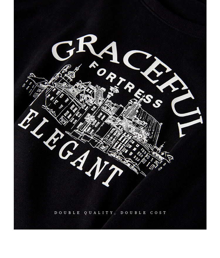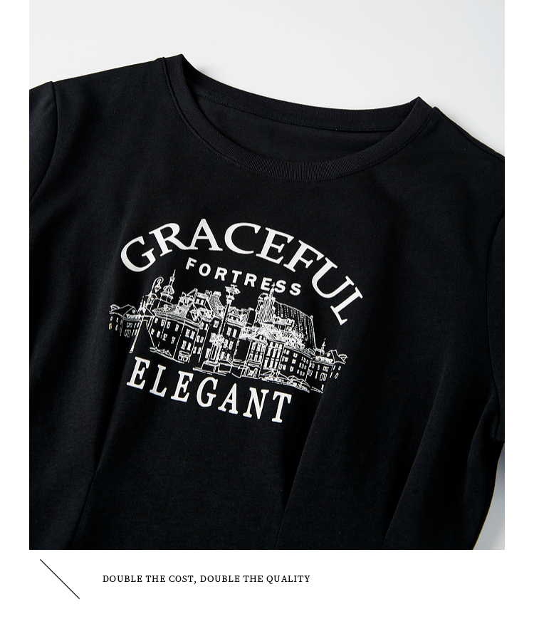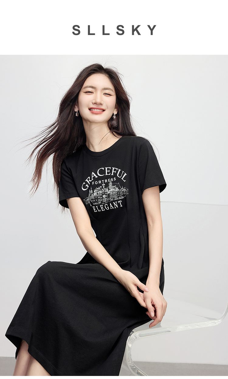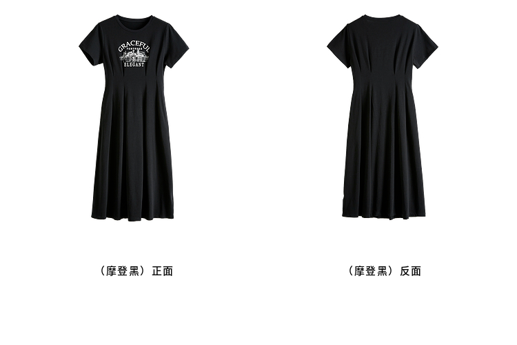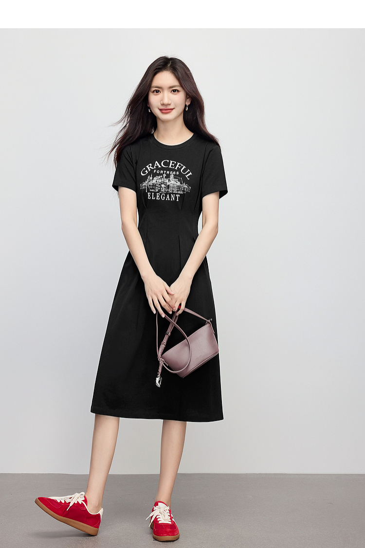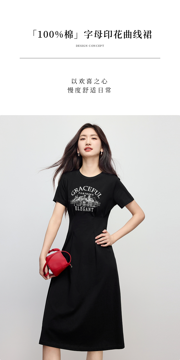 【专属特价】熙世界美式复古印花连衣裙女夏装休闲收腰修身黑色纯棉短袖T恤裙