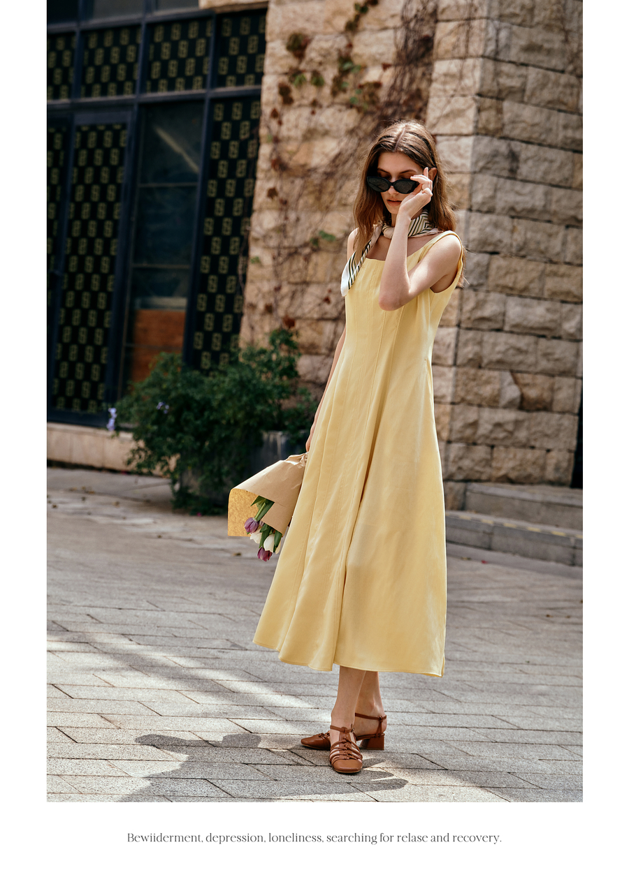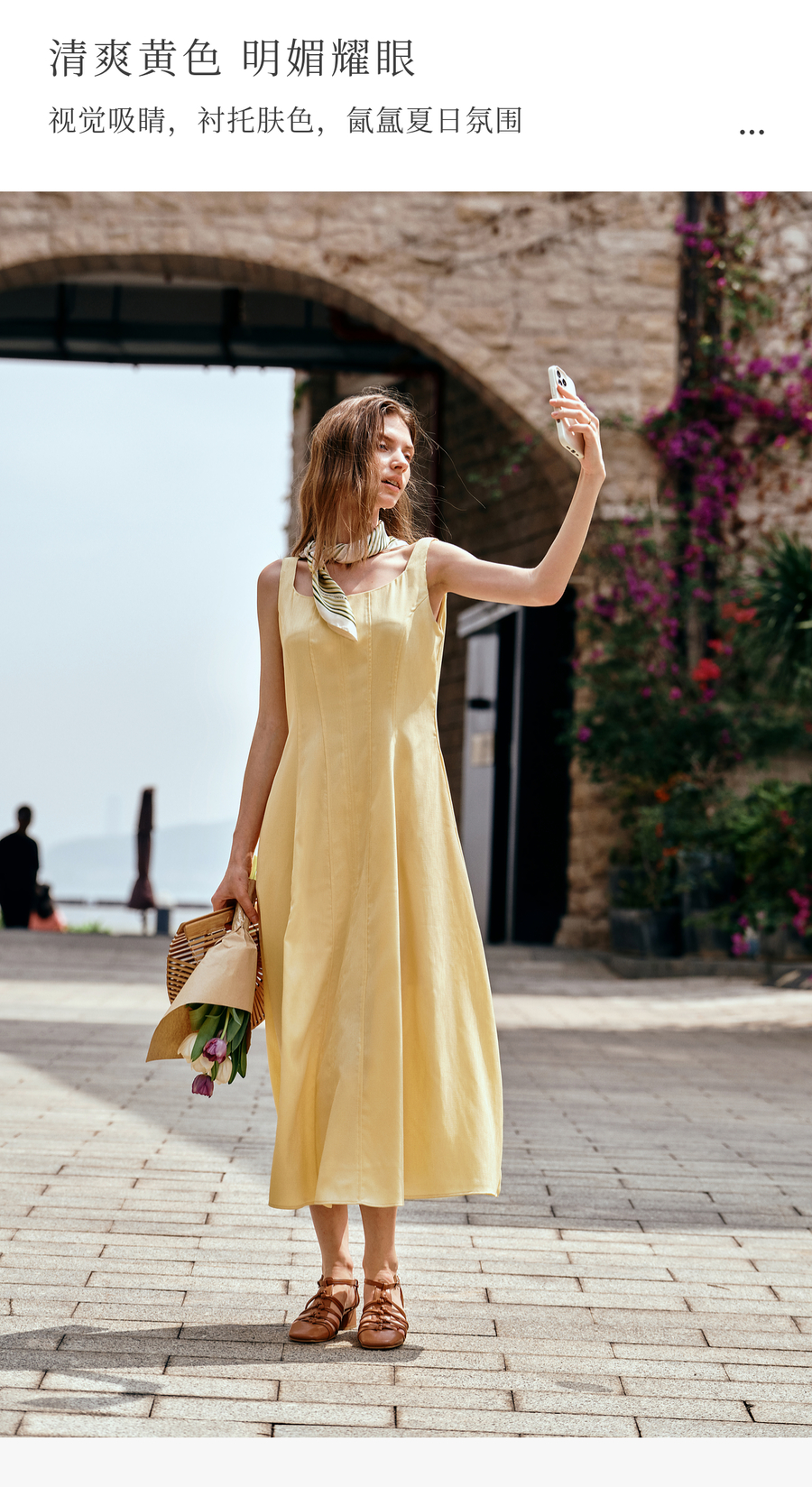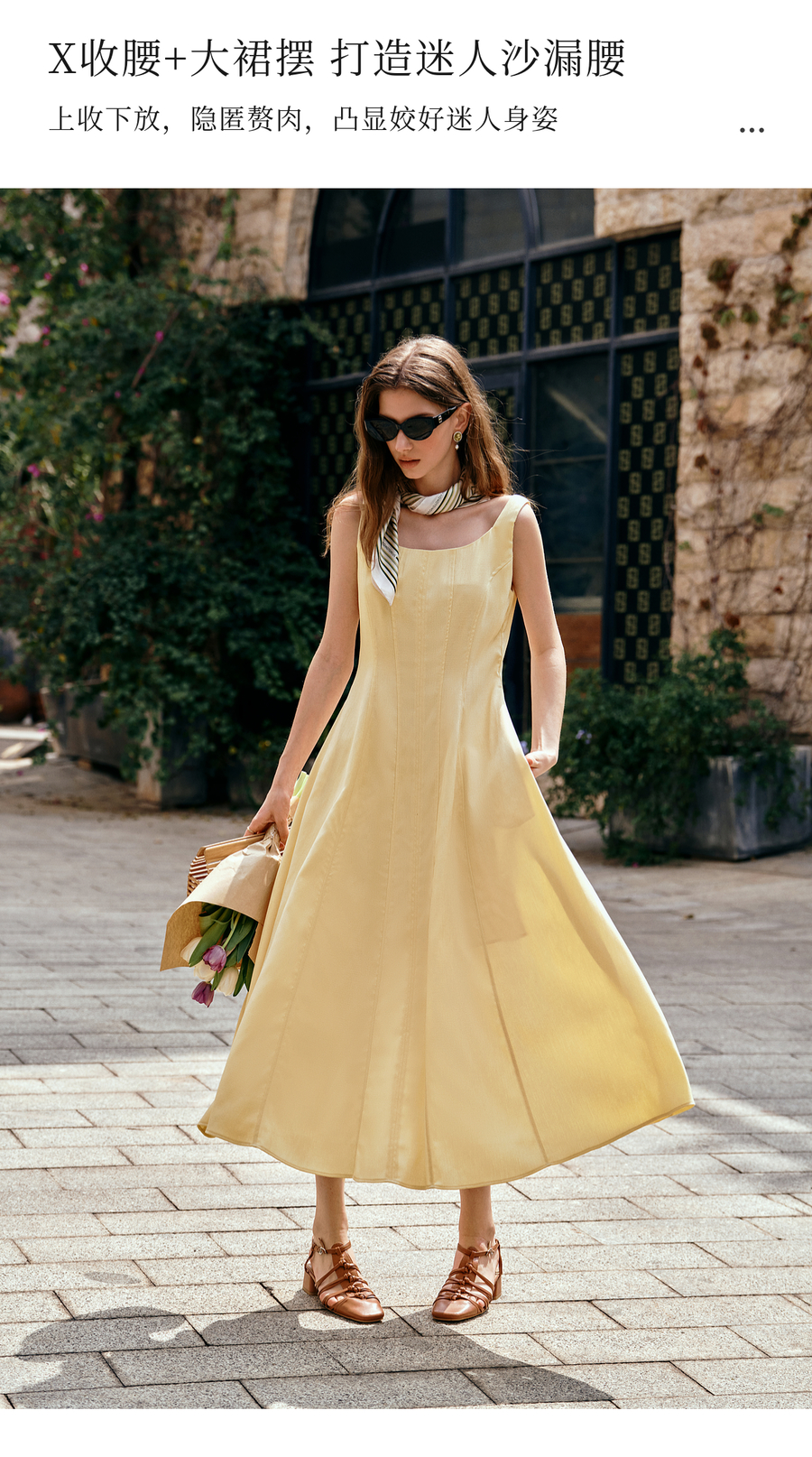 OLrain欧芮儿黄色方领背心连衣裙女夏季2025新款收腰显瘦气质长裙