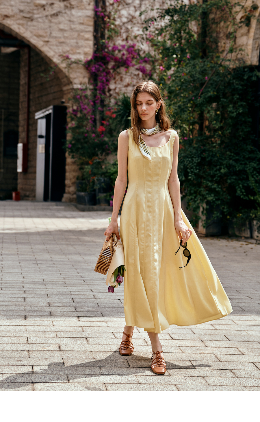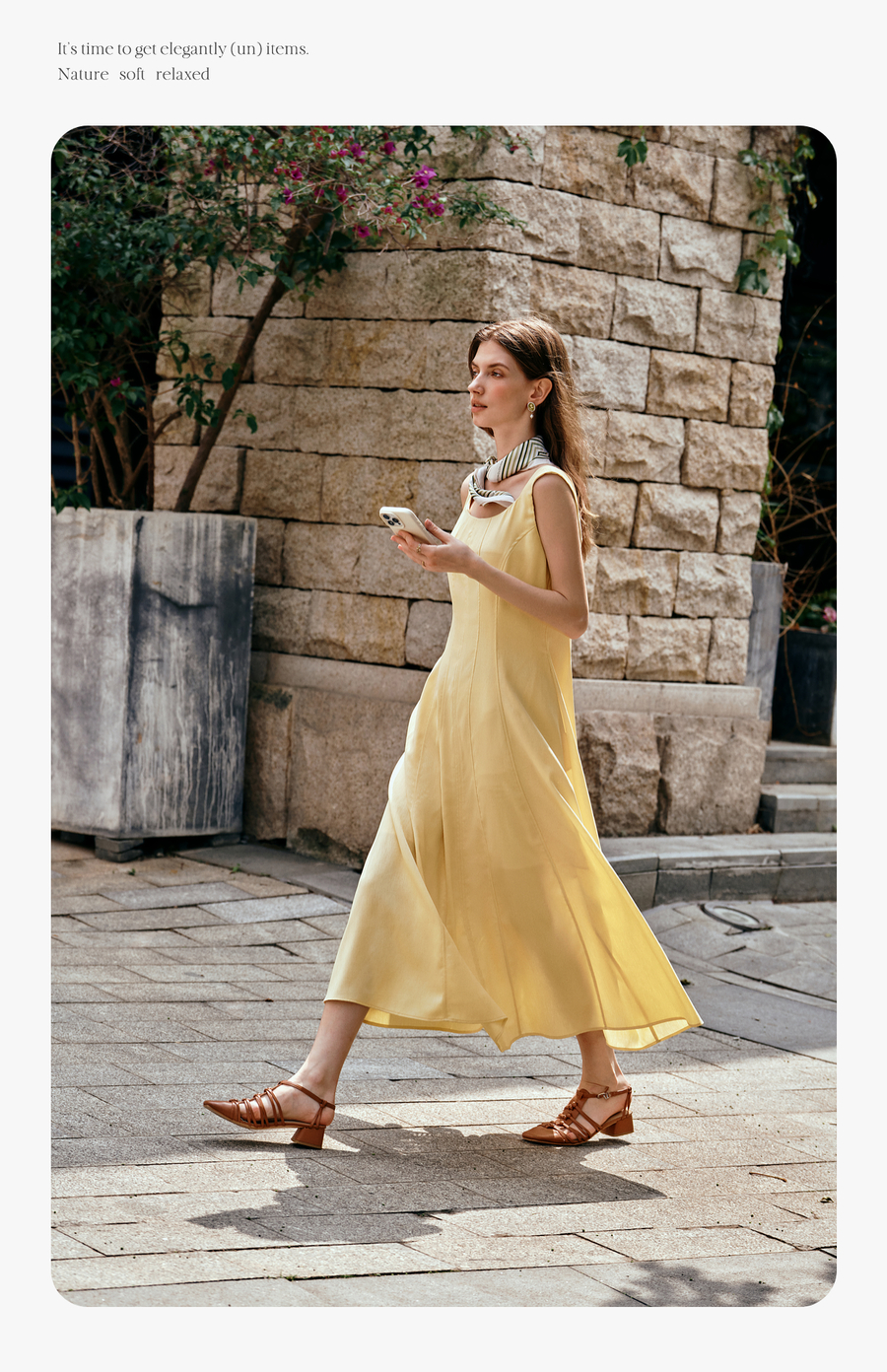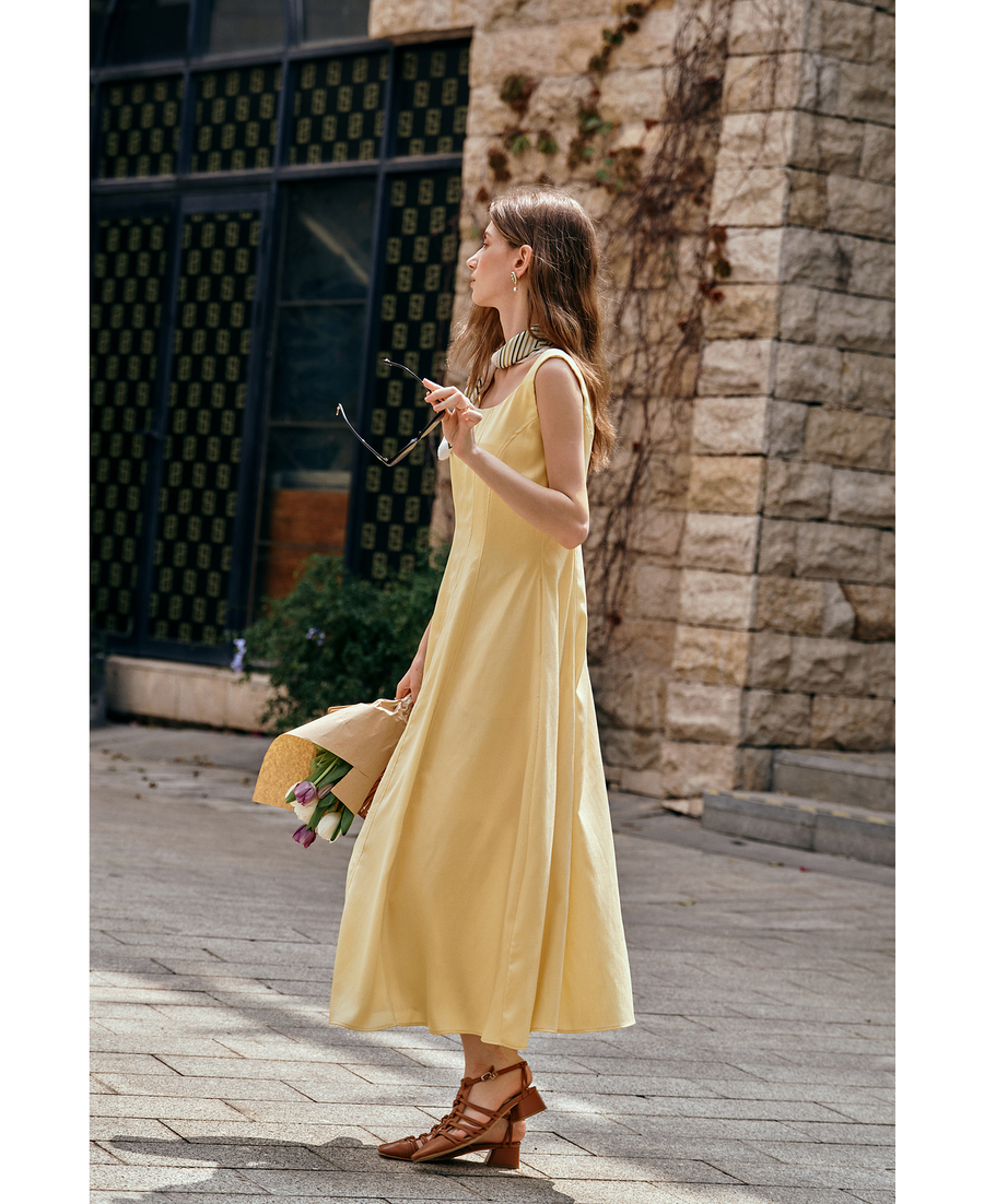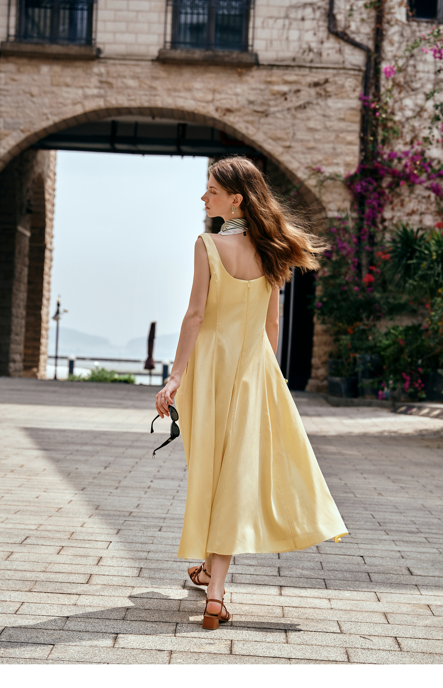 OLrain欧芮儿黄色方领背心连衣裙女夏季2025新款收腰显瘦气质长裙