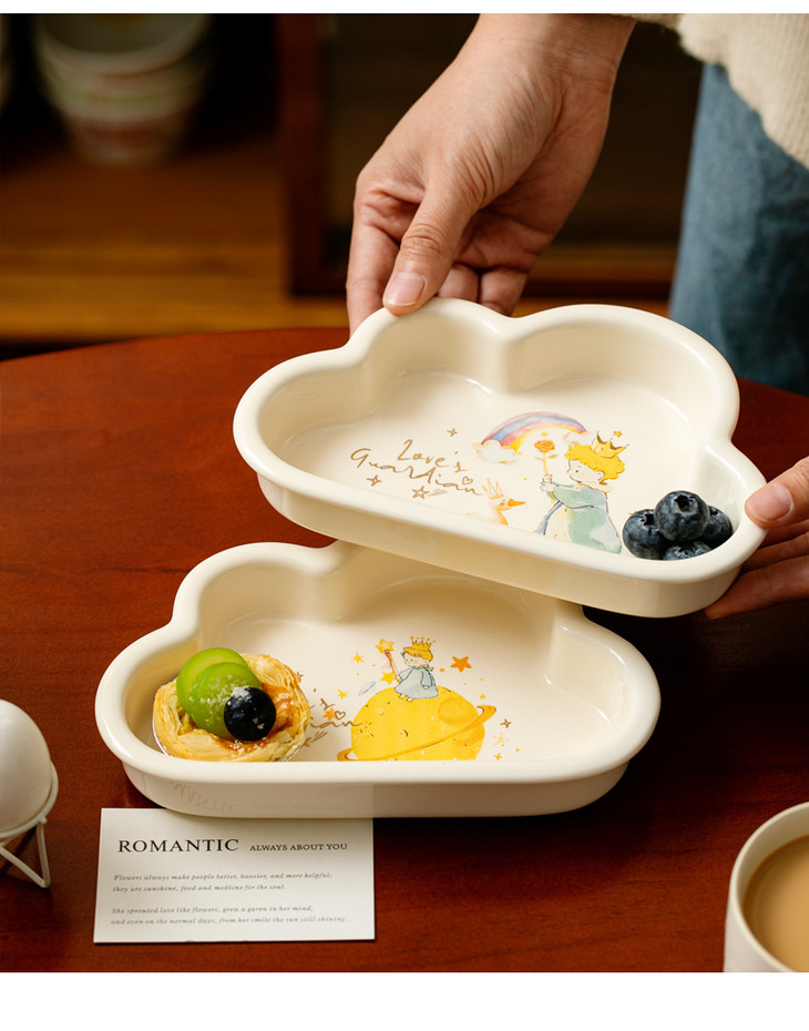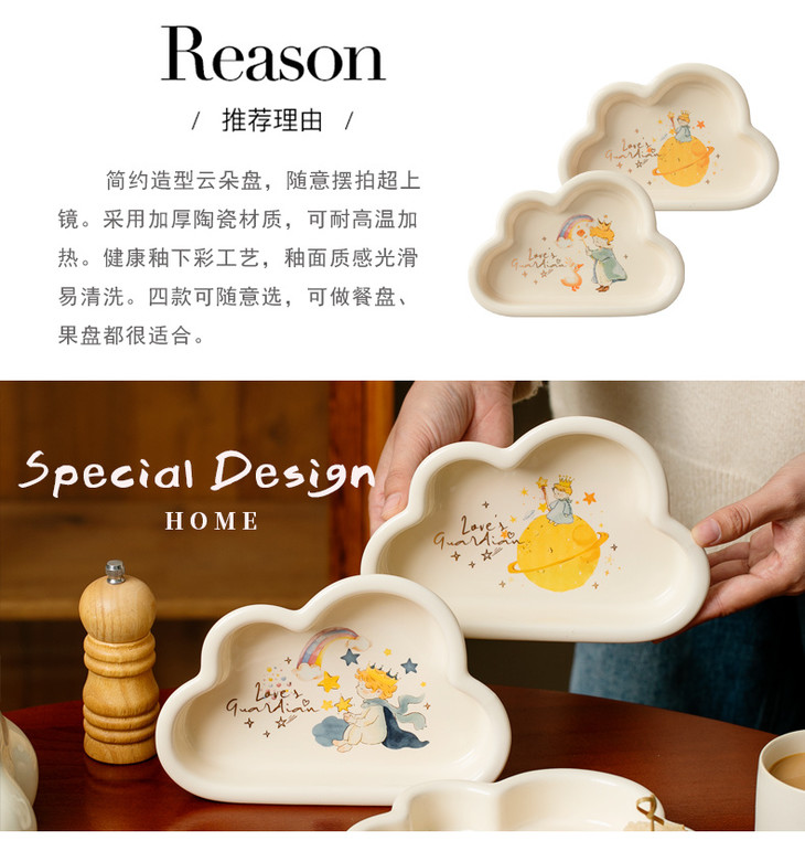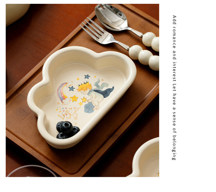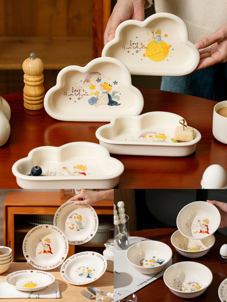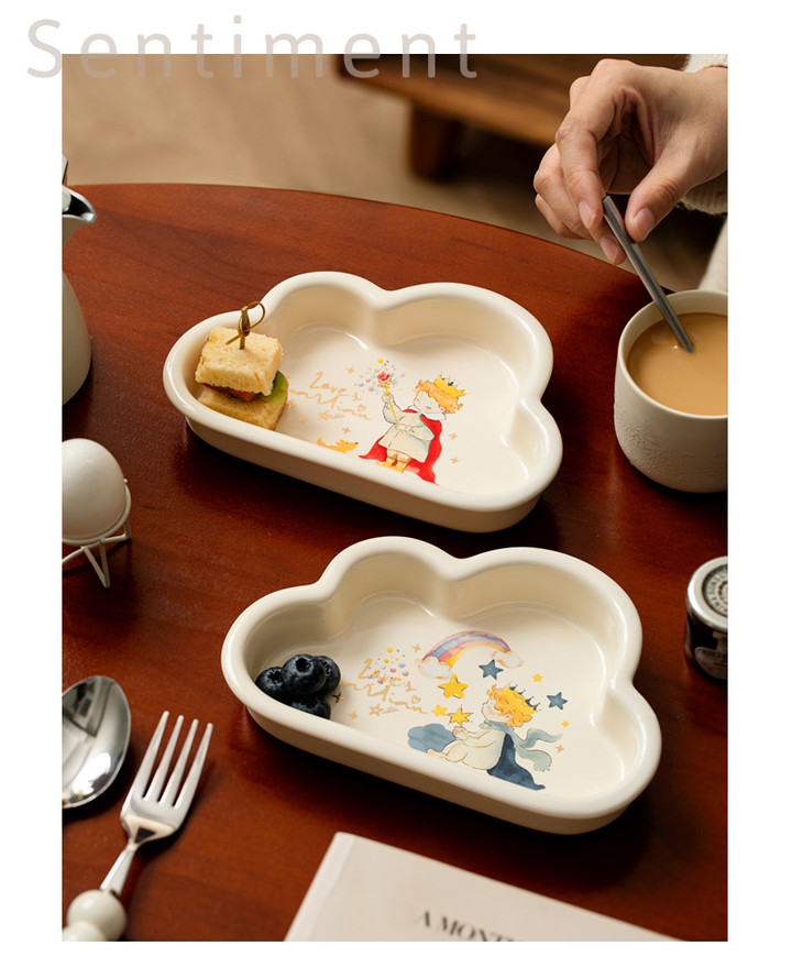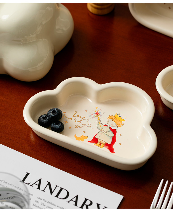 款式四:【小王子系列-云朵盘一个】 与小王子的联名,精致可爱 童话满满的小物件,给生活增添许多幸福感 颜值高,实用性强,用这么美的餐具吃饭 探索星辰的小王子,惊起的群鸟,孤独星球 将小王子离开B-612星球后的故事制作成了云朵盘 用它们来盛放甜品或意面,光看着就让人食指大动