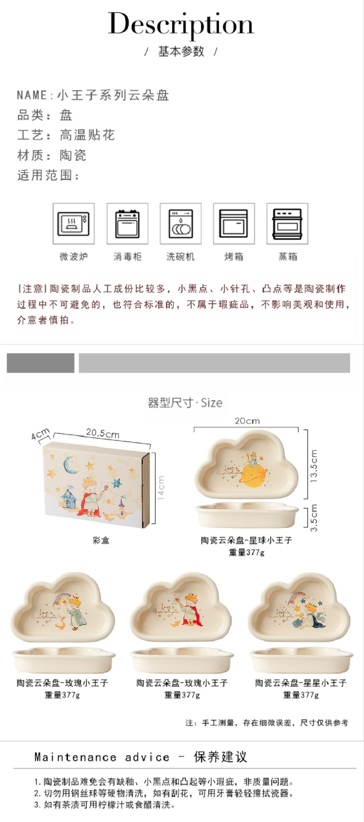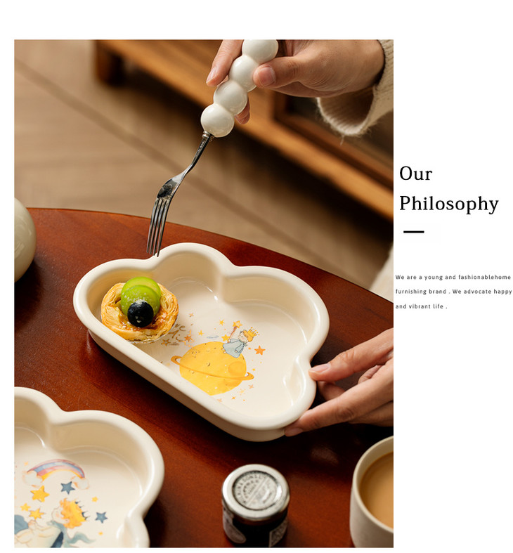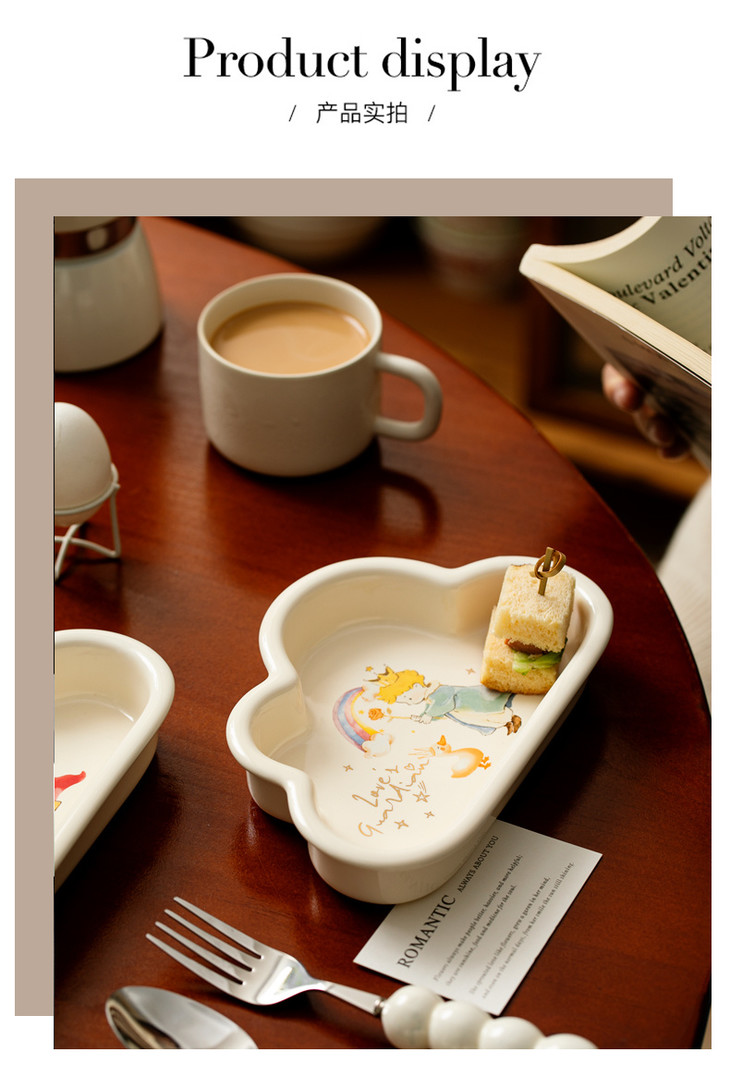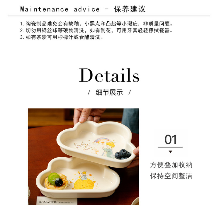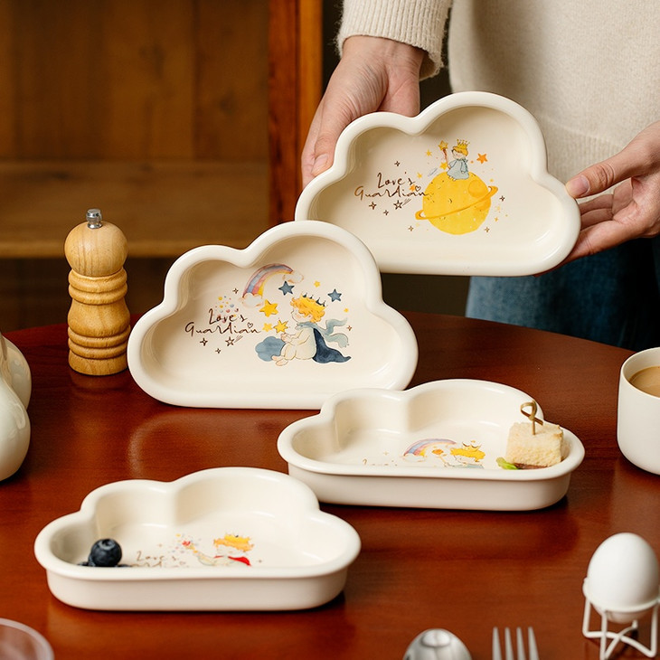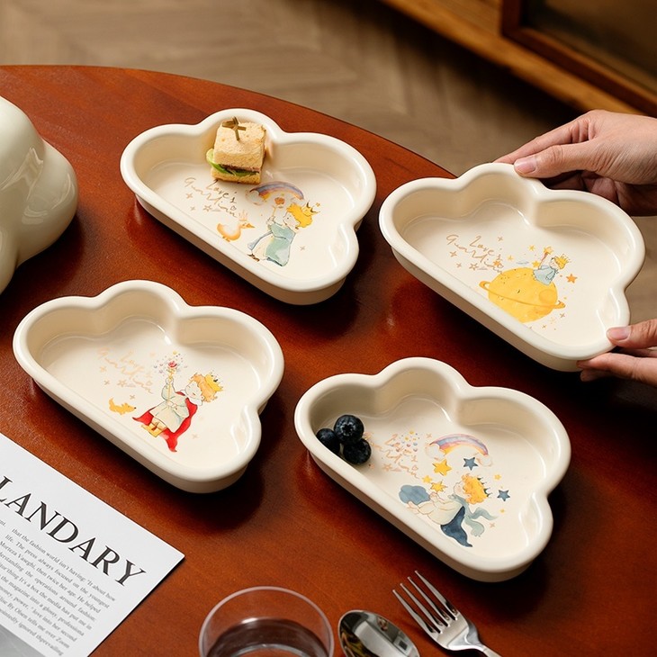 款式四:【小王子系列-云朵盘一个】 与小王子的联名,精致可爱 童话满满的小物件,给生活增添许多幸福感 颜值高,实用性强,用这么美的餐具吃饭 探索星辰的小王子,惊起的群鸟,孤独星球 将小王子离开B-612星球后的故事制作成了云朵盘 用它们来盛放甜品或意面,光看着就让人食指大动