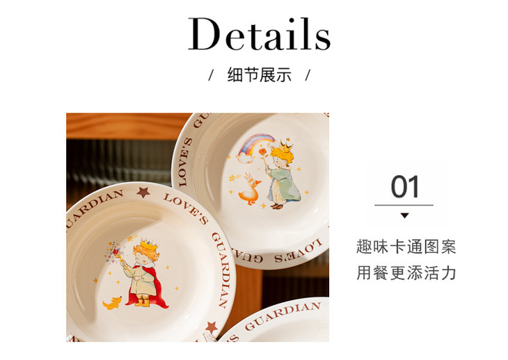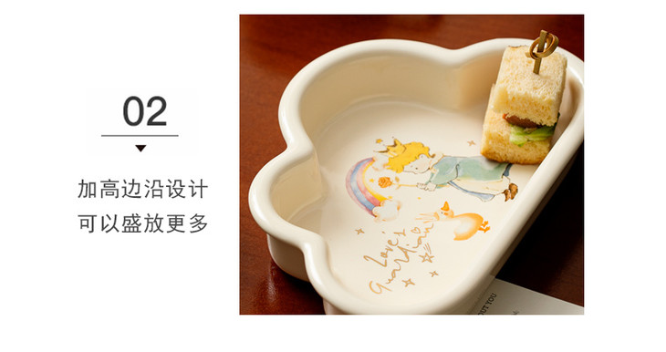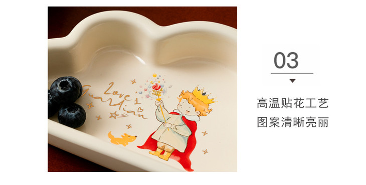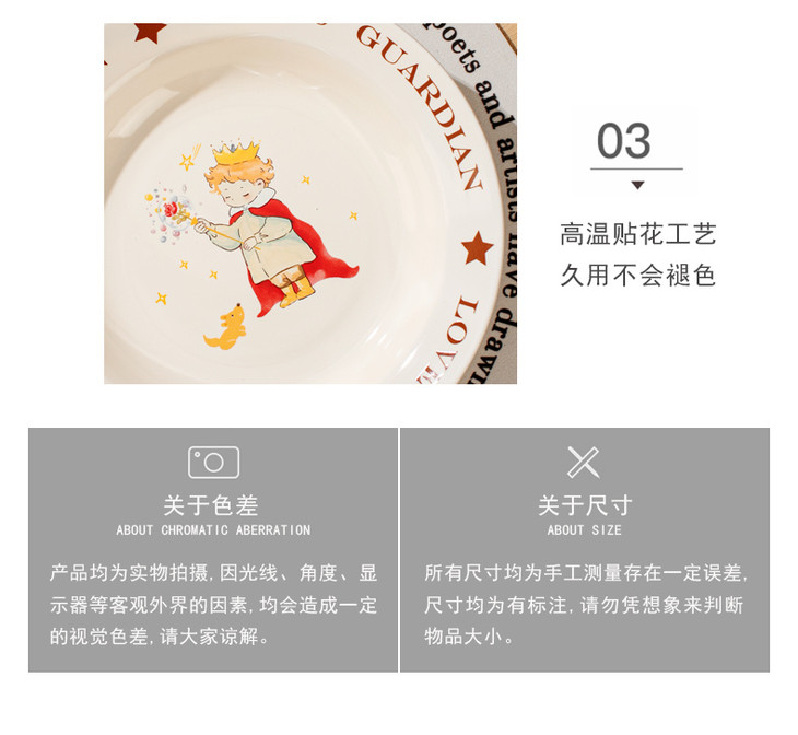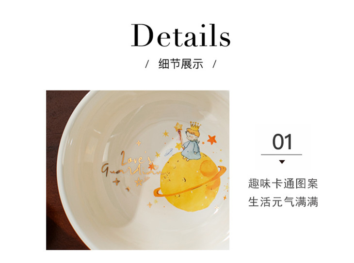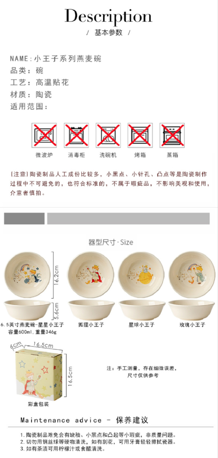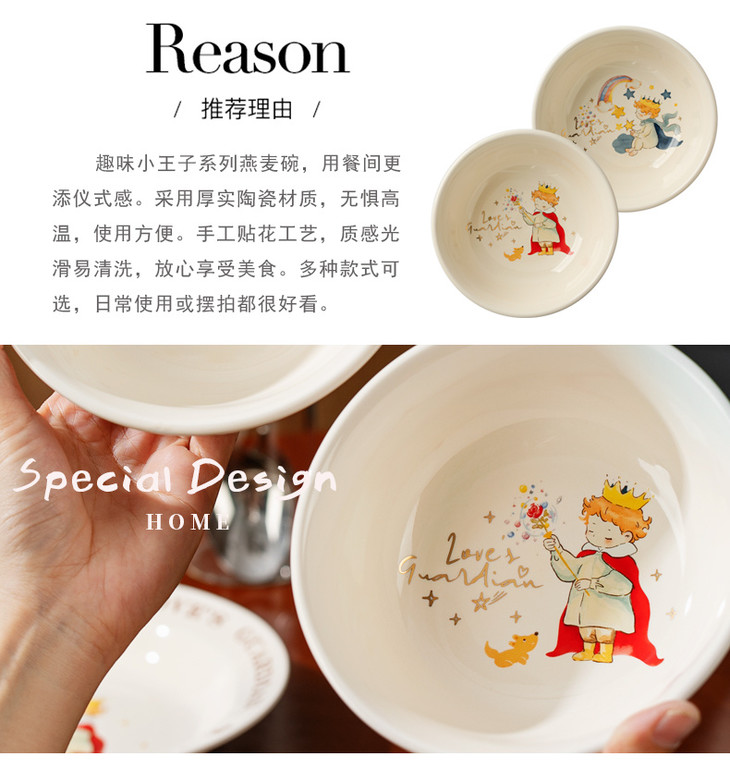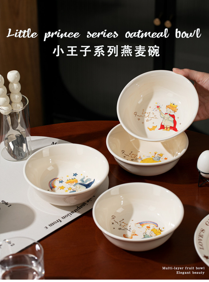 款式二:【小王子系列-6.5英寸燕麦碗一个】 碗上上印着小王子的经典图案 细腻的笔触和温暖的色彩 让人仿佛置身于小王子的星球 餐盘采用优质的陶瓷材质,质感细腻,坚固耐用 燕麦碗的设计非常适合盛放水果、沙拉等冷食 让你的美食更加精致