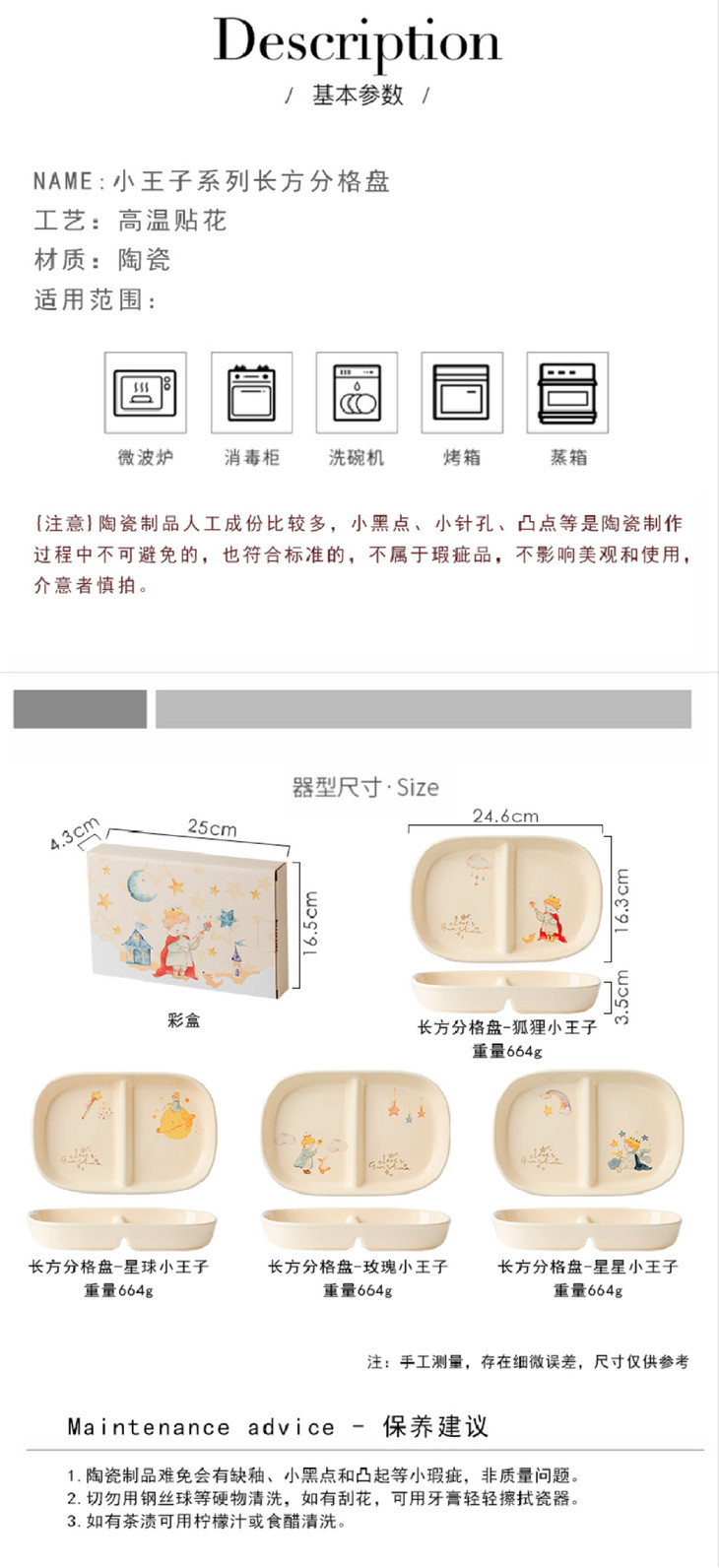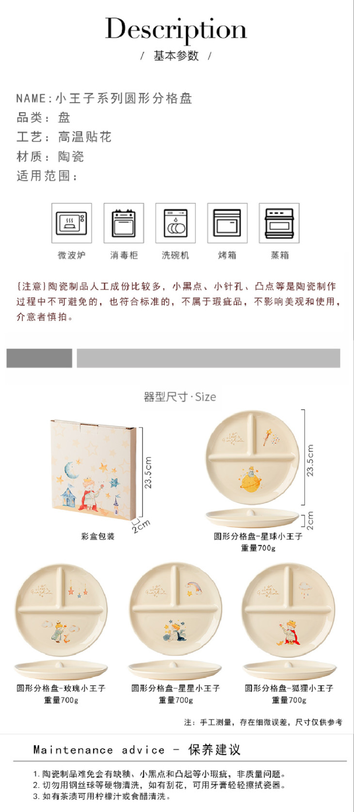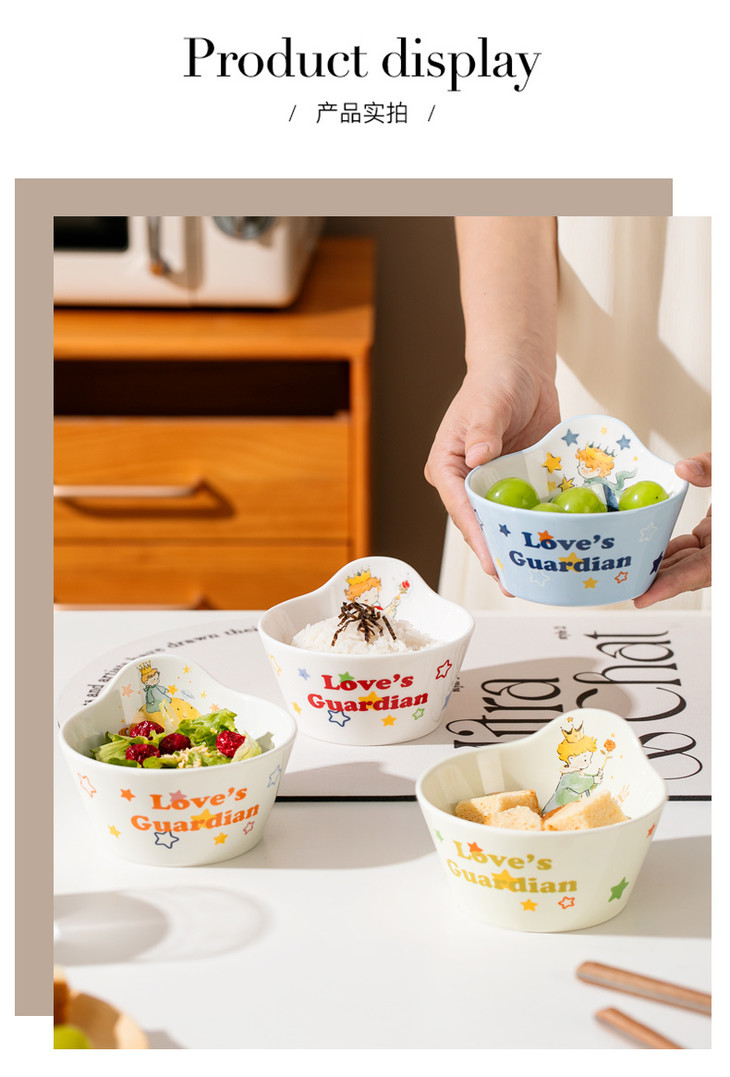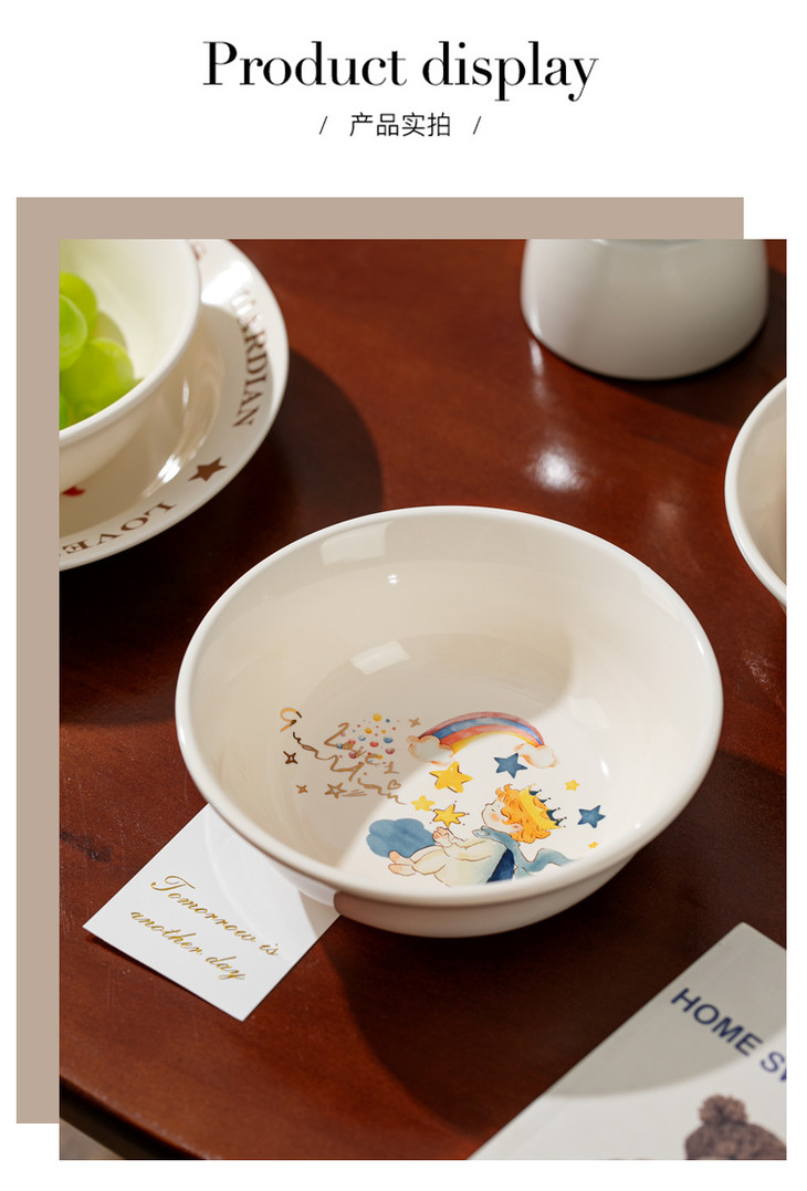 款式二:【小王子系列-6.5英寸燕麦碗一个】 碗上上印着小王子的经典图案 细腻的笔触和温暖的色彩 让人仿佛置身于小王子的星球 餐盘采用优质的陶瓷材质,质感细腻,坚固耐用 燕麦碗的设计非常适合盛放水果、沙拉等冷食 让你的美食更加精致