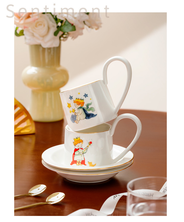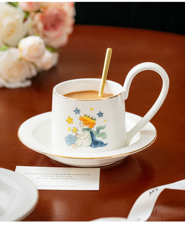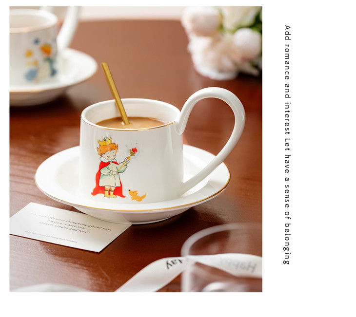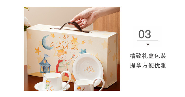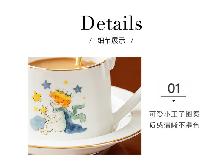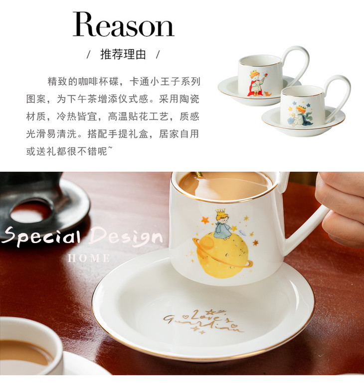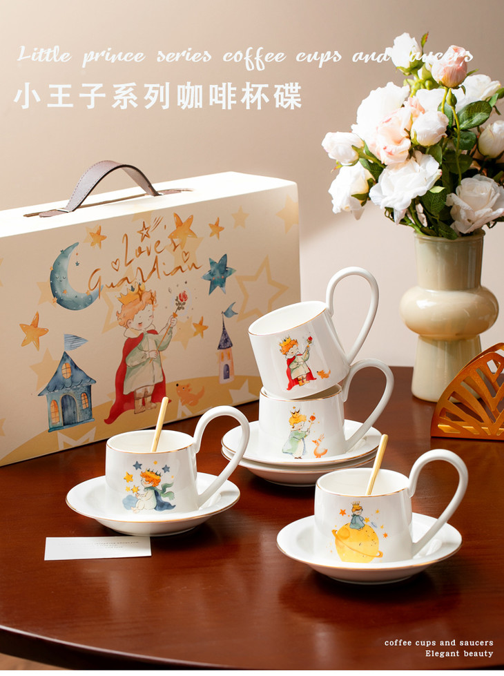 款式七:【小王子系列-咖啡杯碟套装】 被小王子治愈的成年人,才懂这只杯子的浪漫 杯身彩绘小王子与玫瑰金边 把手弧度贴合掌心,像握住B612星球 图案就是经典的小王子、狐狸和玫瑰花 金色镶边,非常精致,质感也很好 喝咖啡或者泡茶都可以~喜欢!!!