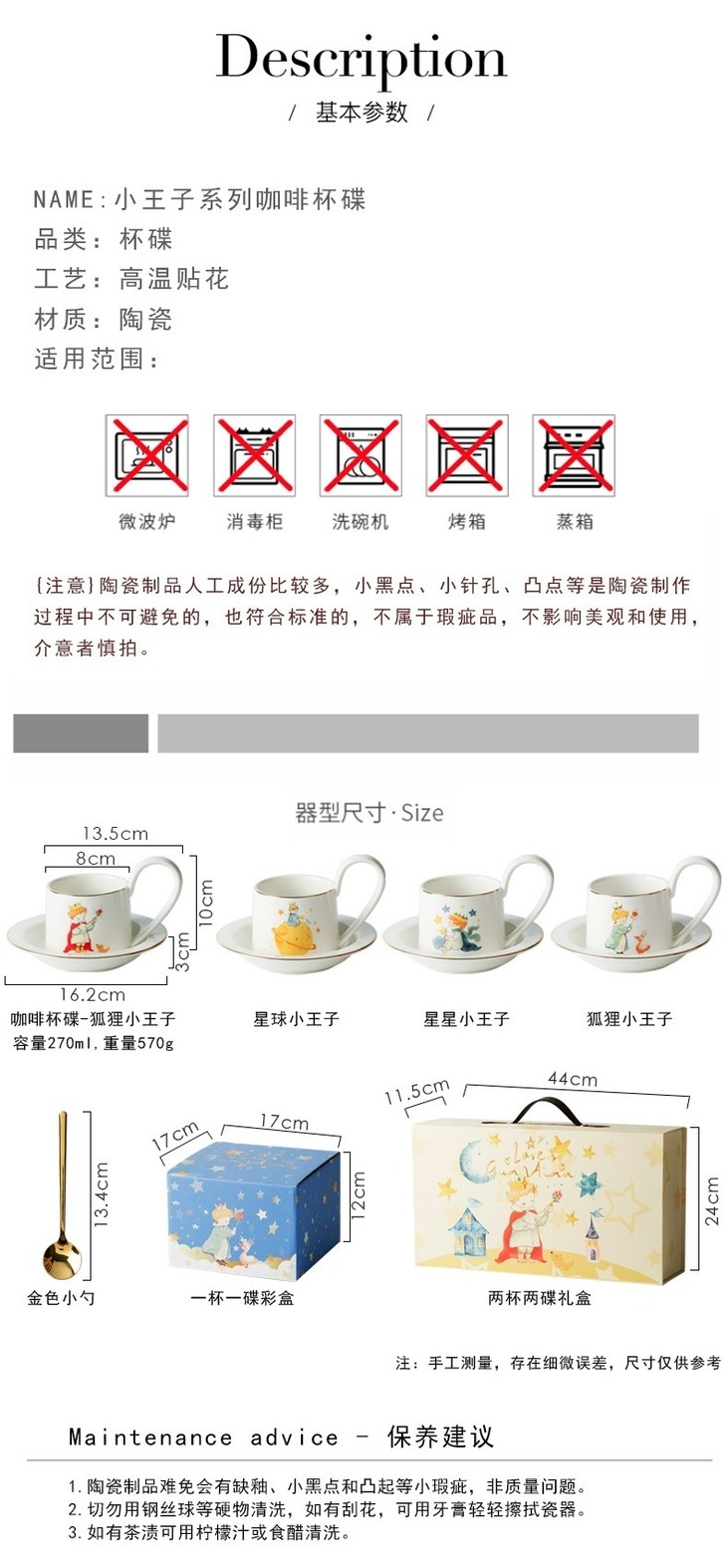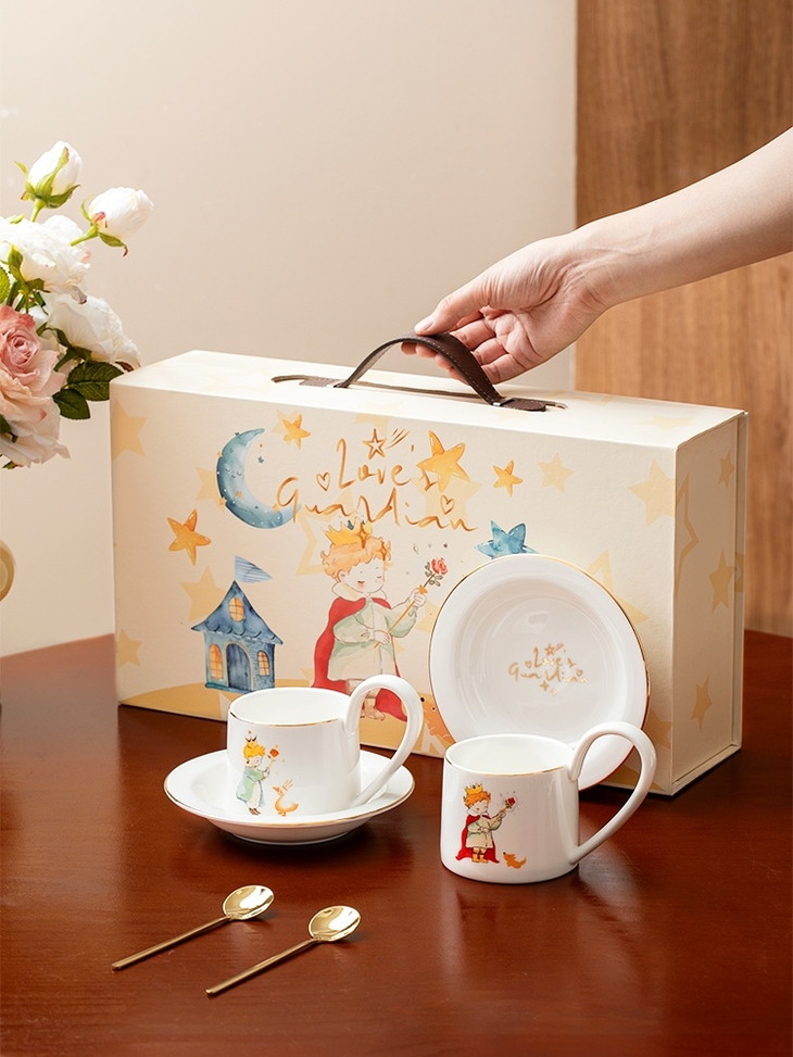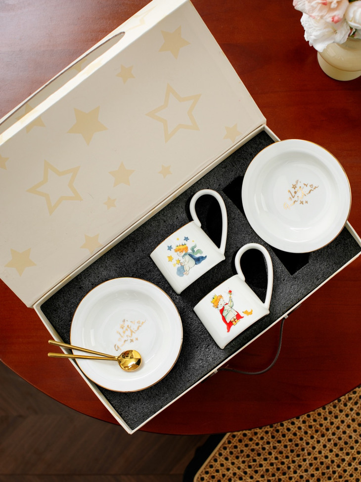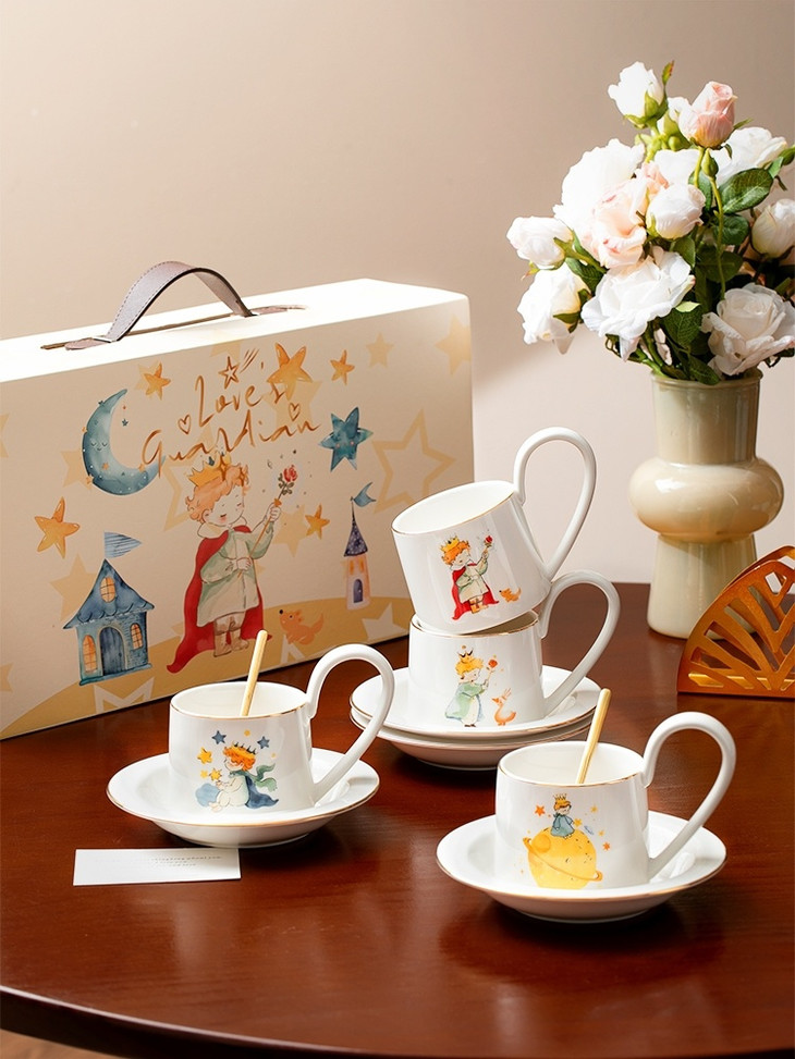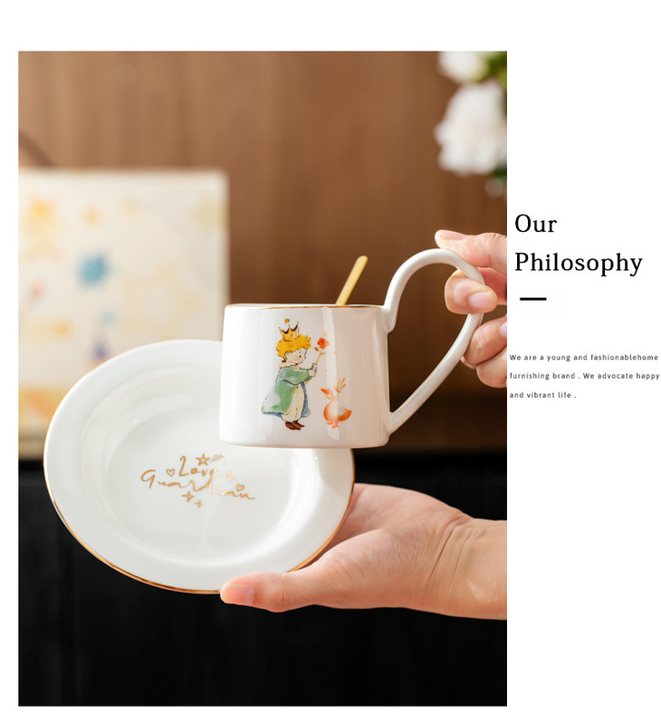 款式七:【小王子系列-咖啡杯碟套装】 被小王子治愈的成年人,才懂这只杯子的浪漫 杯身彩绘小王子与玫瑰金边 把手弧度贴合掌心,像握住B612星球 图案就是经典的小王子、狐狸和玫瑰花 金色镶边,非常精致,质感也很好 喝咖啡或者泡茶都可以~喜欢!!!