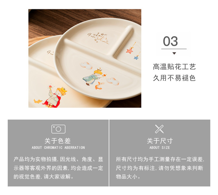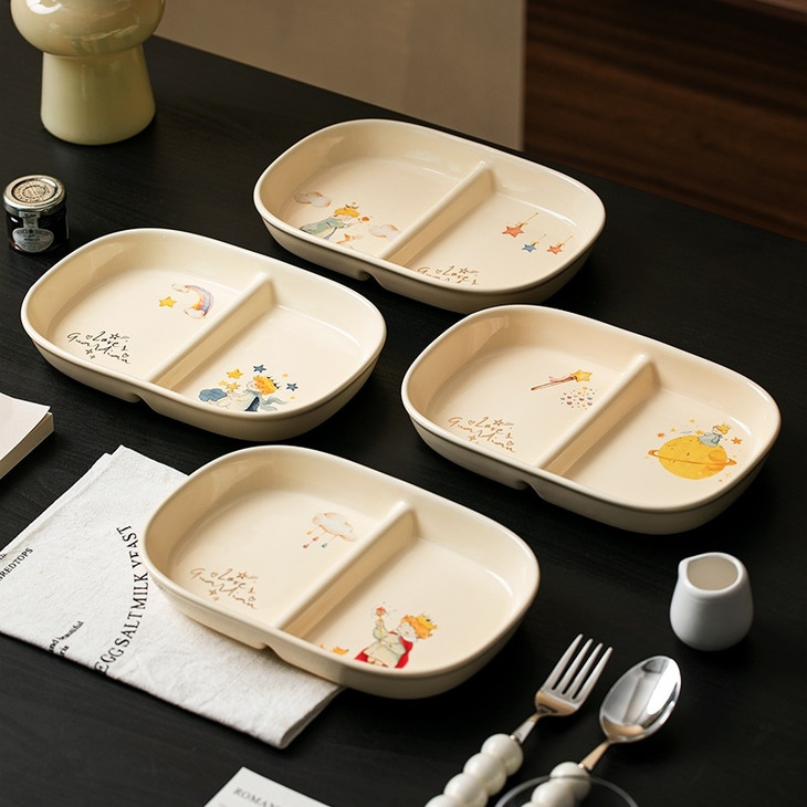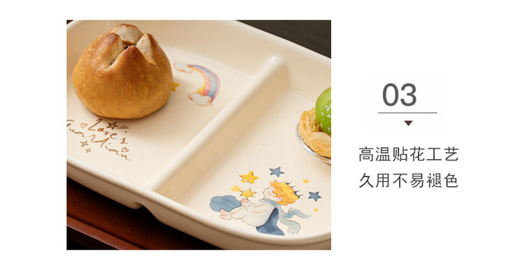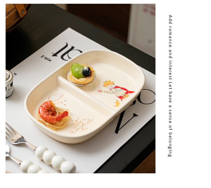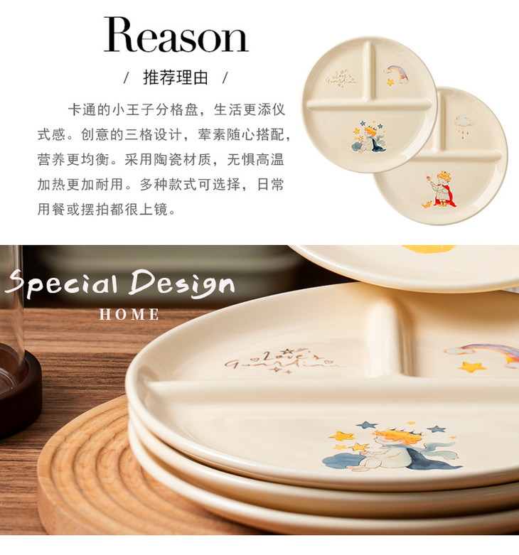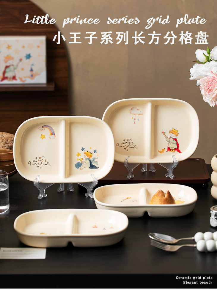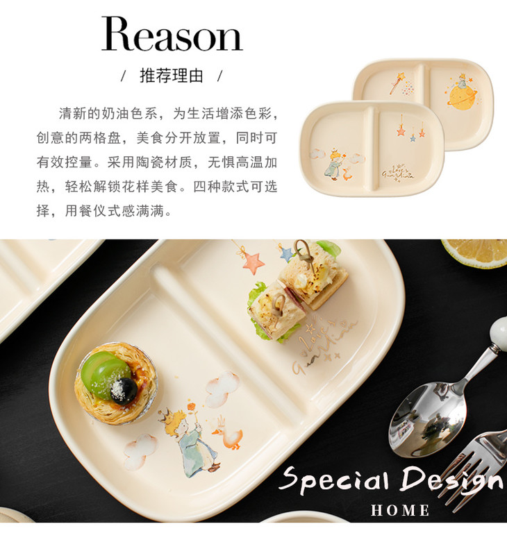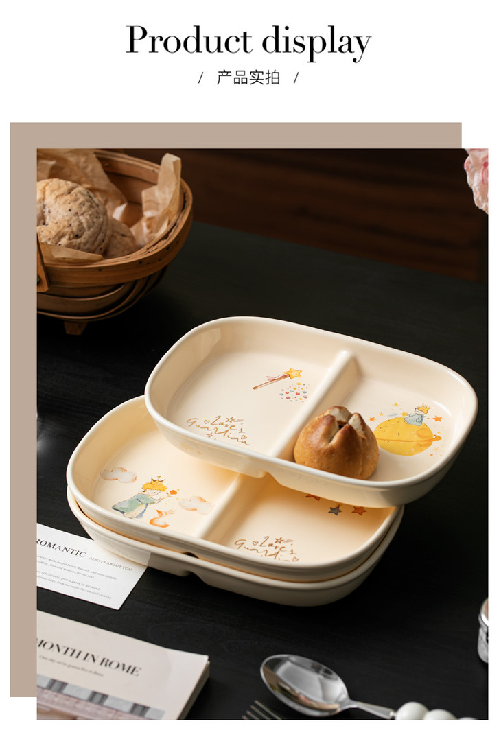 款式五:【小王子系列-减脂餐盘方形一个】 餐盘上的小王子元素如梦如幻 仿佛把我们带入了那个充满奇思妙想的童话世界 创意分格设计,科学配比膳食 元气满满,为美食加分,为餐桌增添色彩 普通食物变美丽,减肥姐妹必须冲