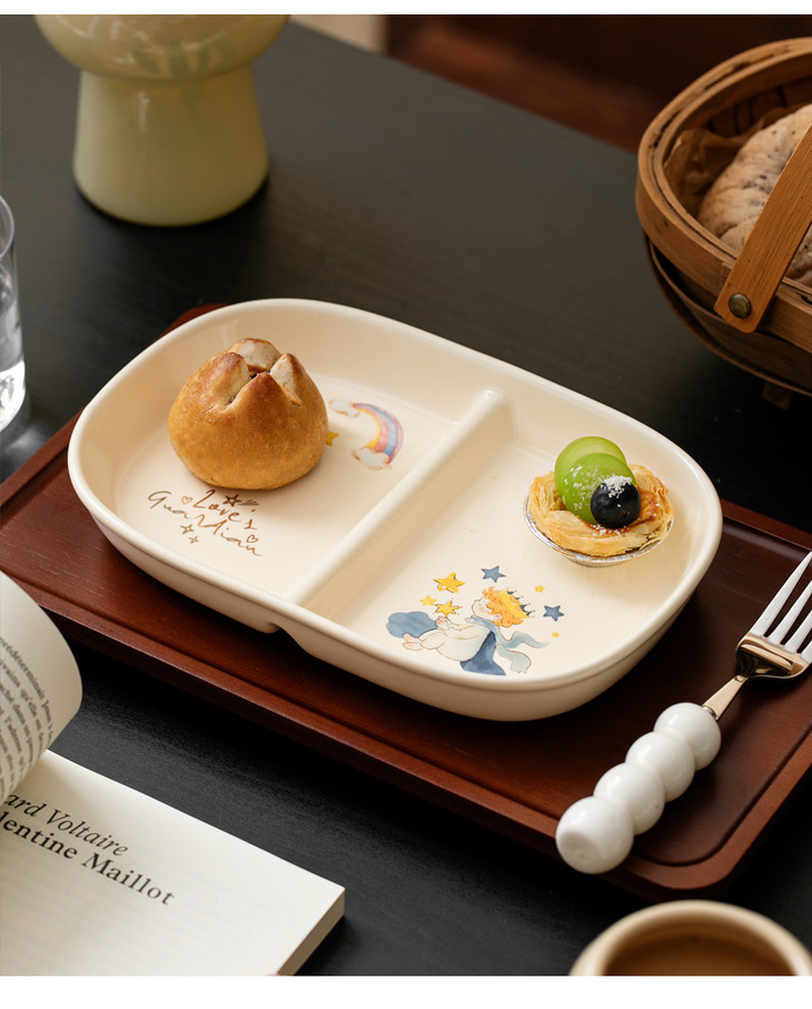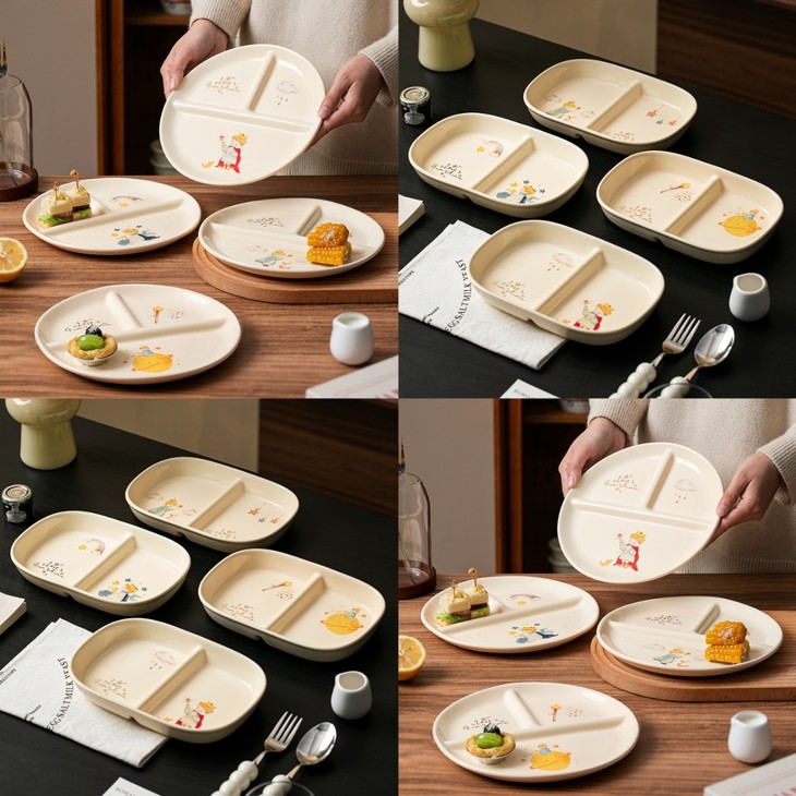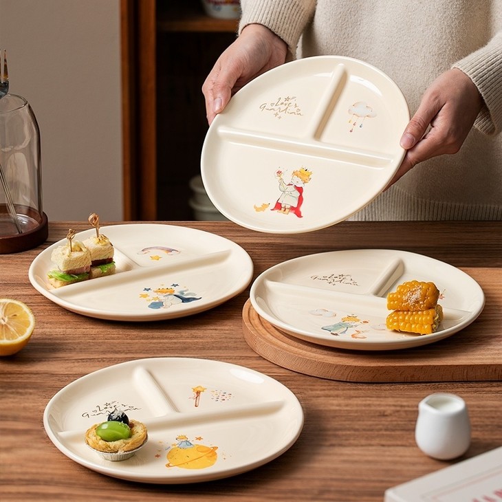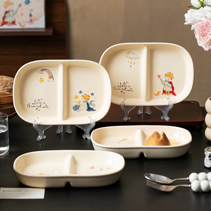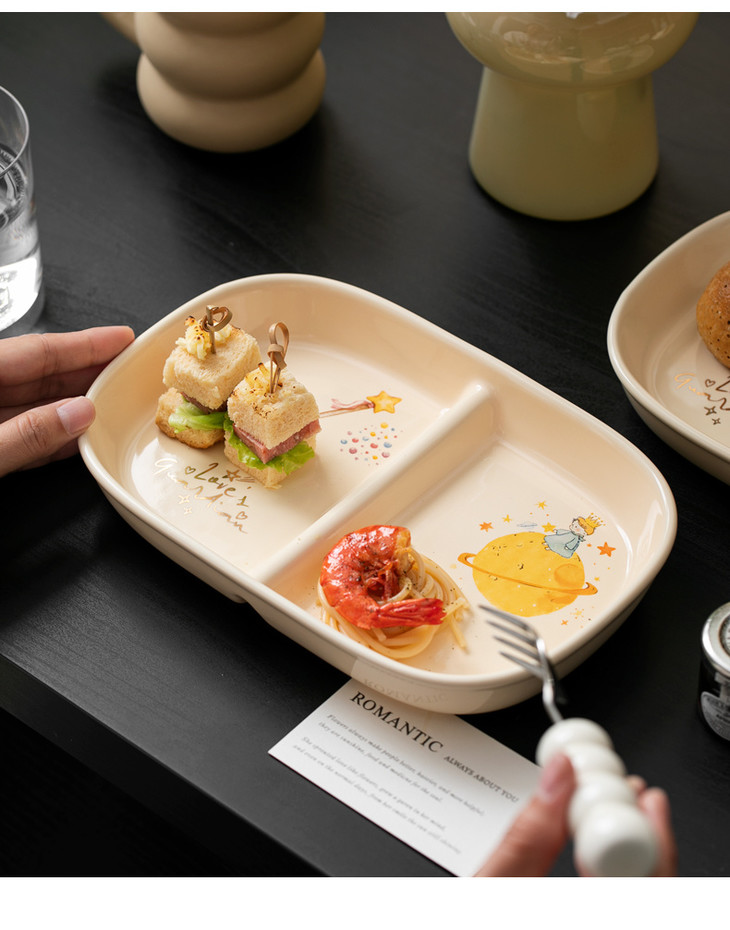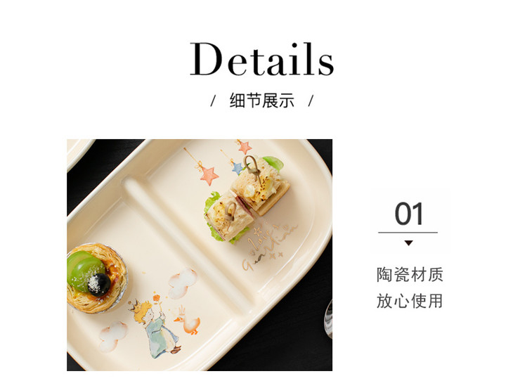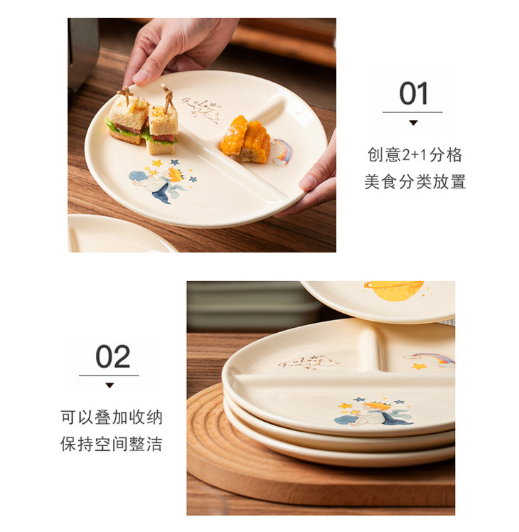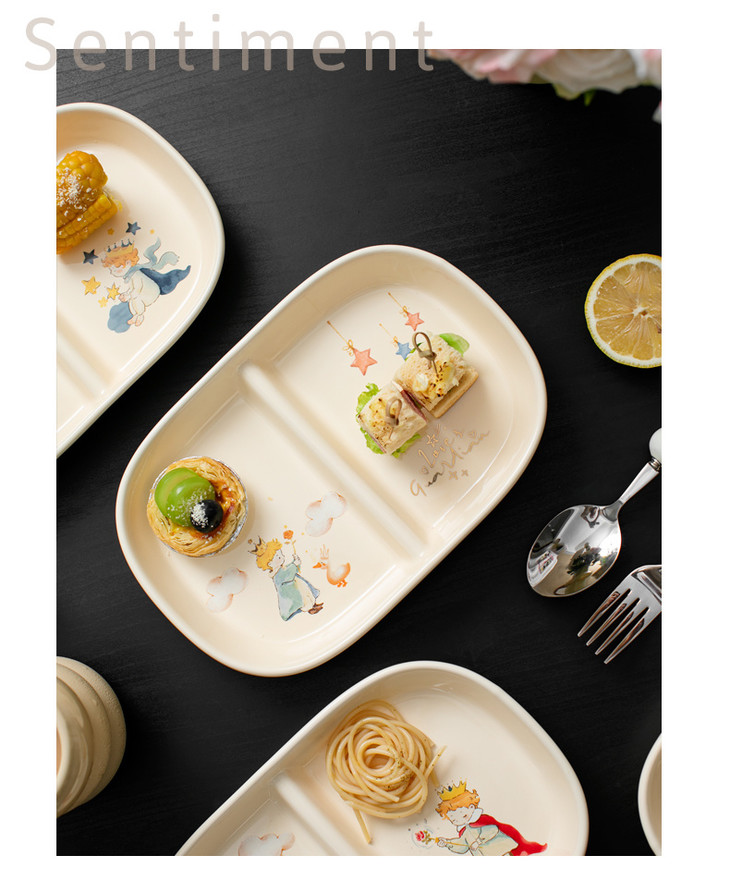 款式五:【小王子系列-减脂餐盘方形一个】 餐盘上的小王子元素如梦如幻 仿佛把我们带入了那个充满奇思妙想的童话世界 创意分格设计,科学配比膳食 元气满满,为美食加分,为餐桌增添色彩 普通食物变美丽,减肥姐妹必须冲