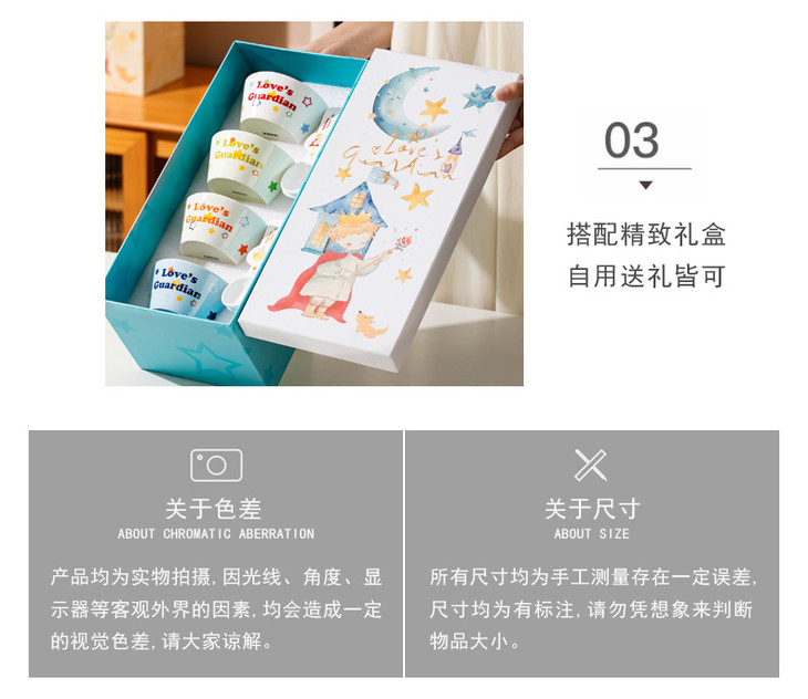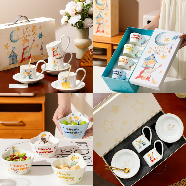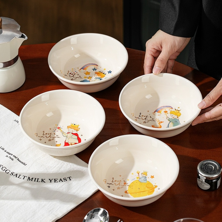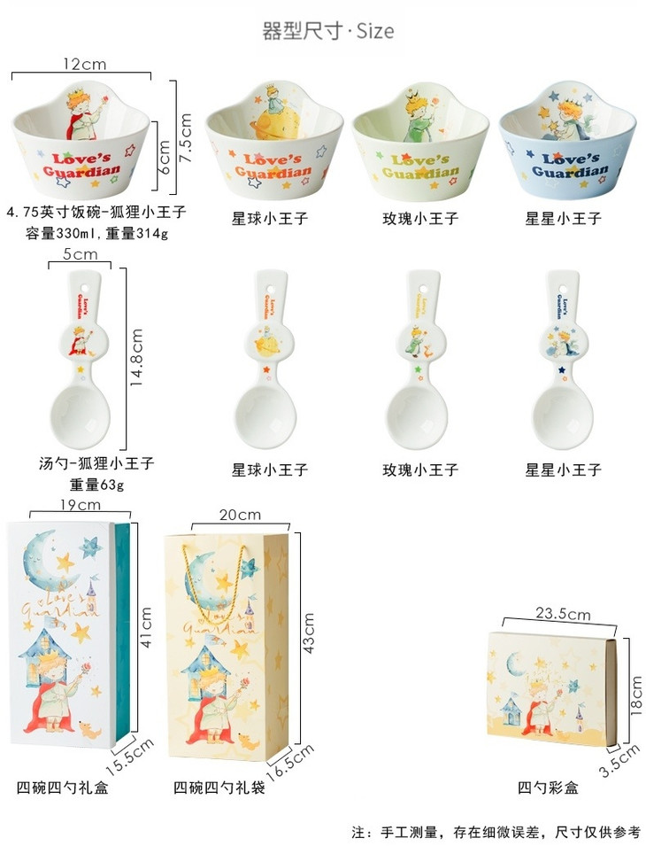 四件套装满足各种用餐需求 既可以盛放美食,又能作为餐桌上的装饰 为生活增添一份浪漫与温馨 规格:星星小王子;狐狸小王子;星球小王子;玫瑰小王子