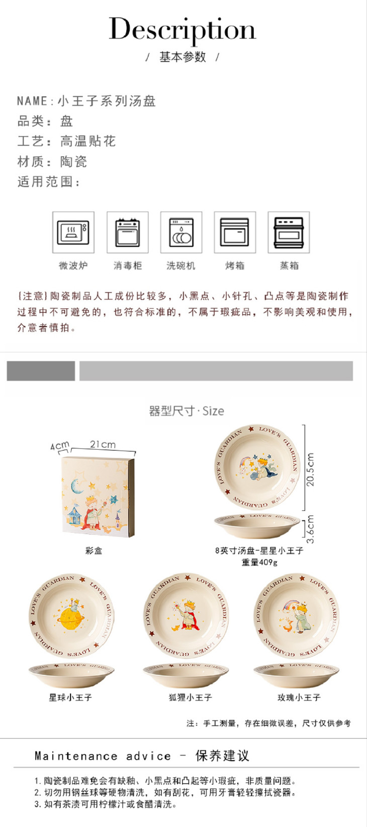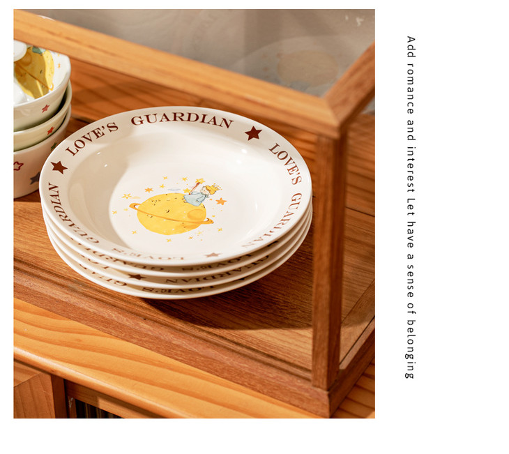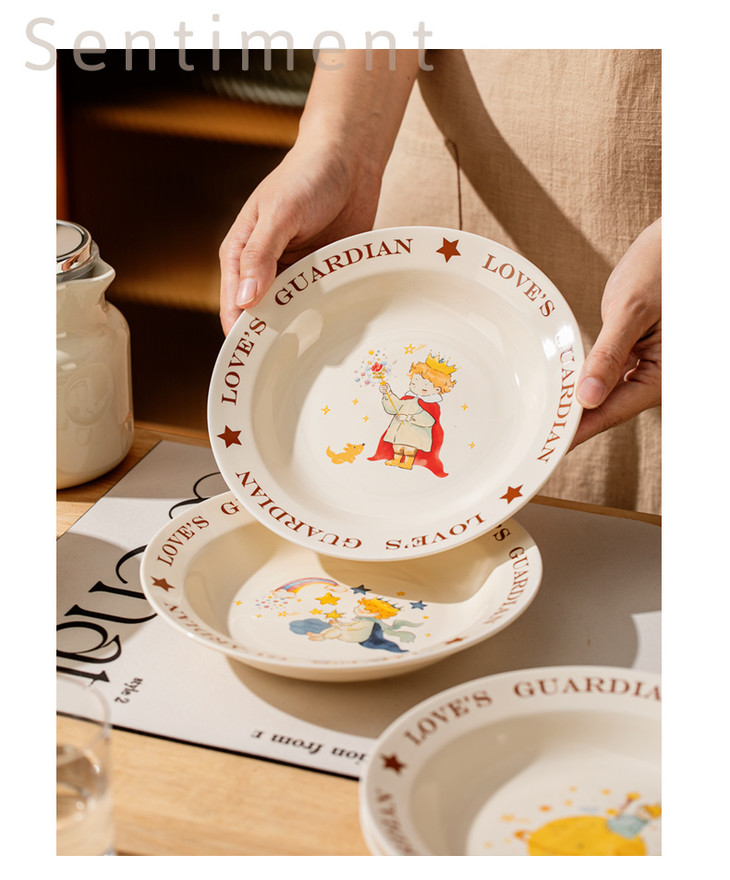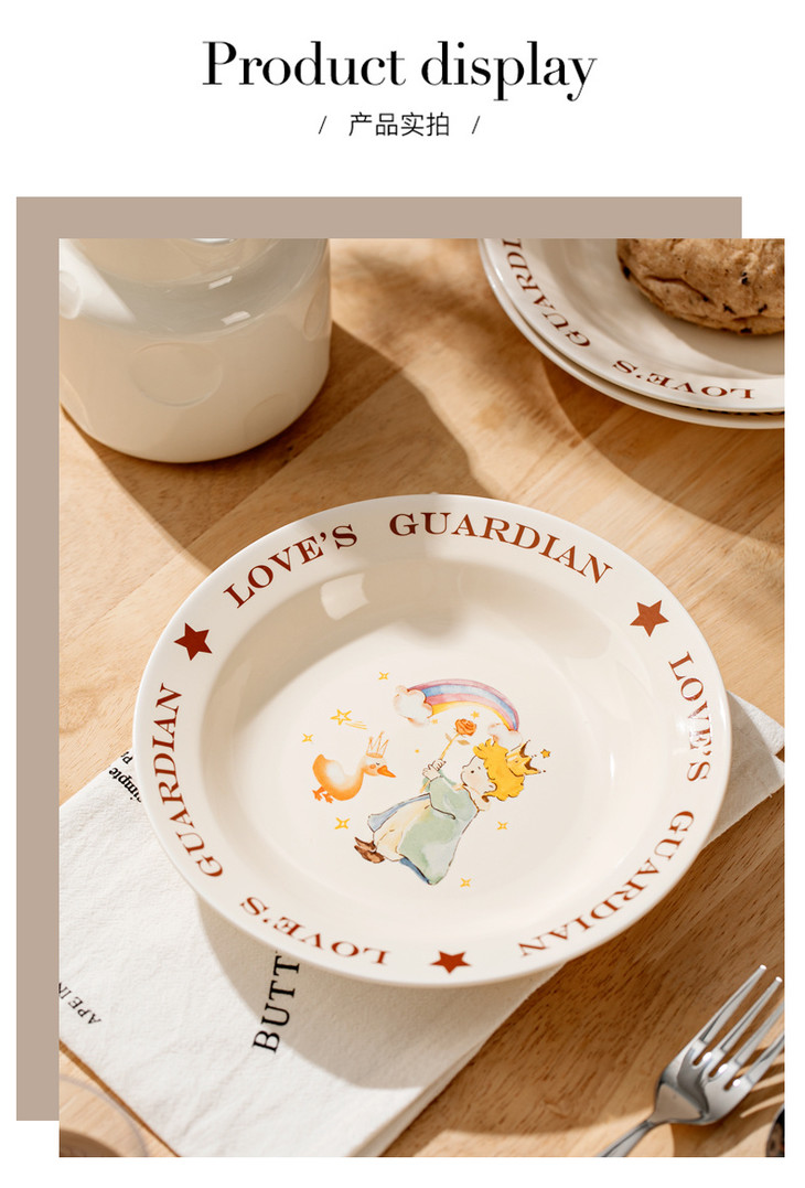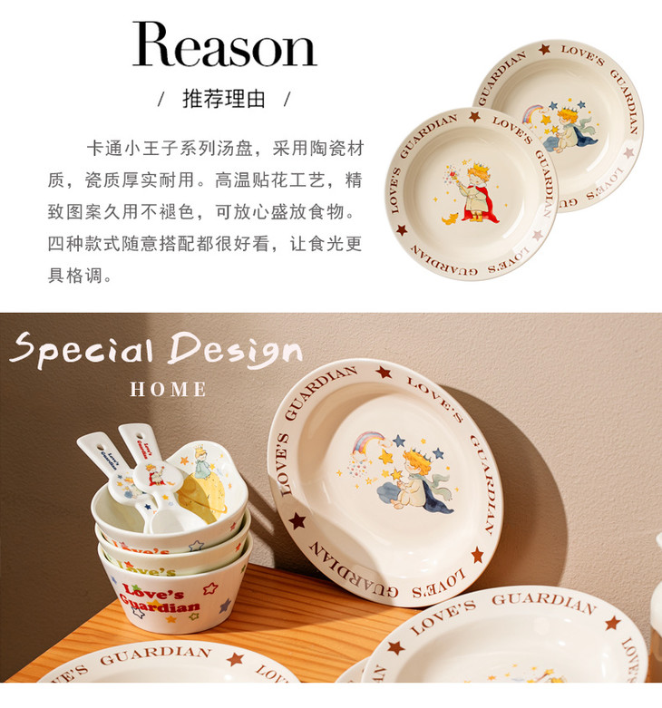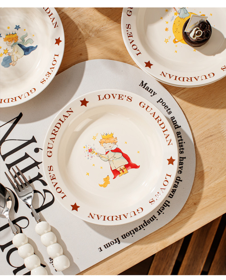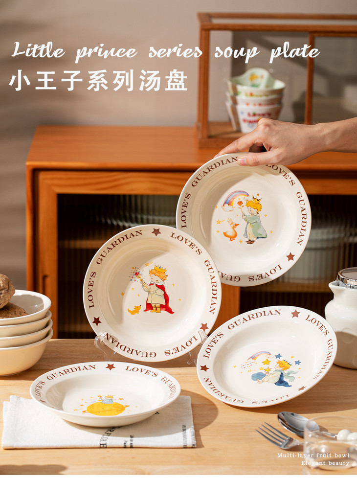 款式三:【小王子系列-8英寸汤盘一个】 把小王子的浪漫送给你! 小王子汤盘礼盒真的好浪漫~实用又有创意! 餐盘上的小王子图案栩栩如生 细腻的陶瓷材质,质感十足 用这样的餐盘用餐,仿佛置身于童话世界中
