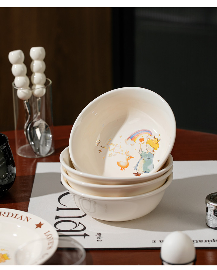 家居好物也能拥有治愈全宇宙的温柔 一日三餐,吃的是食物滋味,也是生活仪式 复古的白瓷碗盘,简约线条小王子插画 配上小王子和玫瑰的logo 一圈简约英文点缀,和美好食光绝配 陶瓷的材质,细腻光滑,质感十足 每一个餐具都仿佛在诉说着一个温暖的故事