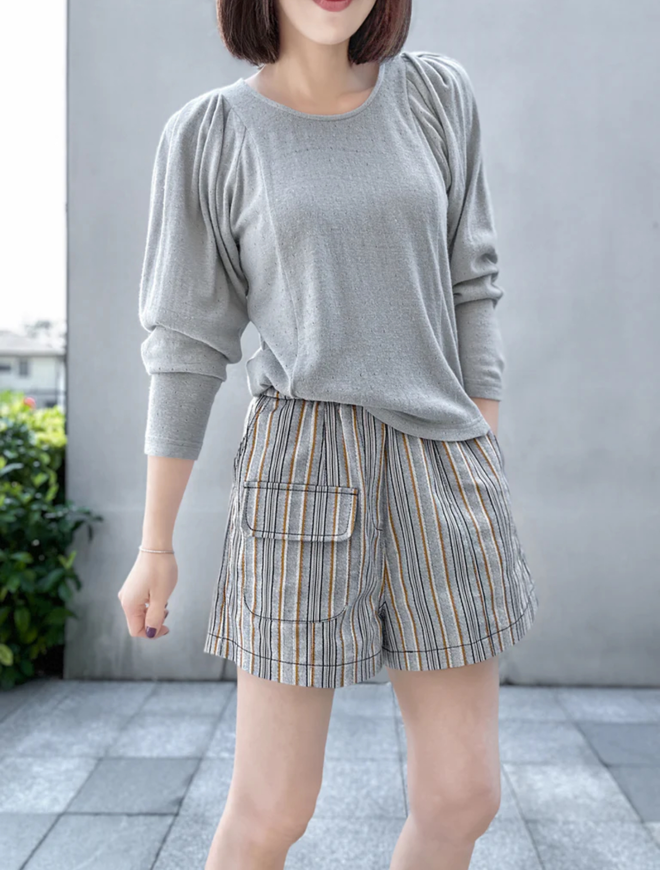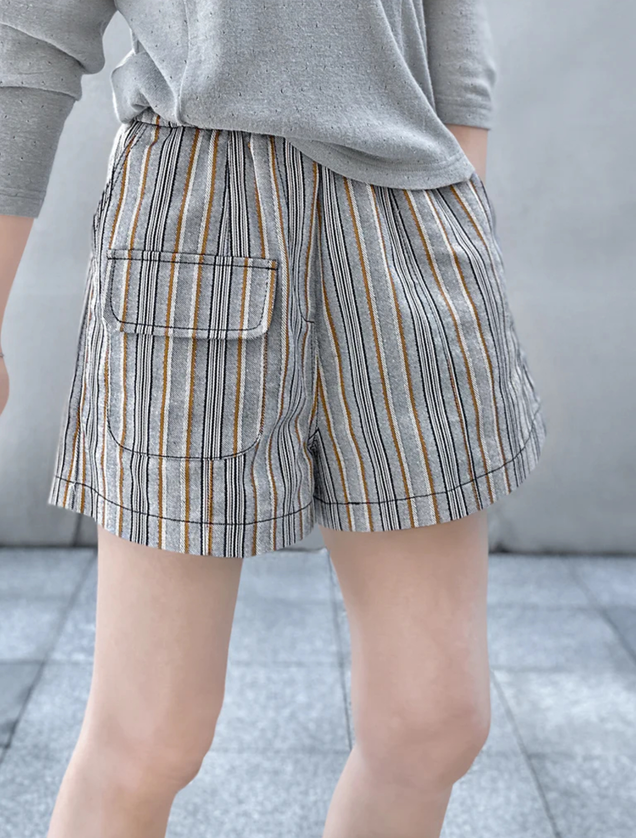 TYNVIE 明线松紧腰休闲短裤-灰条纹