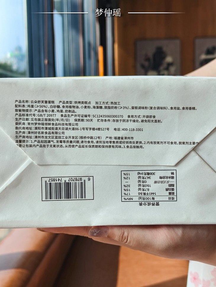 【成分/配料】鸡蛋(≥56%)、白砂糖、食用植物油、小麦粉、海藻糖、脱脂奶粉(≥3%)、蛋糕调味粉(复合调味料)、食用盐、食用香精。