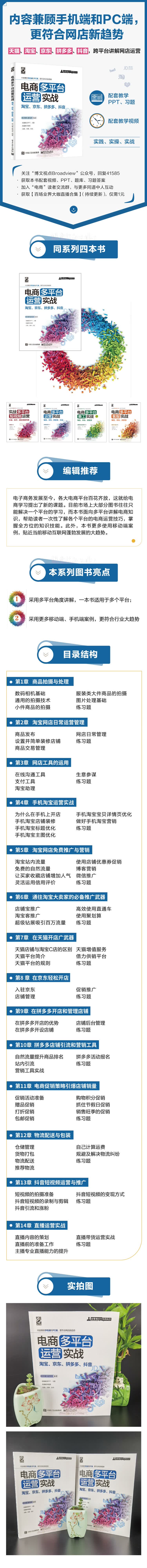 电子商务发展至今,各大电商平台百花齐放,这就给电商学习提出了新的课题。目前市场上大部分图书往往只能解决一个平台的学习,而本书面向多平台讲解电商知识,帮助读者一次性了解各个平台的电商运营技巧,掌握全方位的知识技能。此外,本书更多使用移动端案例,贴近当前移动互联网蓬勃发展的大趋势。