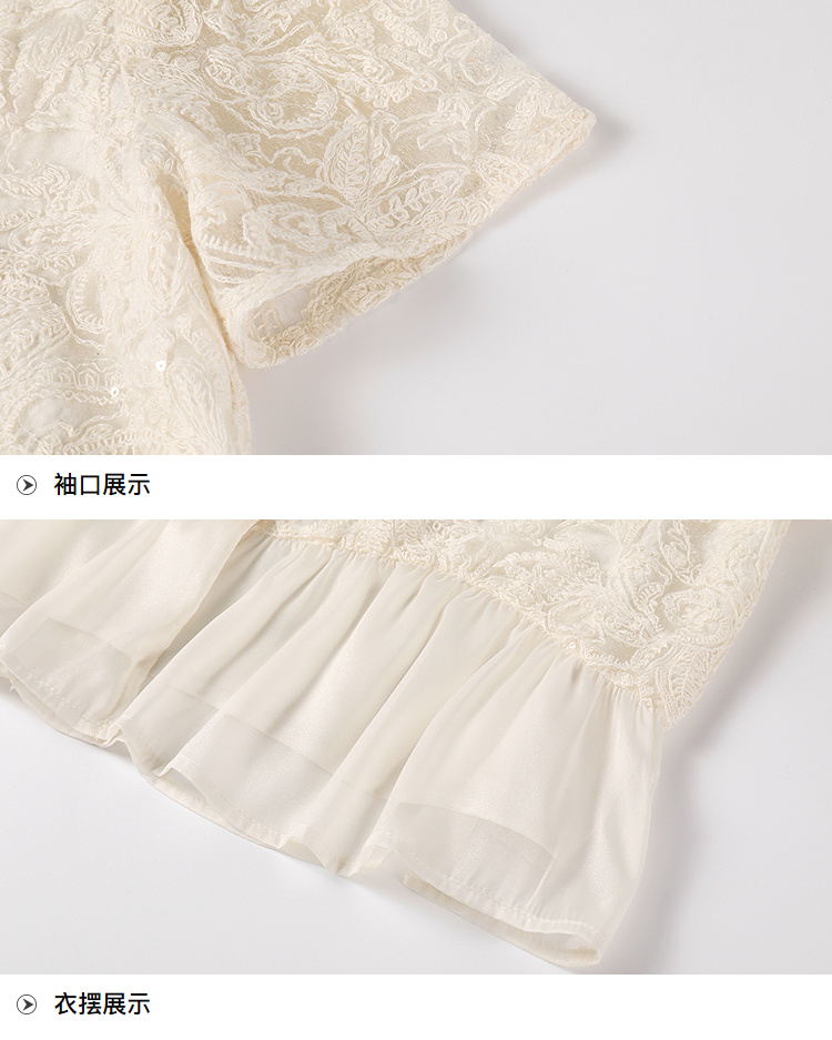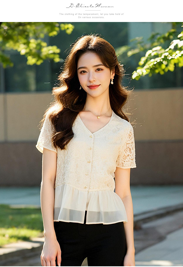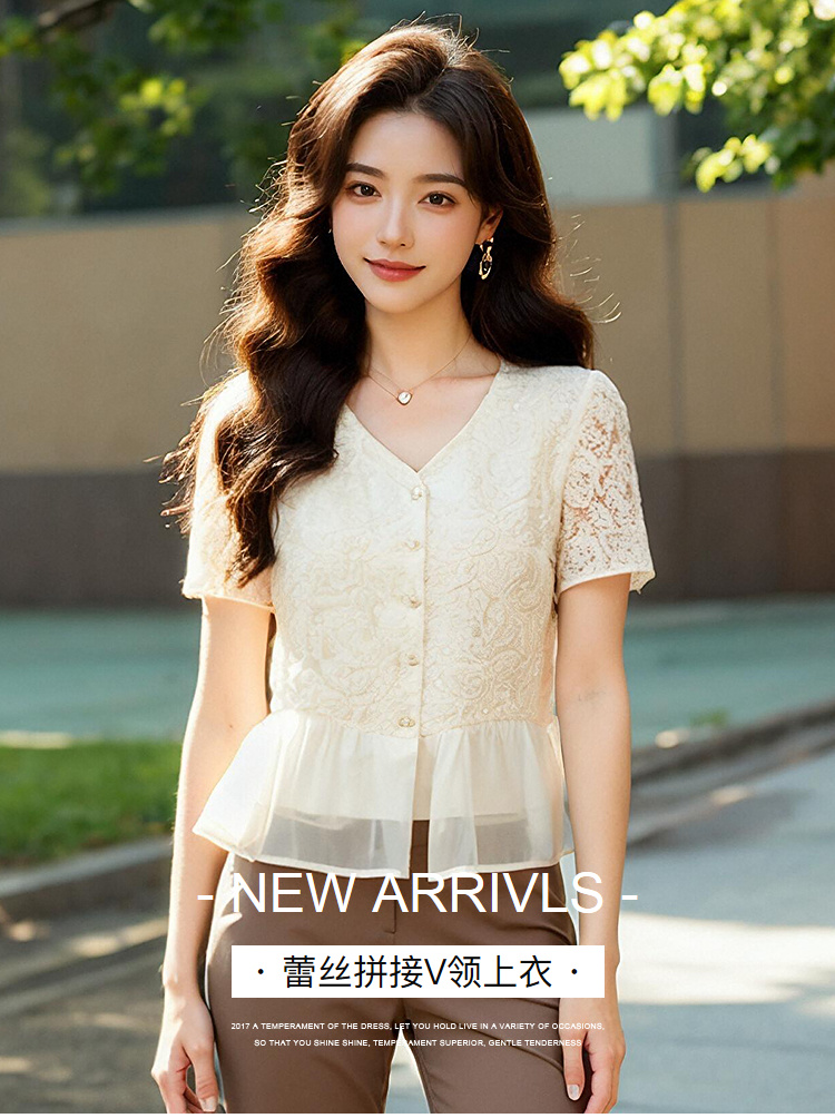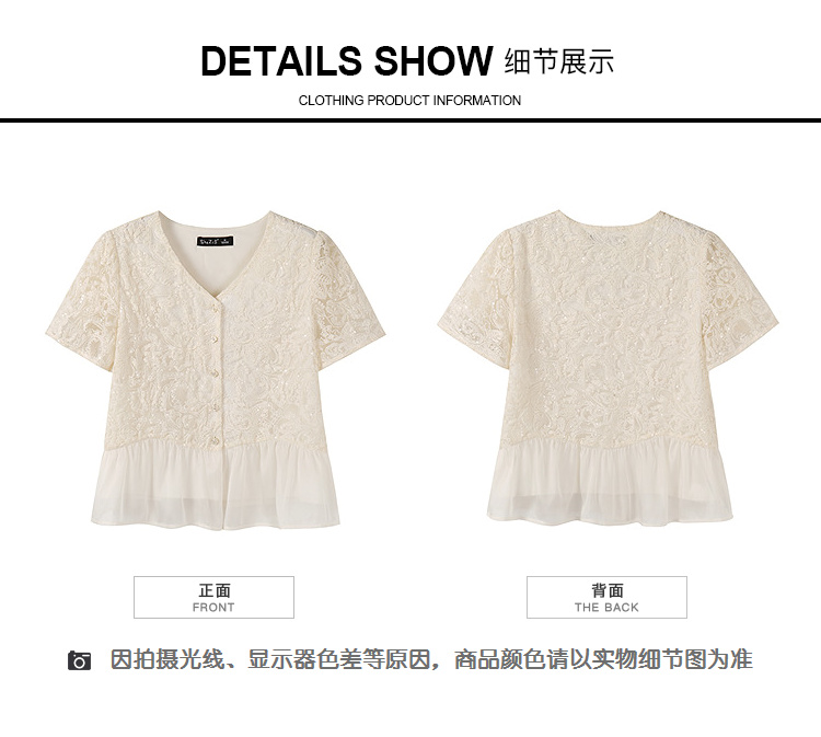 奢姿大码女装2025夏季气质温柔拼接雪纺蕾丝衬衫胖妹妹V领上衣9952253351