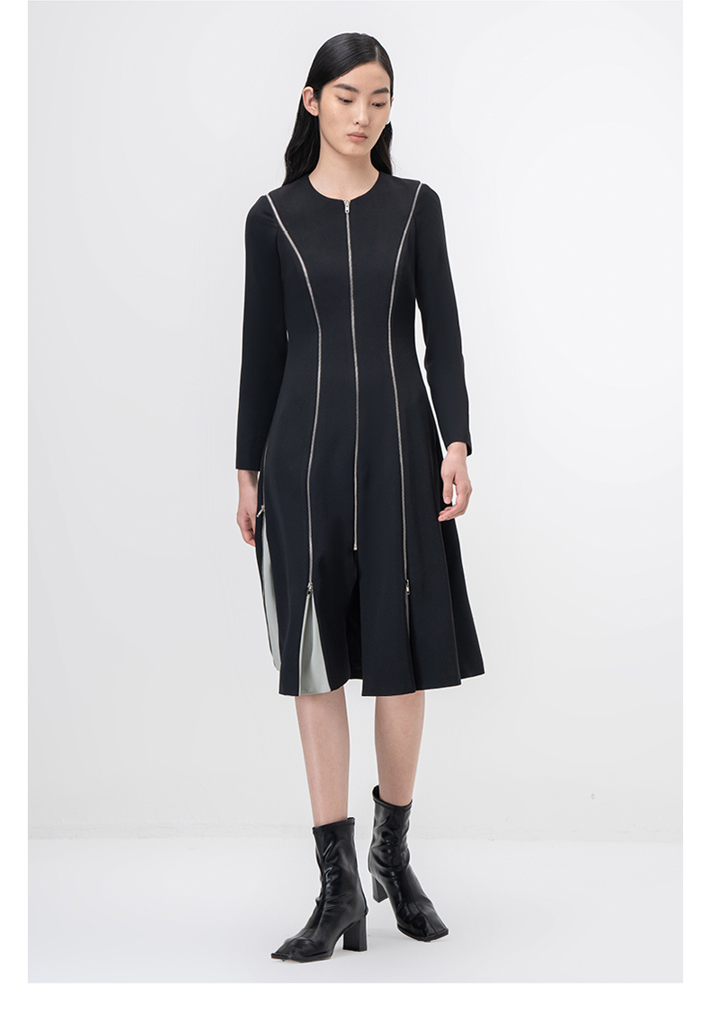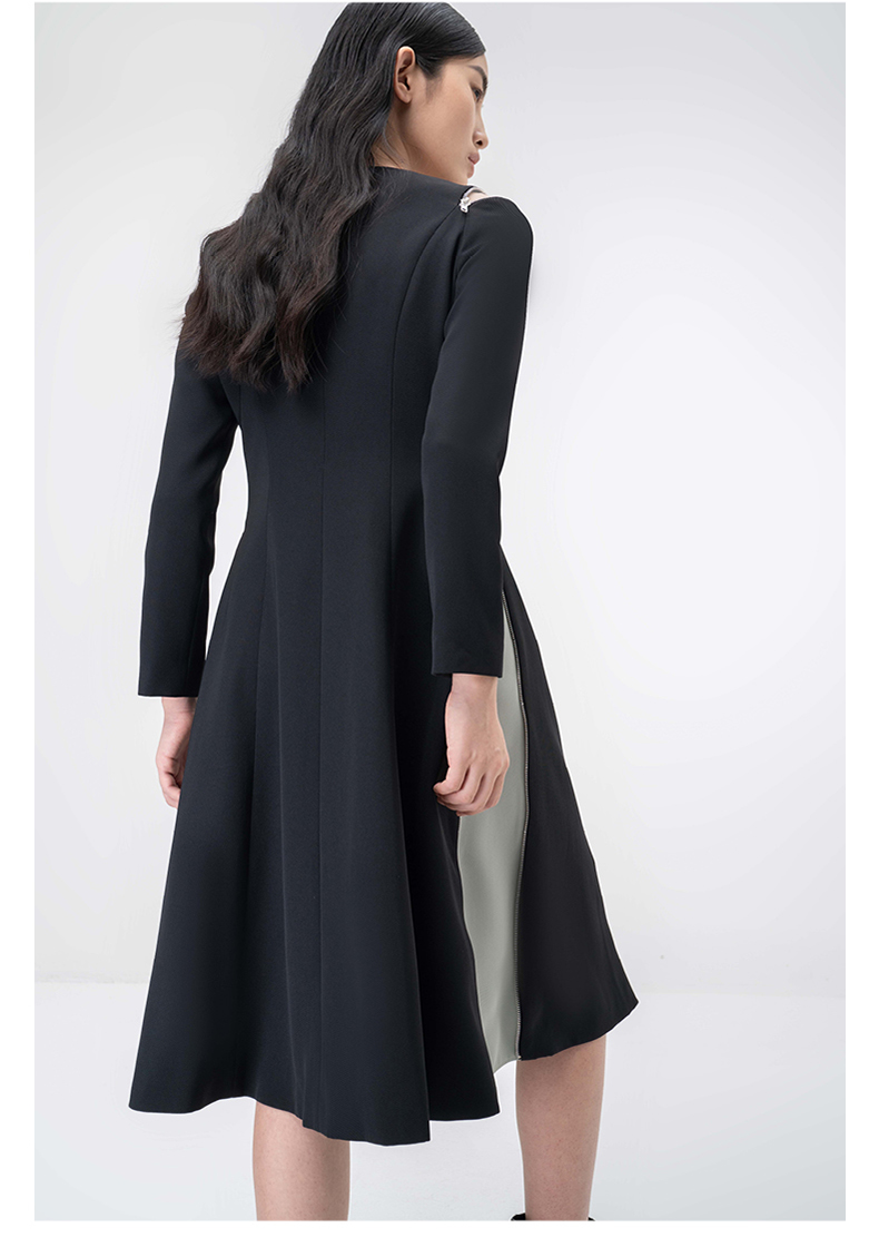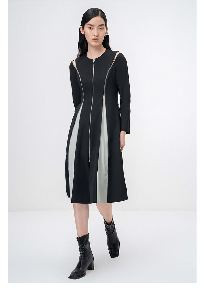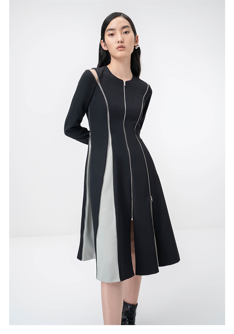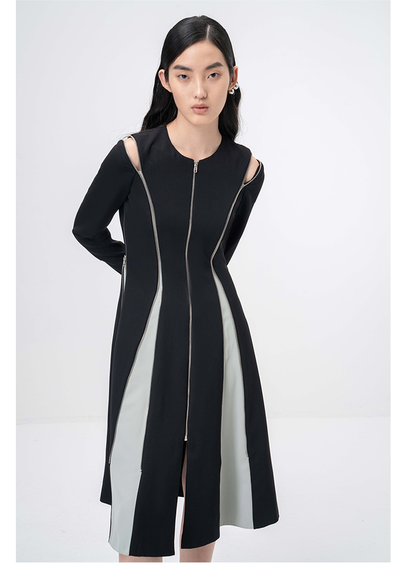 【散尾葵】拉链拼接两穿设计黑色撞色连衣裙/0000762