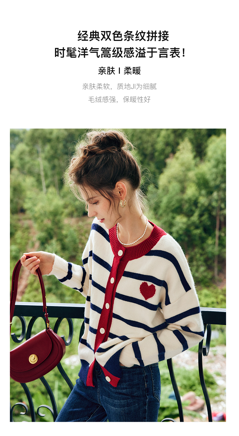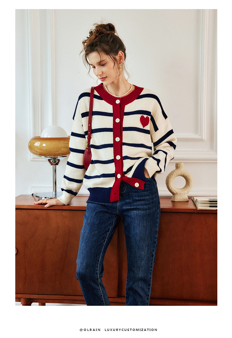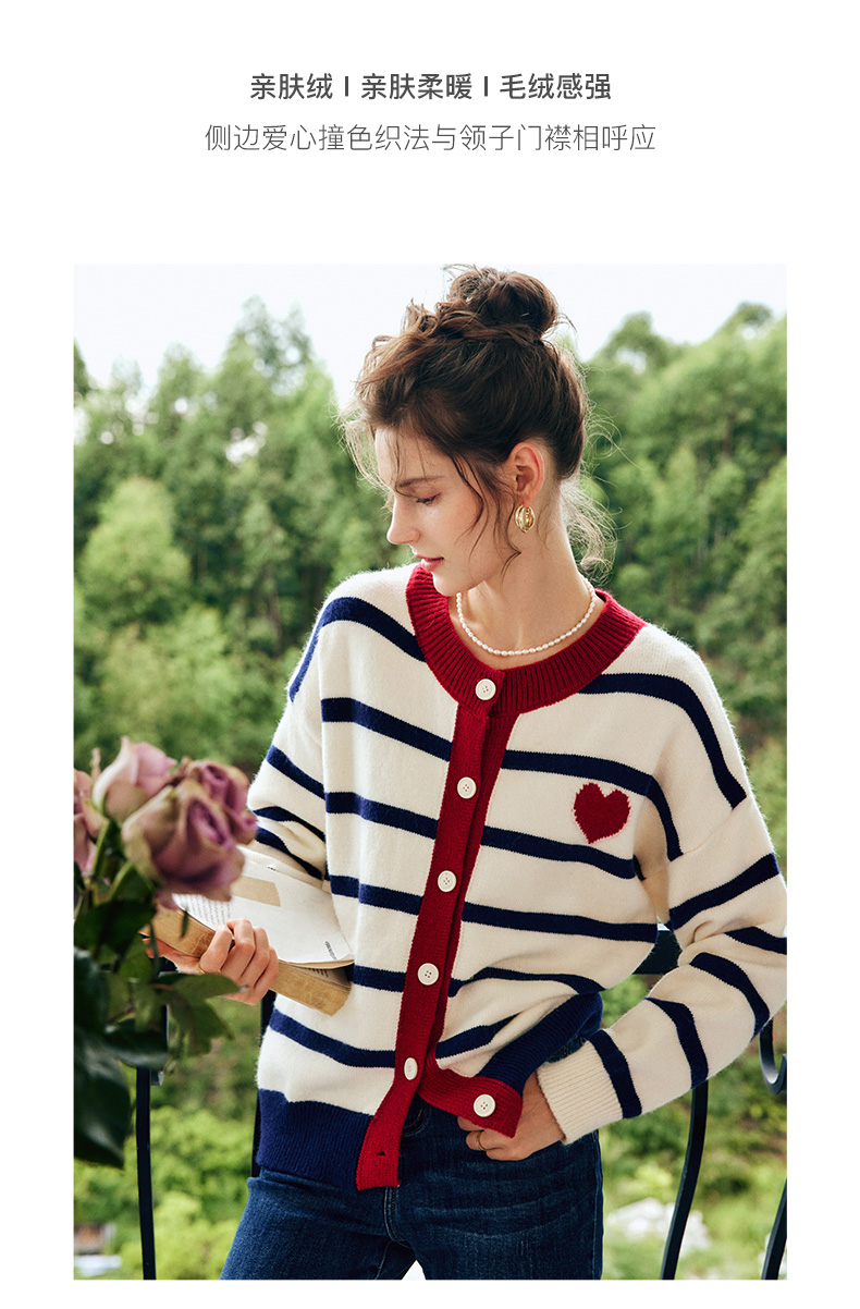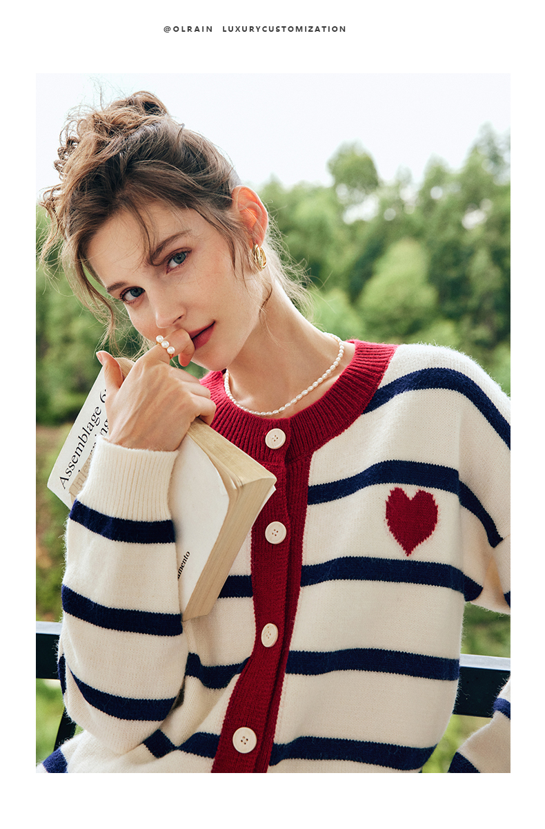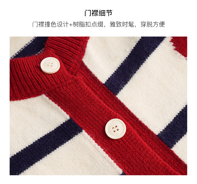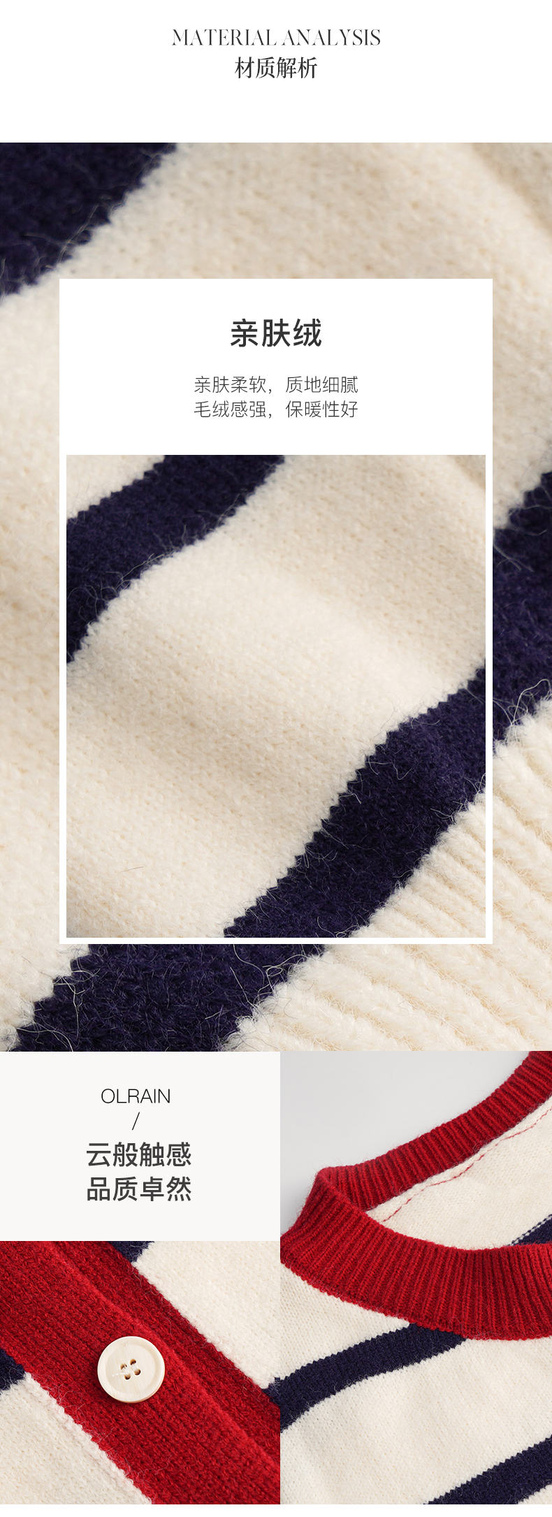OLrain欧芮儿法式条纹毛衣开衫女秋季2022年新款撞色圆领针织外套