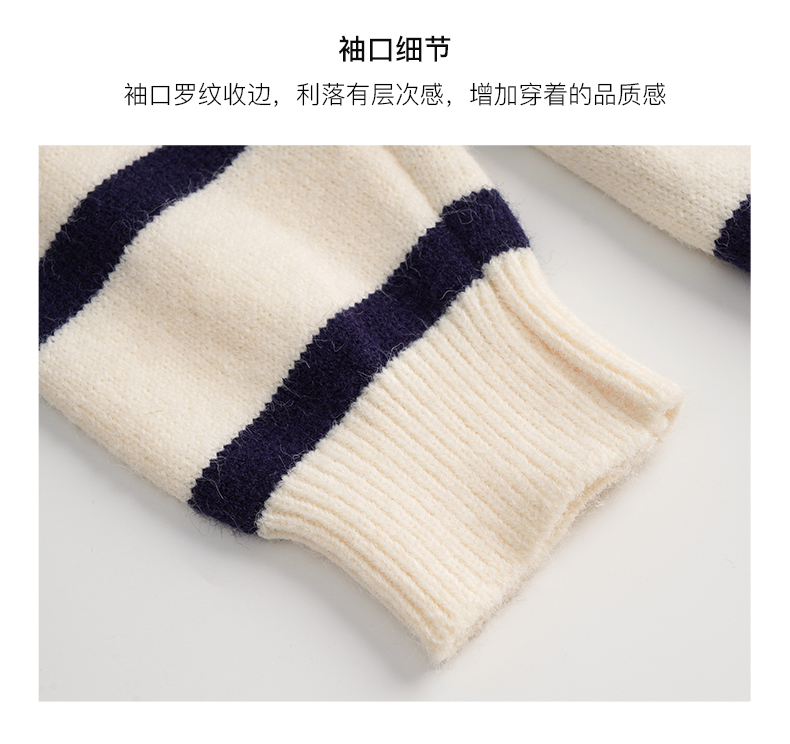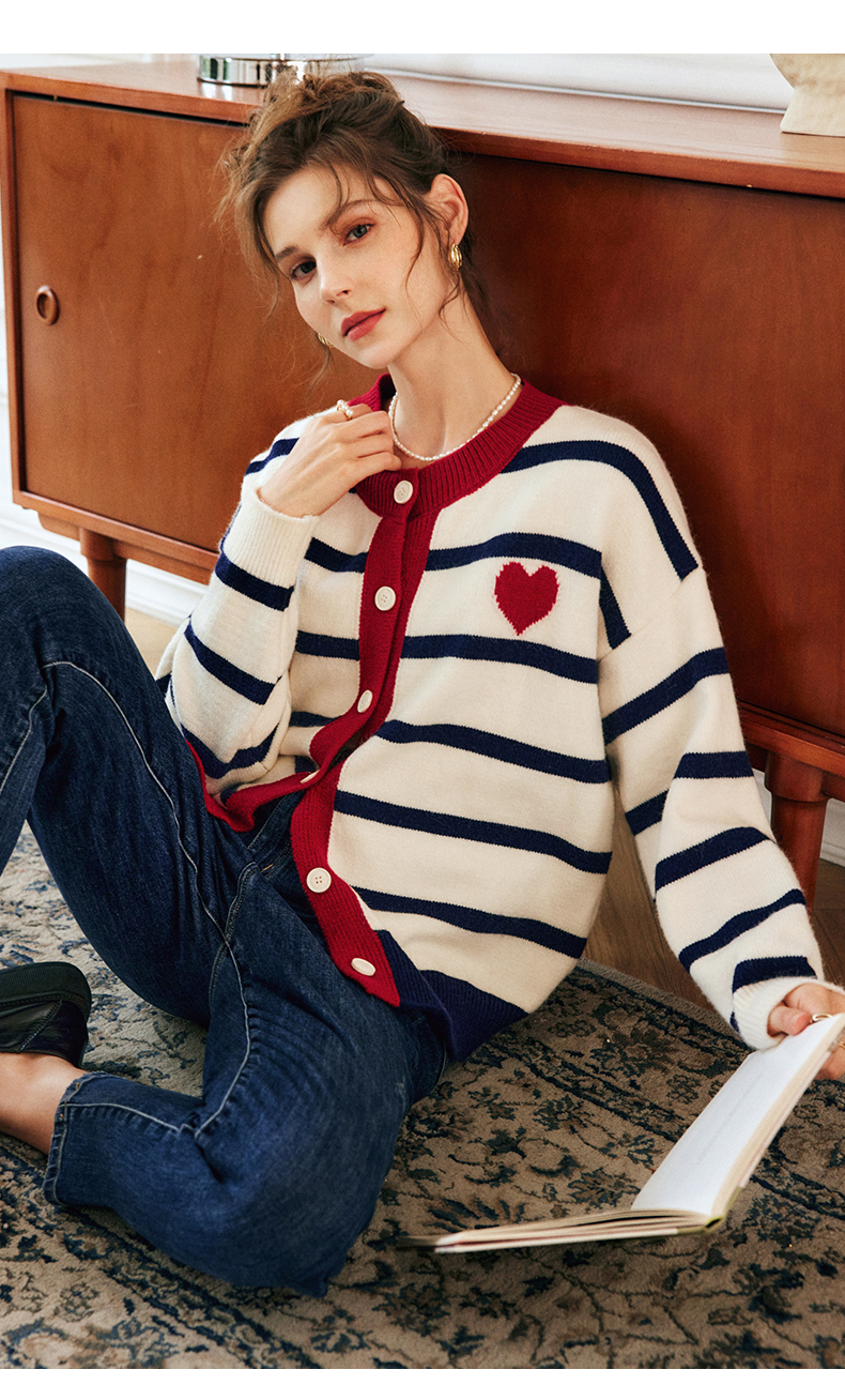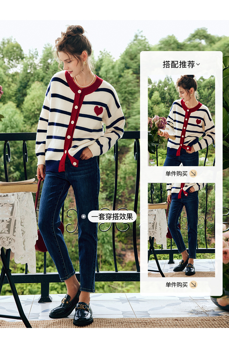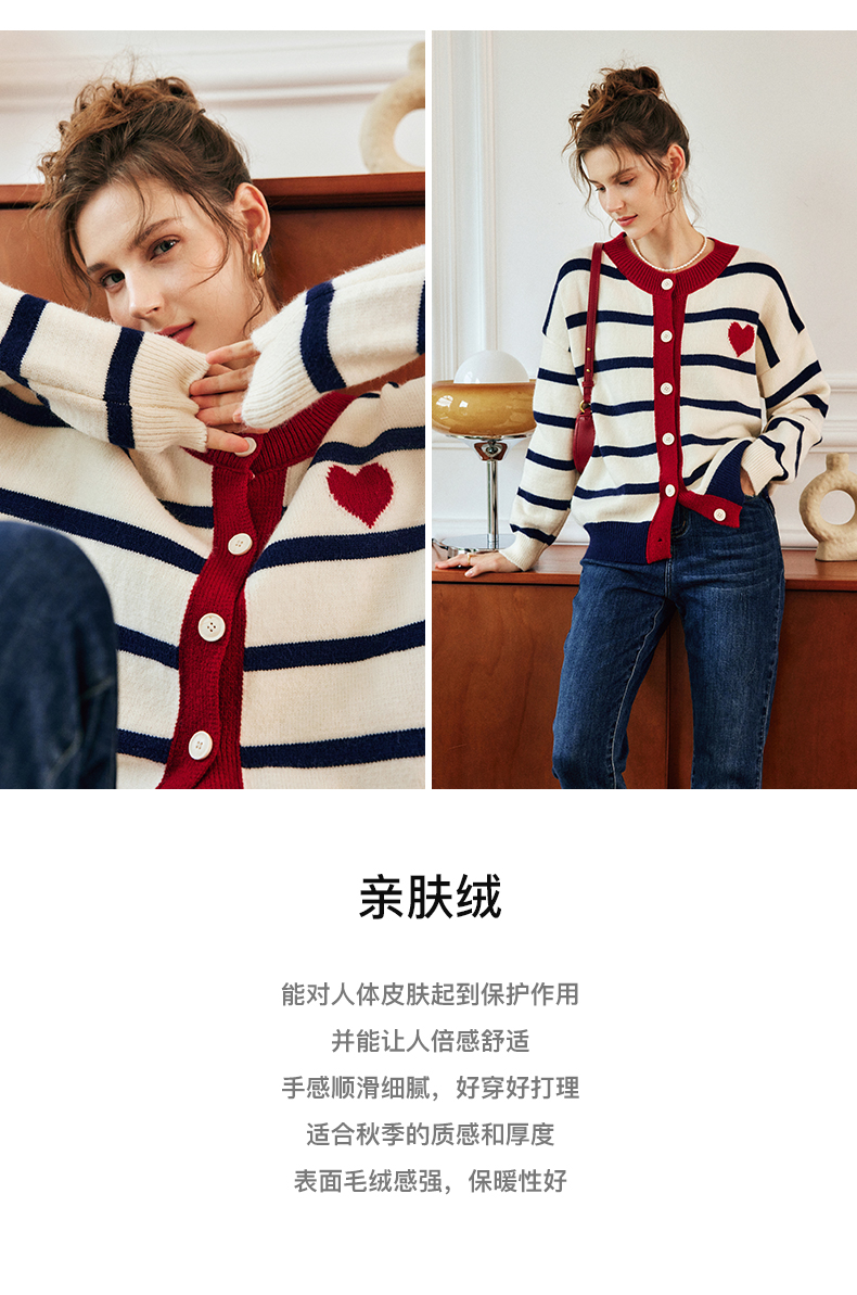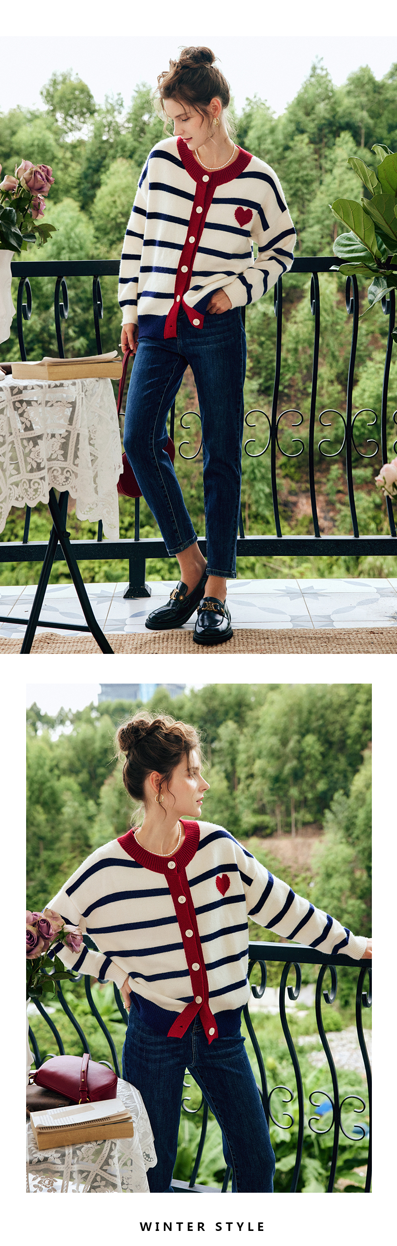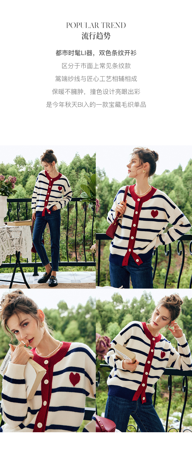 OLrain欧芮儿法式条纹毛衣开衫女秋季2022年新款撞色圆领针织外套