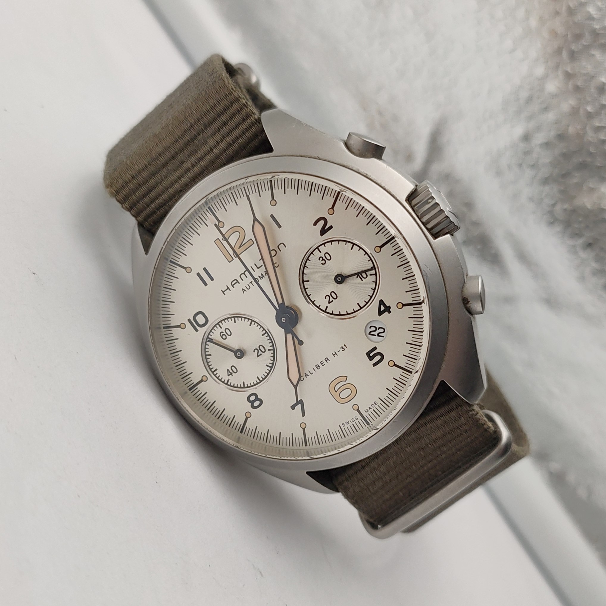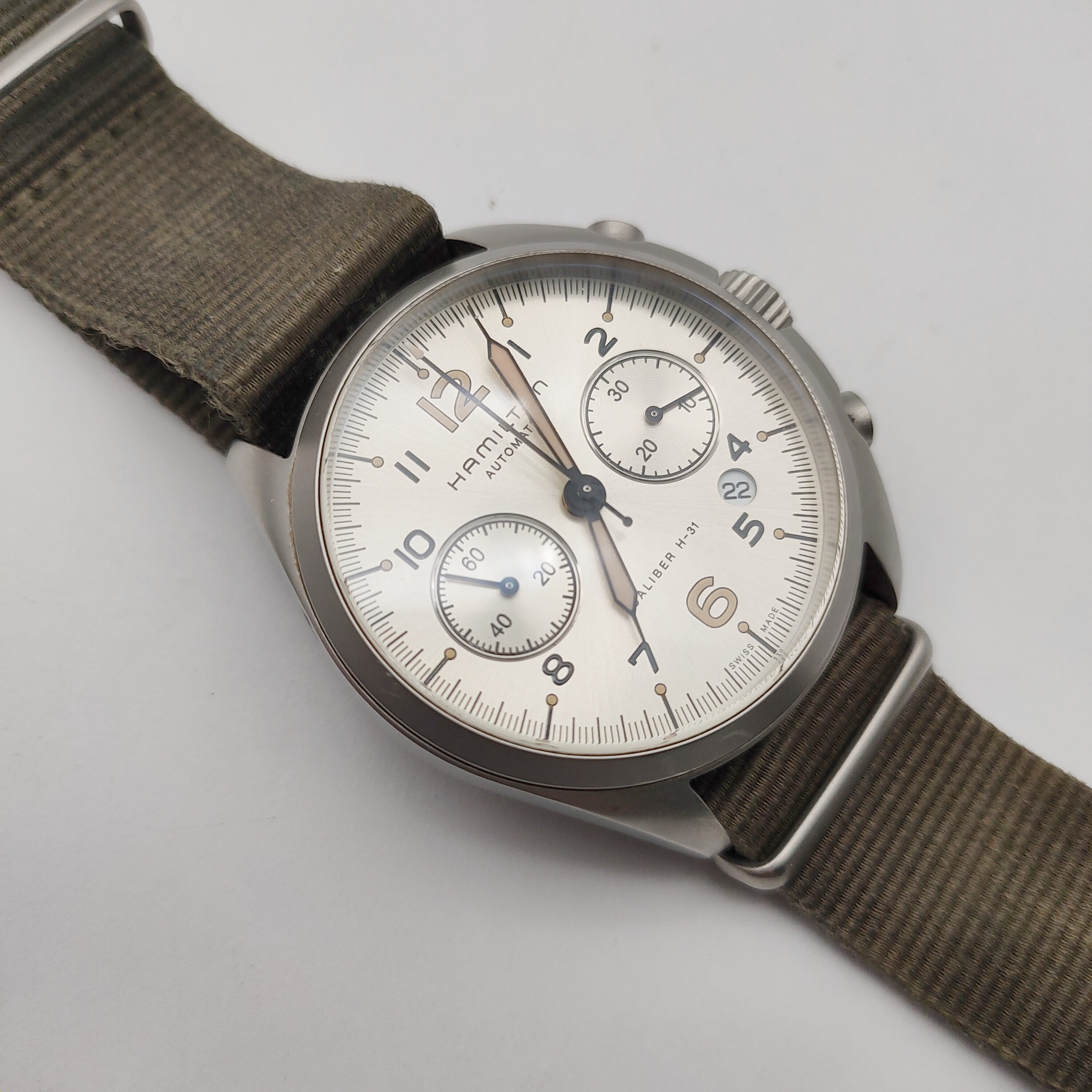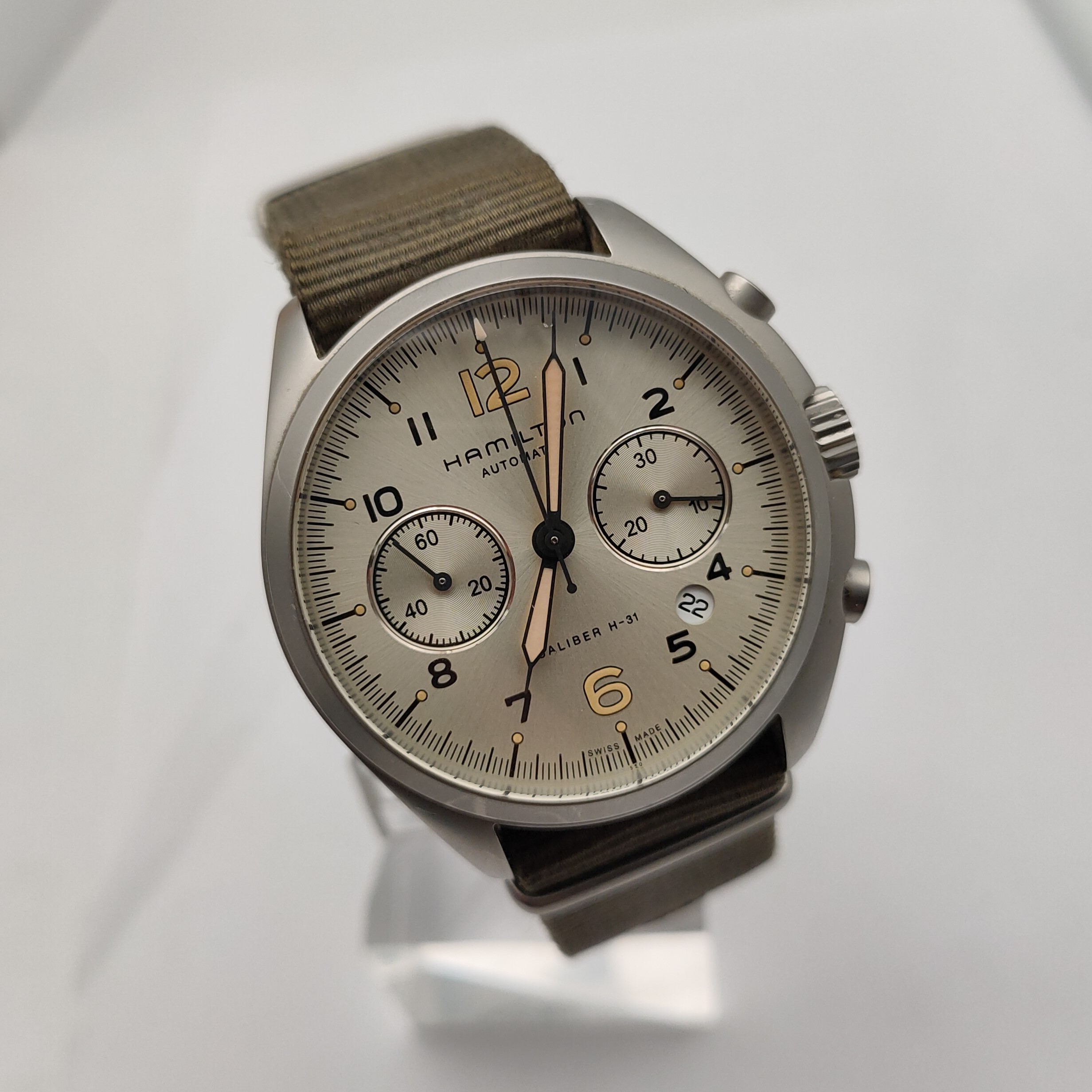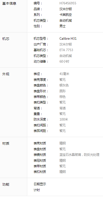 汉米尔顿卡其航空系列H76456955男款机械表,41mm表径,银灰色表盘,精钢表壳,日期计时共轭能,9成新,附件无,专柜价13900,现好价
