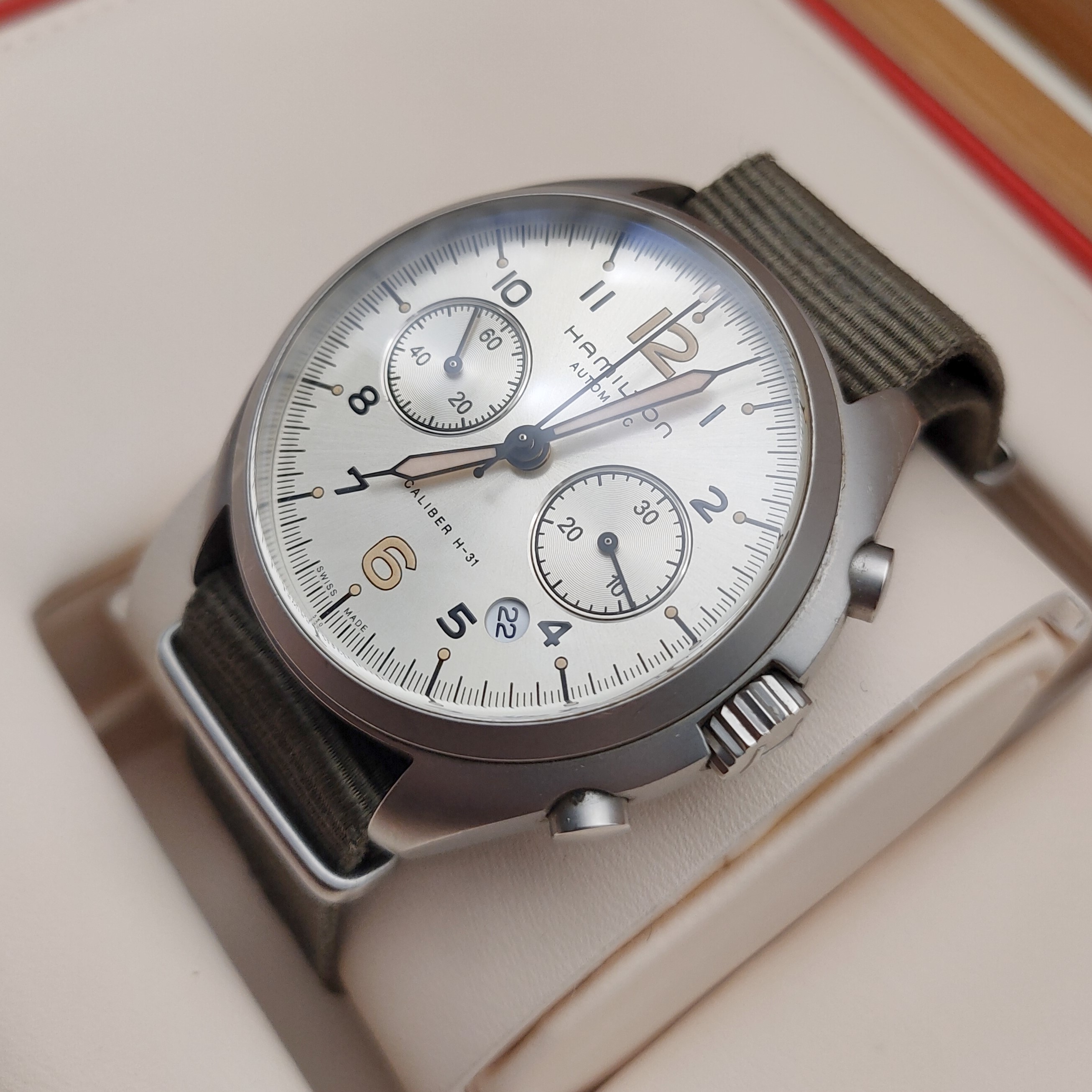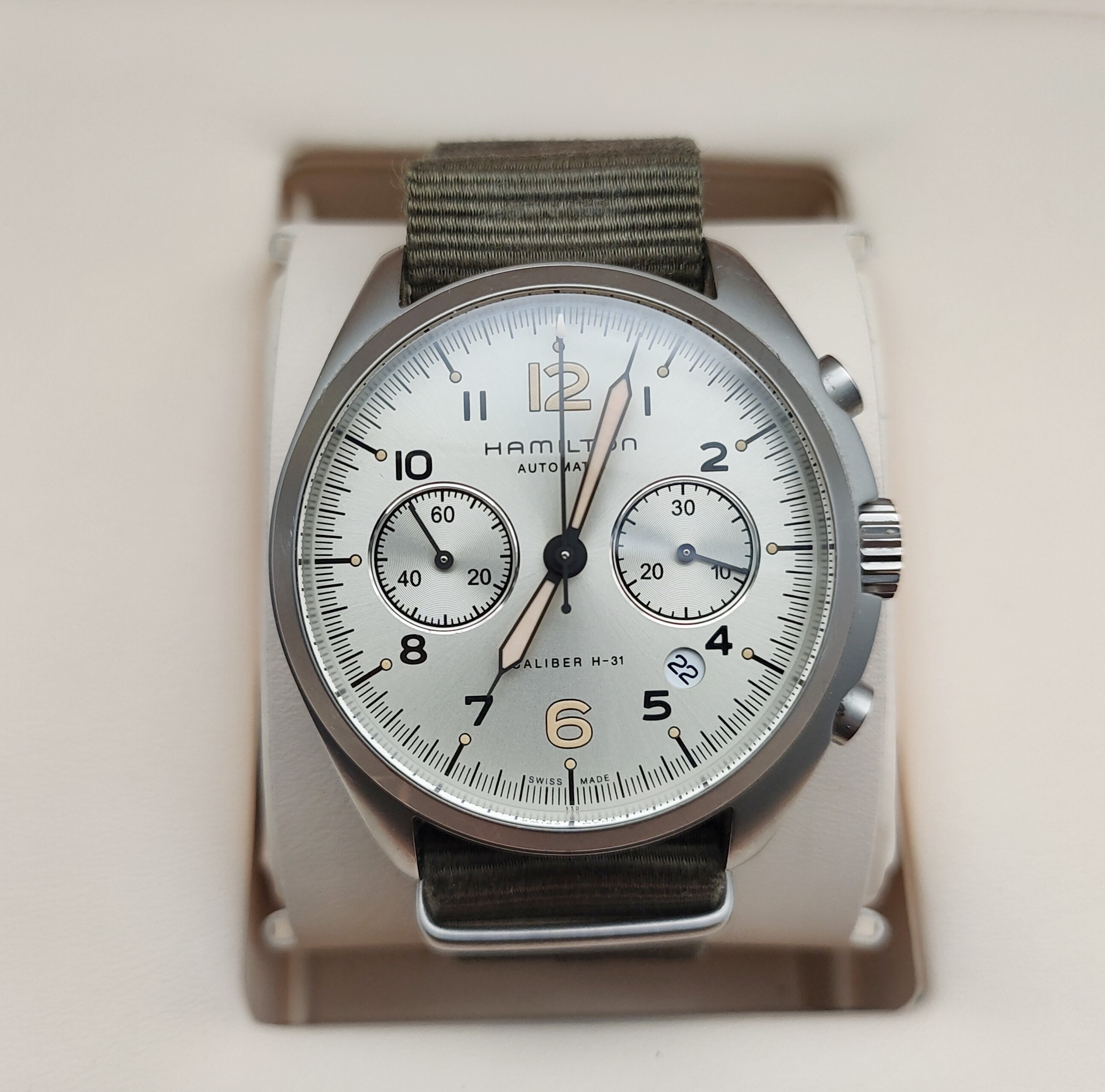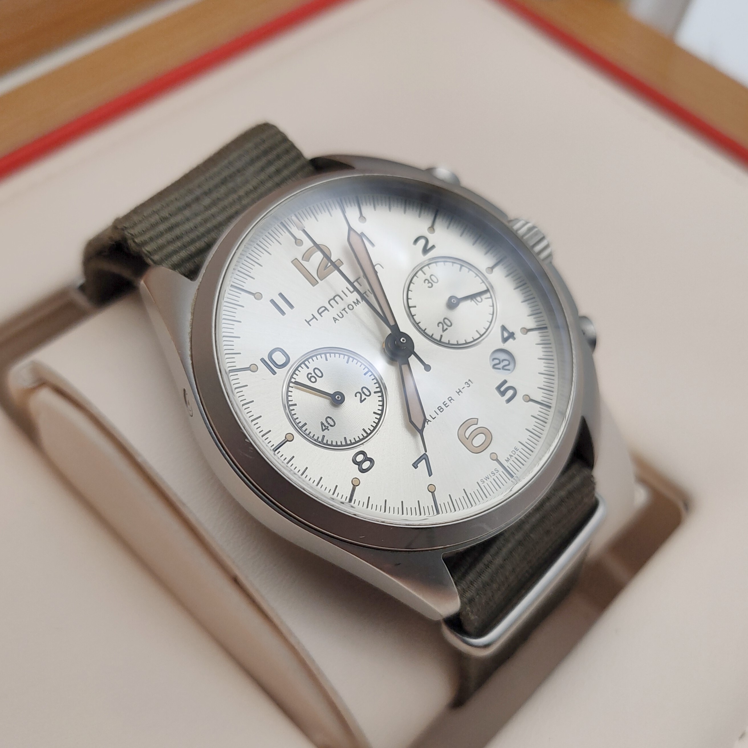 汉米尔顿卡其航空系列H76456955男款机械表,41mm表径,银灰色表盘,精钢表壳,日期计时共轭能,9成新,附件无,专柜价13900,现好价