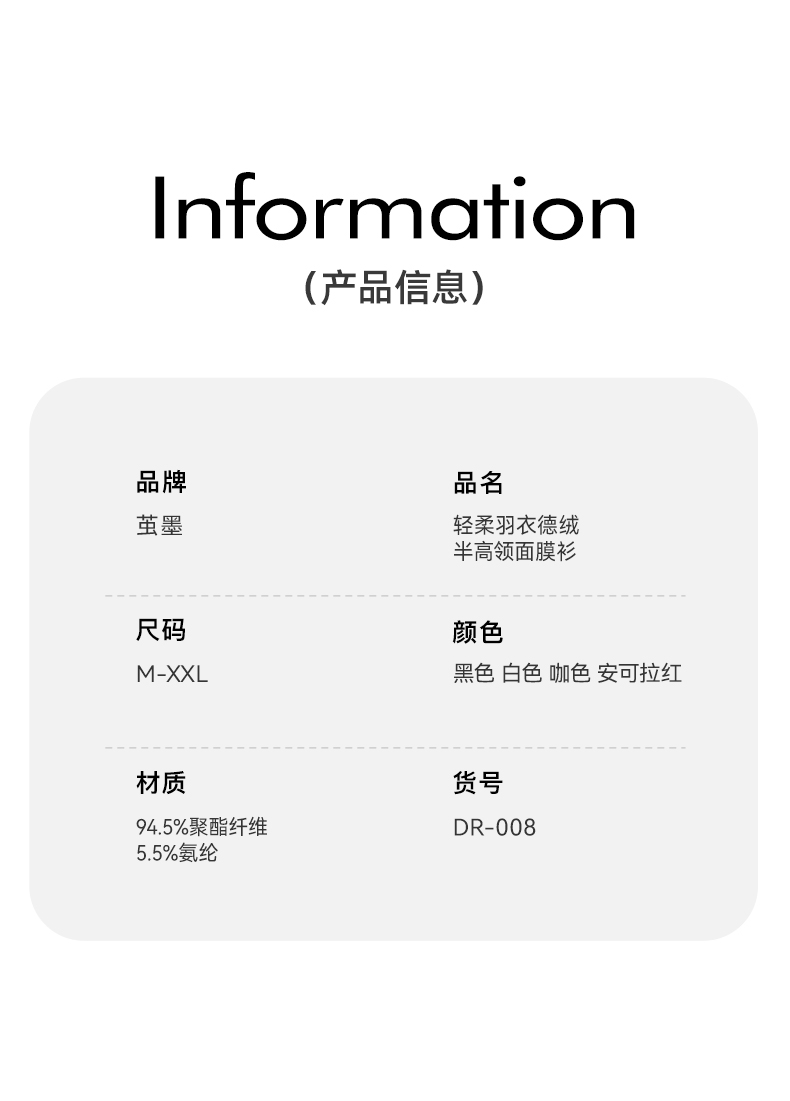 4、半高领设计,防风又保暖,修饰颈部线条,显头小脸瘦。修身版型,遮肉显瘦
