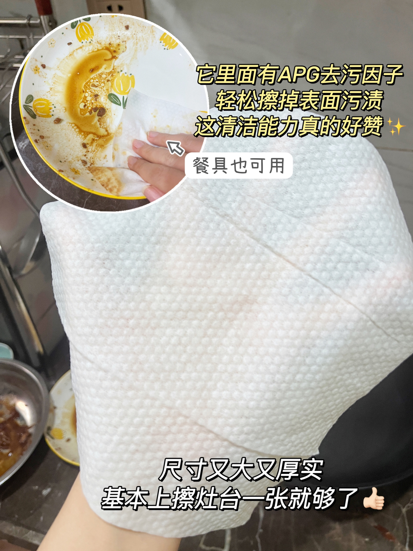 去污去油能力是真的没话说心 低泡沫的设计,不需要二次擦拭懒人福音! 像平时擦灶台一张就够了 用完直接丢!而且性价比③超高! 等于每天少收拾半小时厨房 也不怕手一直泡在水里弄的皱巴巴! 省下的时间玩玩游戏追追剧! 再也不被谁去刷碗困扰啦~