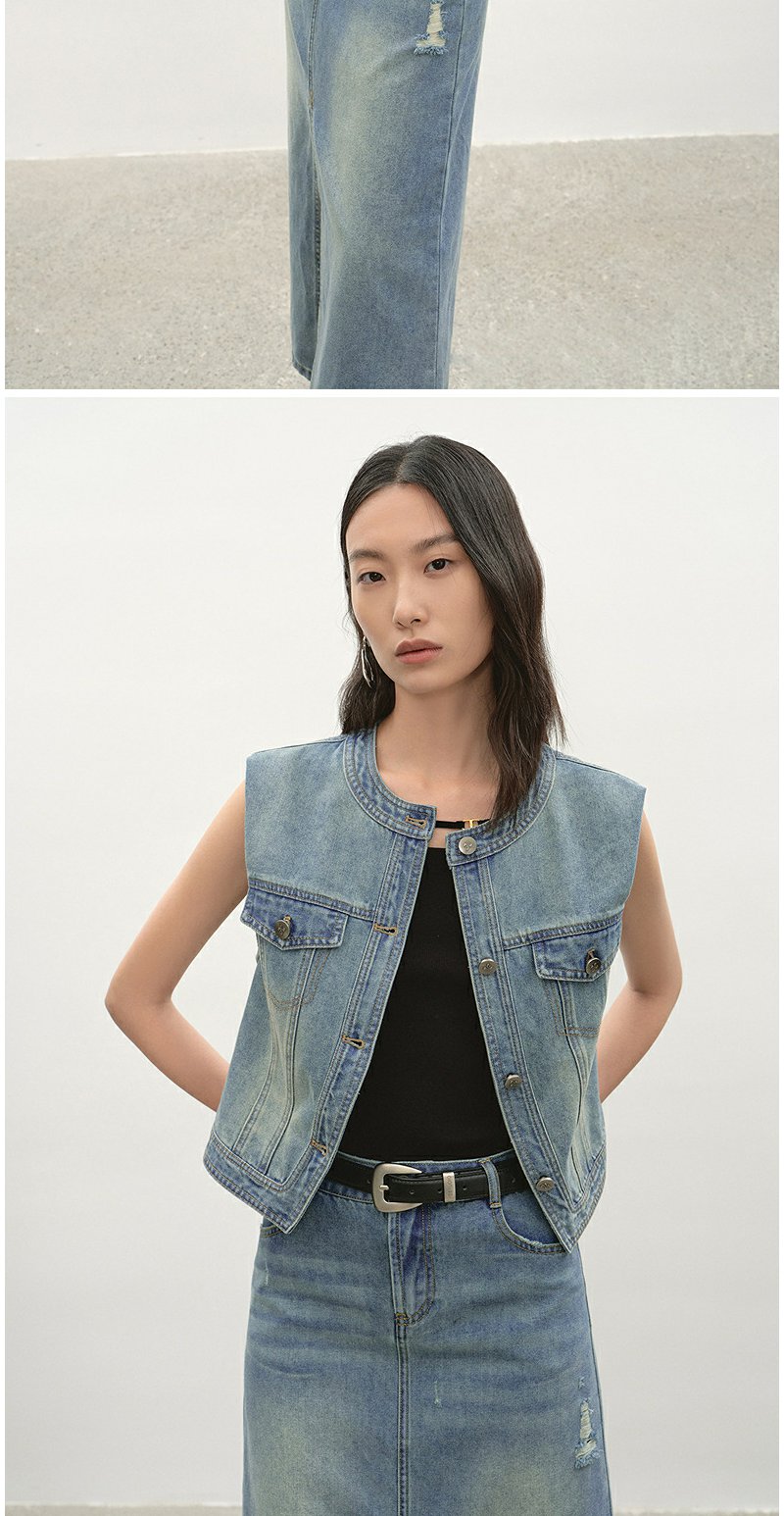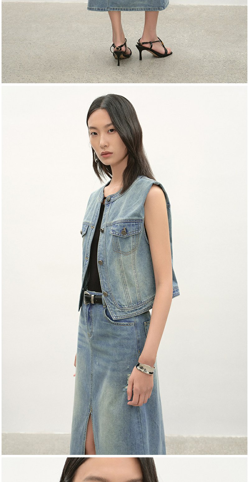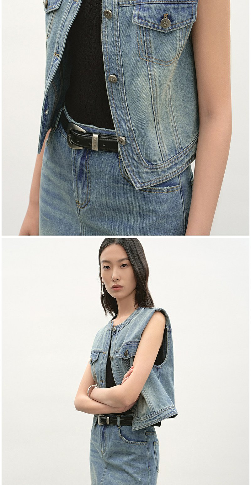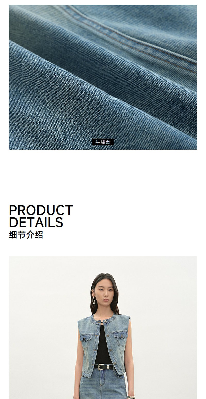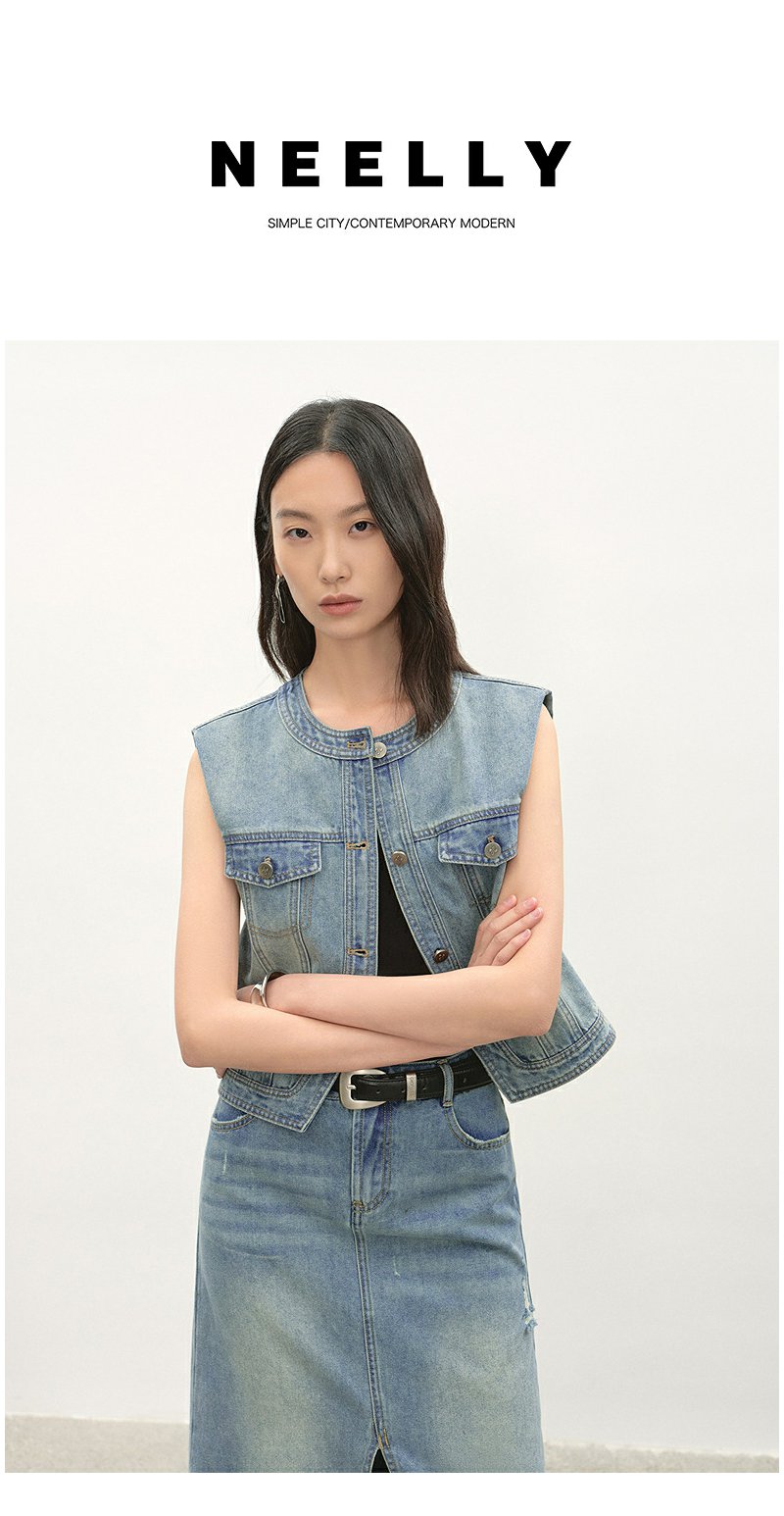 NEELLY纳俪商场同款夏新款复古百搭牛仔套装女简约叠穿马甲两件套N25041D01016