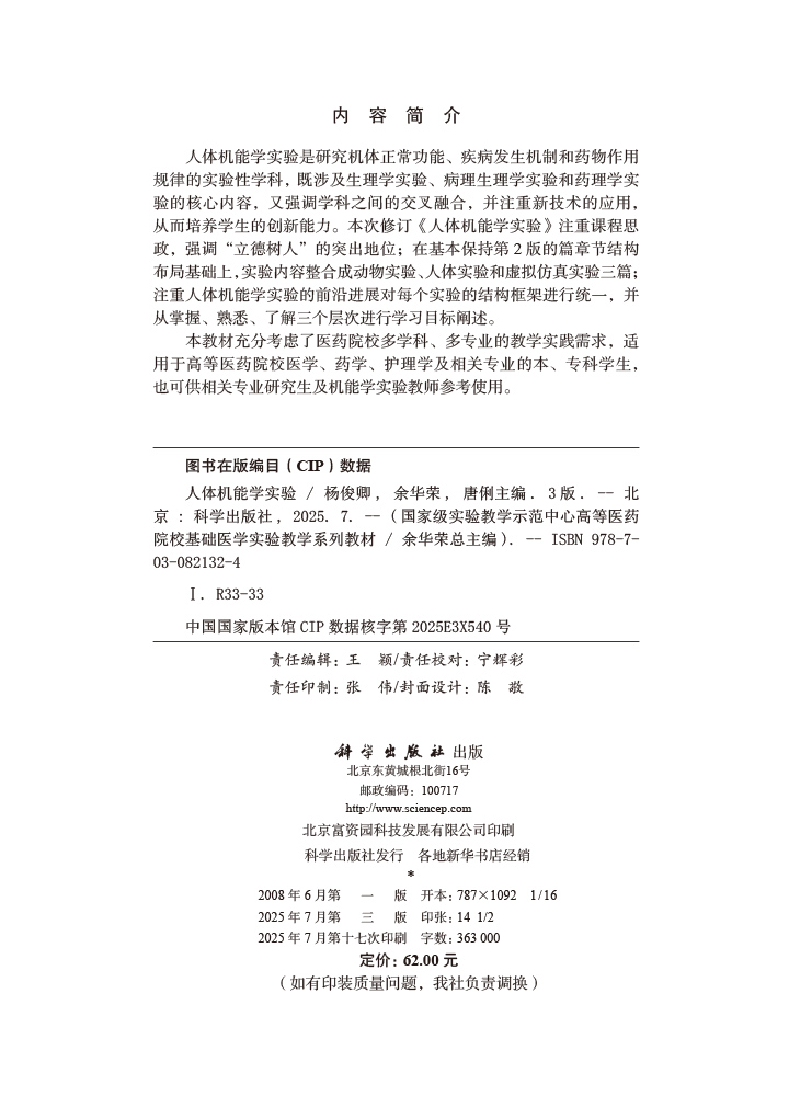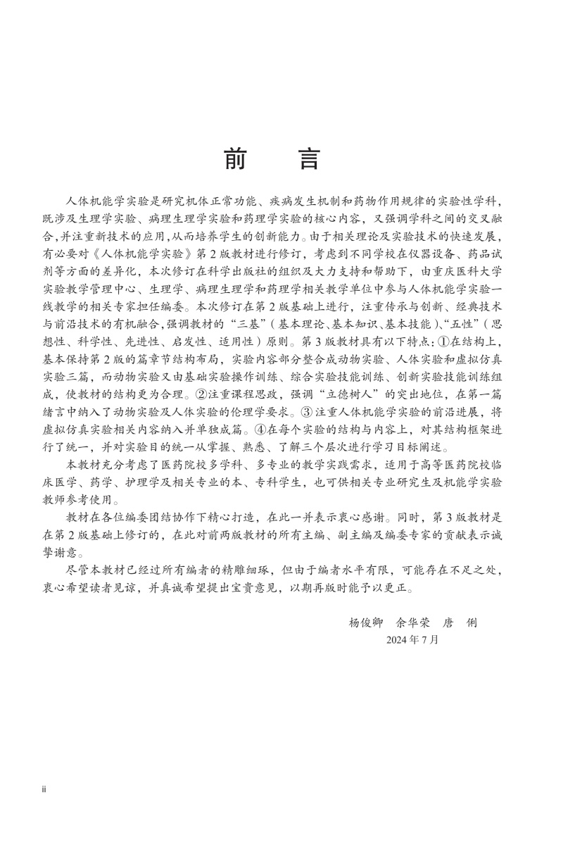 人体机能学实验 第3三版 高等医药院校基础医学实验教学系列教材 杨俊卿 余华荣 唐俐 医学相关专业 机能实验学习用教材科学出版社