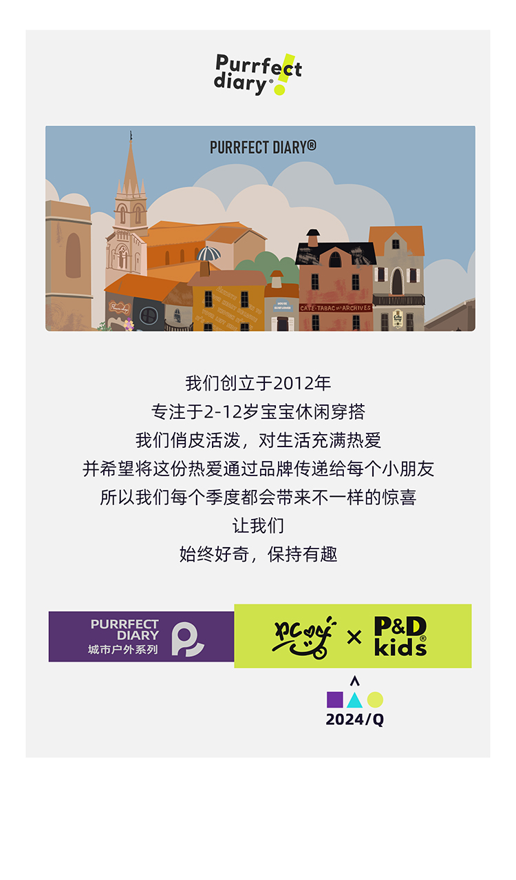 Purrfect-Diary专注于贴近自然随性的穿着概念,轻奢平价的童装文化传播,在产品设计上更加注重婴童穿着的舒适性、安全性、更出众的国际化品牌,将欧美的育婴文化在中国进行深入的传播与推广。