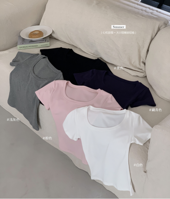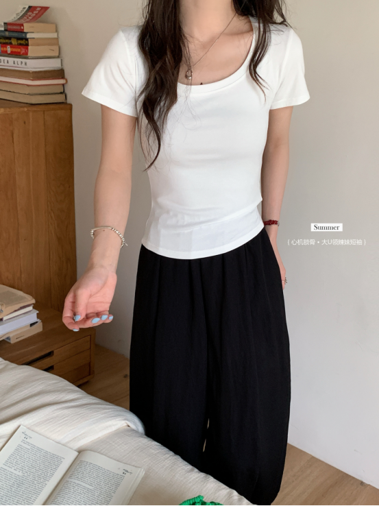 【骆柒柒Y001心机锁骨 • 大U领辣妹短袖 】💥没有什么身材是一件正肩的U领T恤搞不定的🌸 它真的对圆脸🌈、肩宽的姐妹超级友好,
