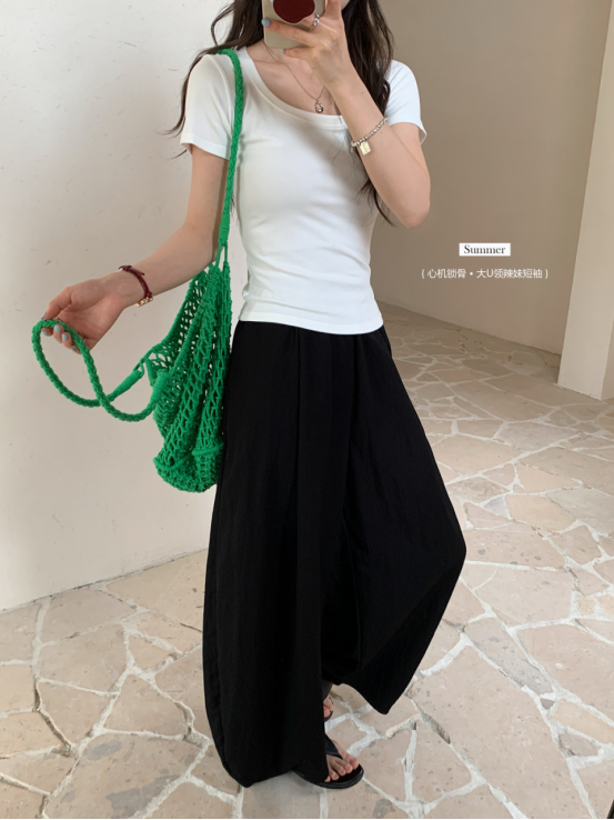 🖤 黑色 Black | 酷飒性感感 「黑色大U领短袖,谁穿谁A爆了」 这件黑色真的太有事了!大U领+合身剪裁,一秒显锁骨、显肩线、显脸小, 搭条黑色高腰裤直接辣感爆棚!墨镜耳环一加就是“酷妹出街预警” 不是传统意义的性感,是那种穿起来就很有锋利感的时髦~