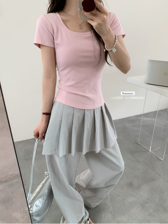 粉色 Pink | 甜辣少女风 「这件粉色短袖真的甜炸了🍬」 是那种“带点小坏”的可爱,不是小女生,是辣妹的那种! 大U领微露不俗,粉色又让整体多了点软糯质感, 搭牛仔裤or白裙都很嫩!拍照显脸白!