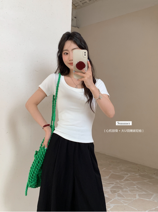 🤍 白色 White | 清纯纯欲风 「纯欲系女孩的标配T恤√」 白色大U领短袖真的太有氛围感了! 清清爽爽的感觉但又不会“寡淡”,恰好露出锁骨+脖颈线 搭配麻花辫、发卡、A字裙,小奶感+轻甜感拉满 想拍软萌辣妹风,选它闭眼入!