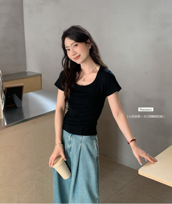 这个U领,我真的愿称之为锁骨天花板!” 谁懂!这条大U领短袖真的太辣了 U型领口刚刚好地露出锁骨线,不会太低但很心机 显肩窄、锁骨清晰、脸小一整圈 ✅ 搭个牛仔裤、墨镜、金链子,直接变身city辣妹!