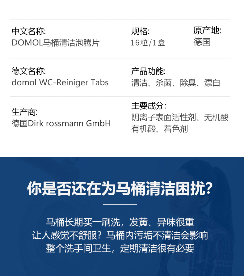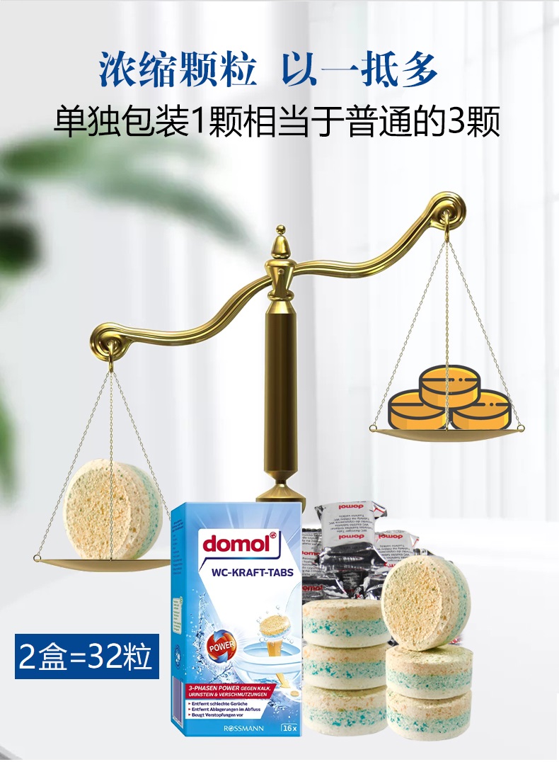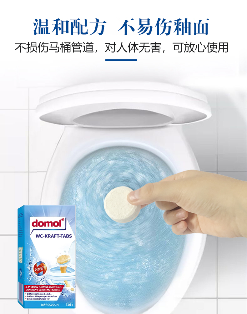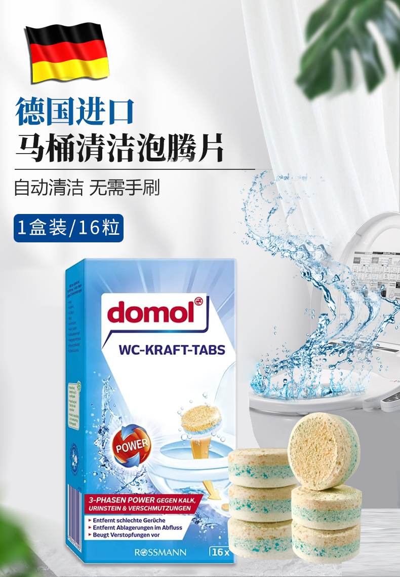 【中欧班列精选2盒】德国马桶泡腾片 原装进口Domol冲马桶清洁泡腾片清洁片去污黄渍清洁块除垢剂16粒/盒