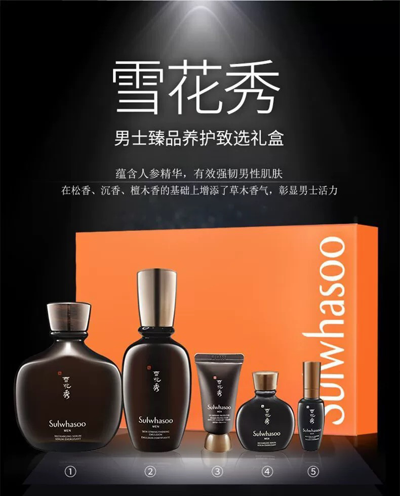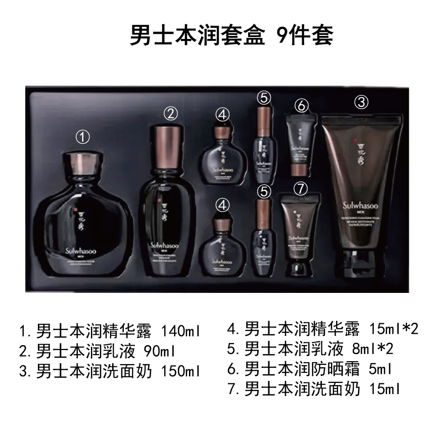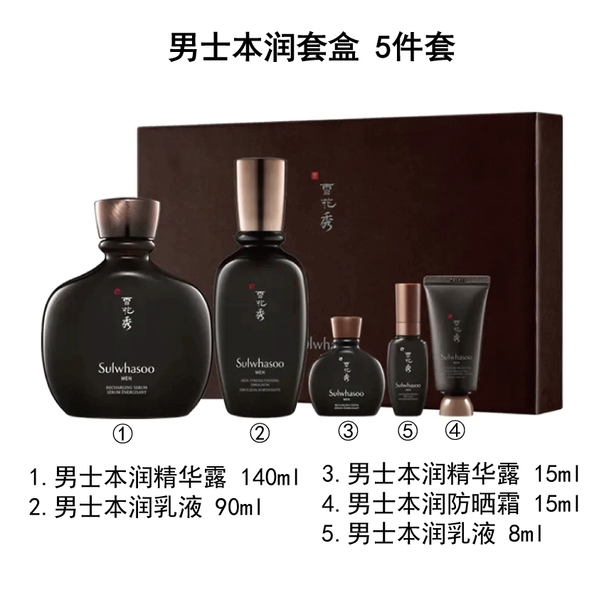 韩国 SULWHASOO雪花秀 男士本润致选水/乳2件套 套盒 (精华水140ml+15ml+乳液90ml+8ml+防晒15ml)