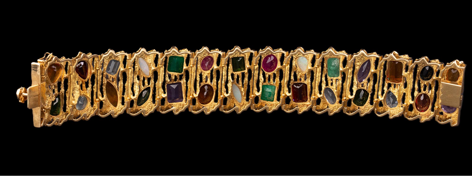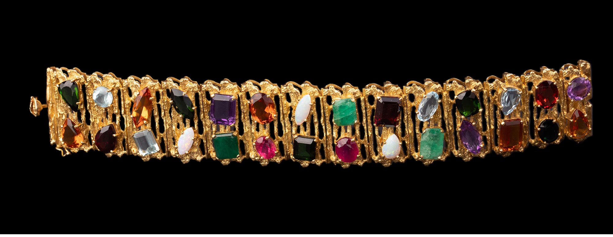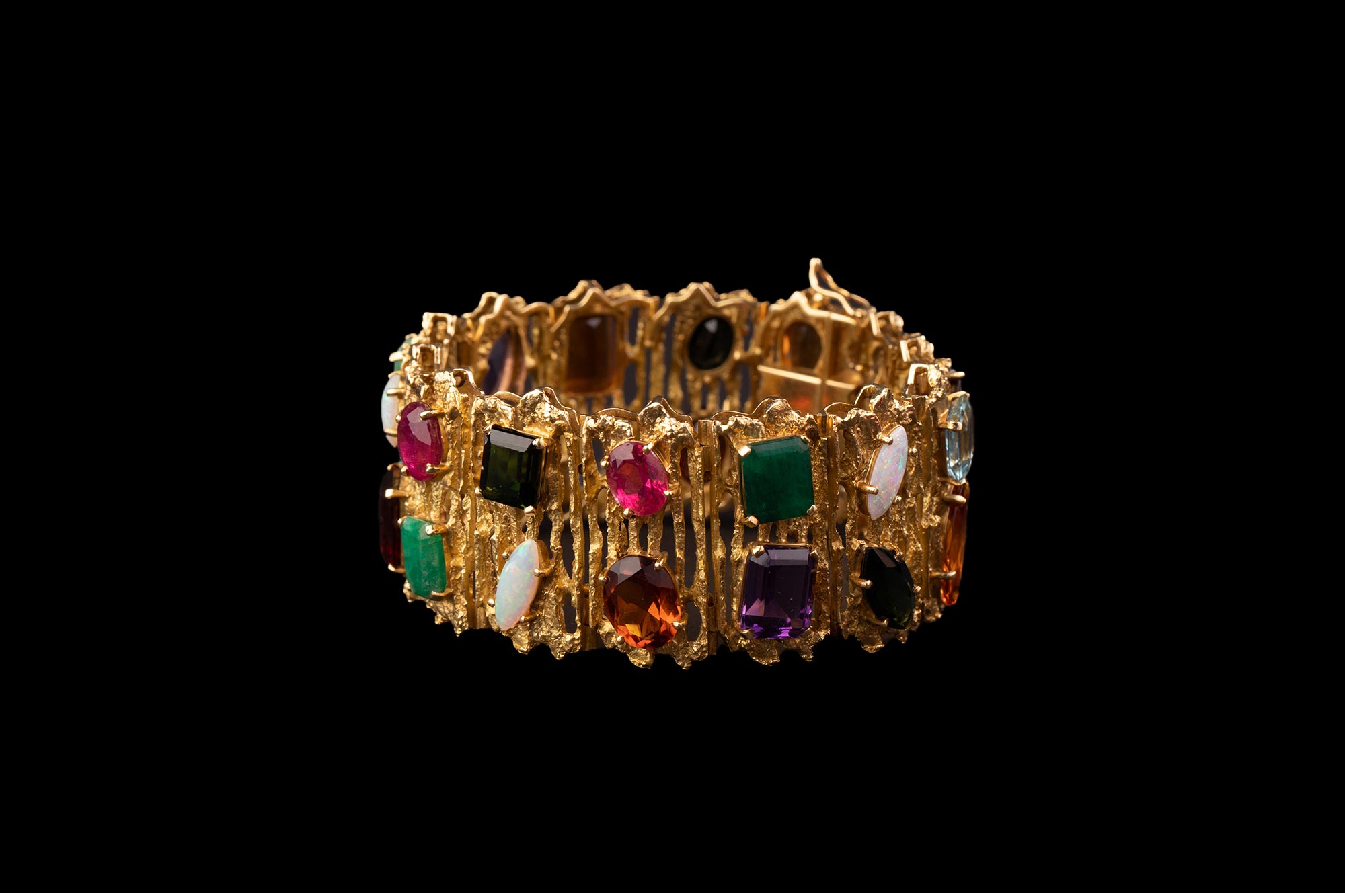 1980年代巴西出品18K黄金精雕镶嵌红宝石祖母绿海蓝宝及欧泊石等多彩宝石手镯