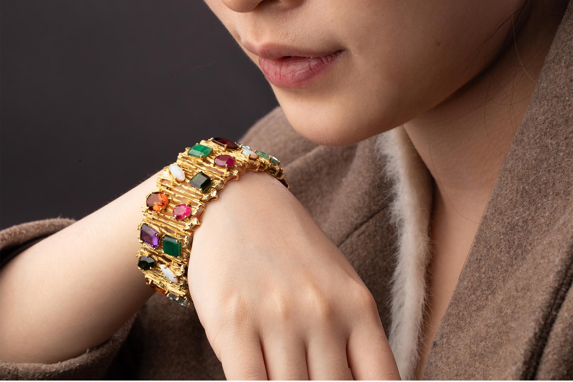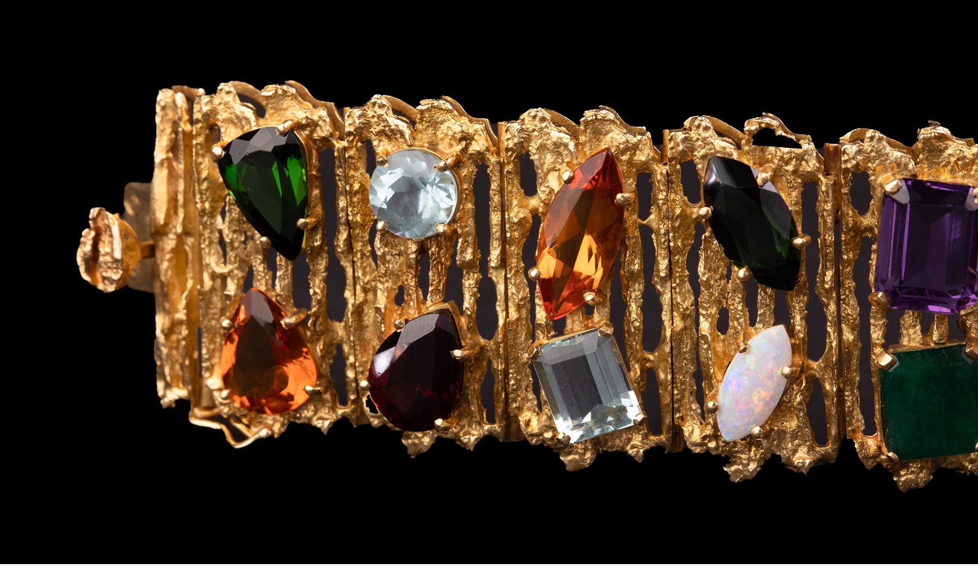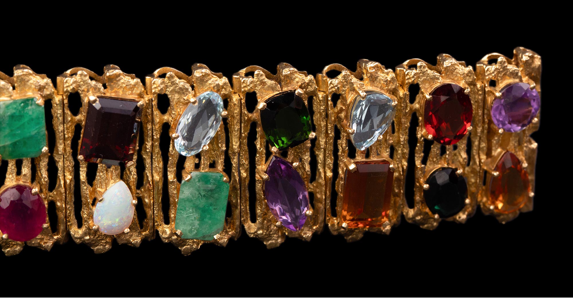 1980年代巴西出品18K黄金精雕镶嵌红宝石祖母绿海蓝宝及欧泊石等多彩宝石手镯