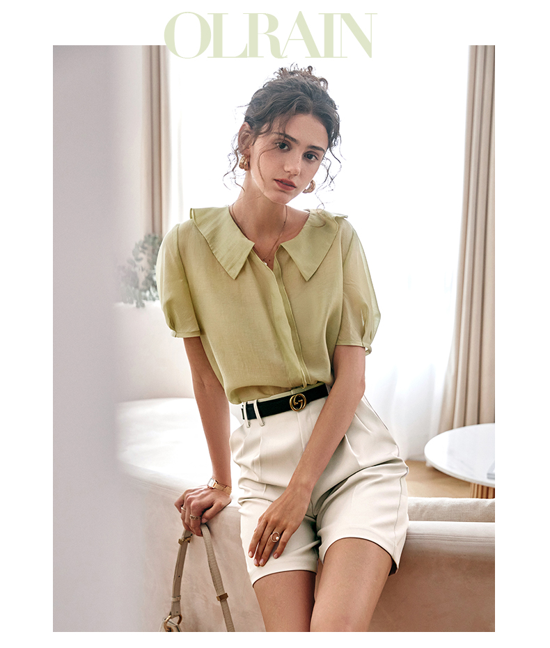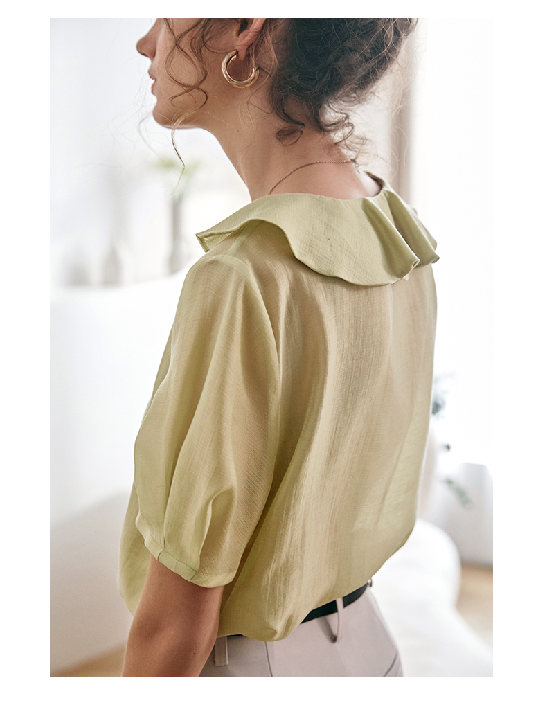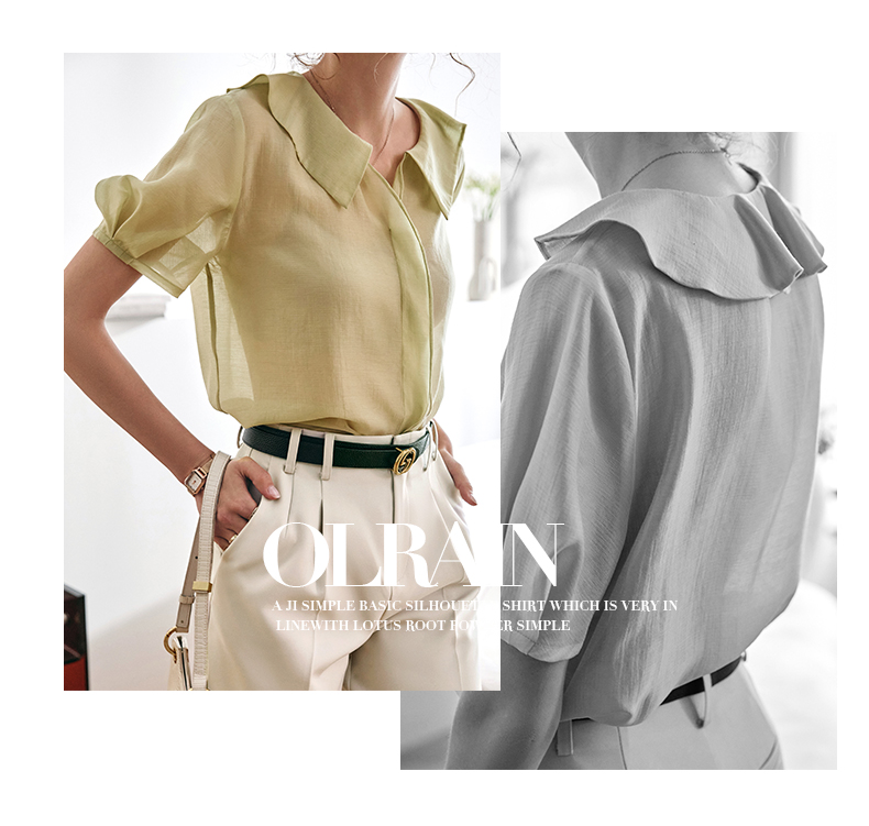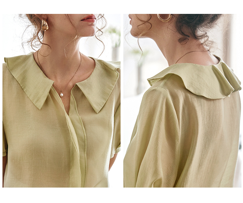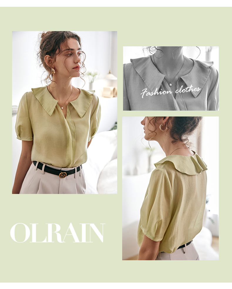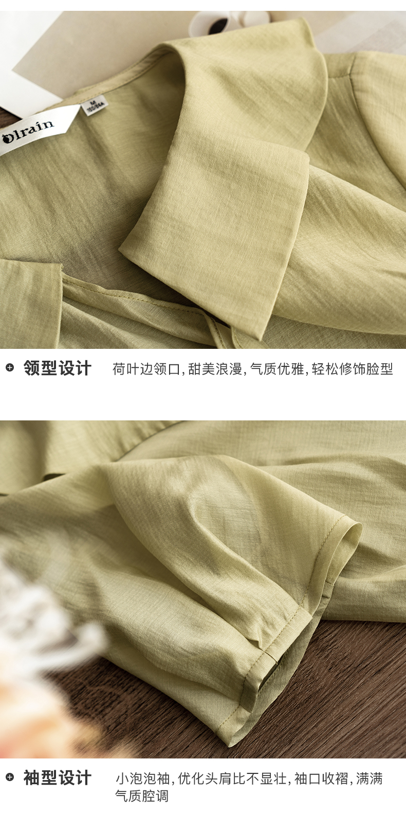 欧芮儿绿色雪纺衫女2021新款短袖荷叶边气质薄款别致小衫上衣