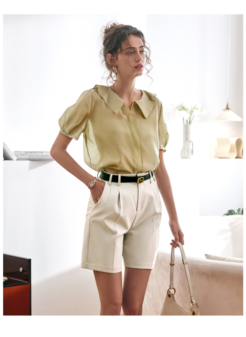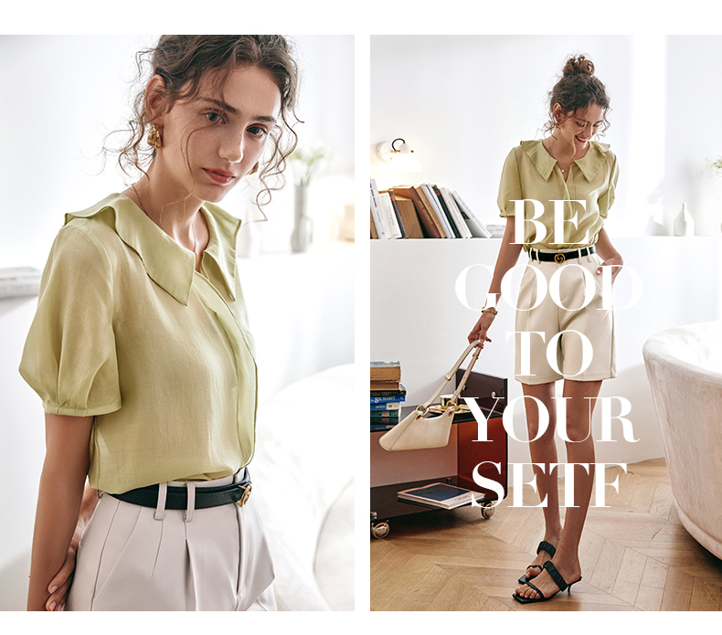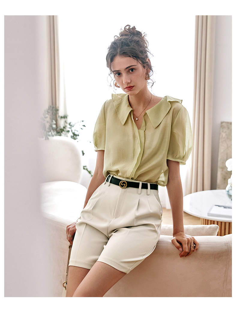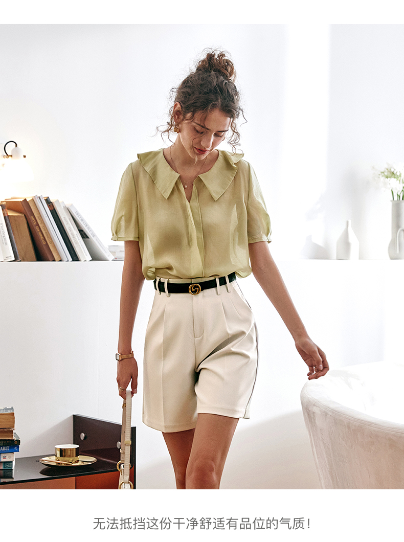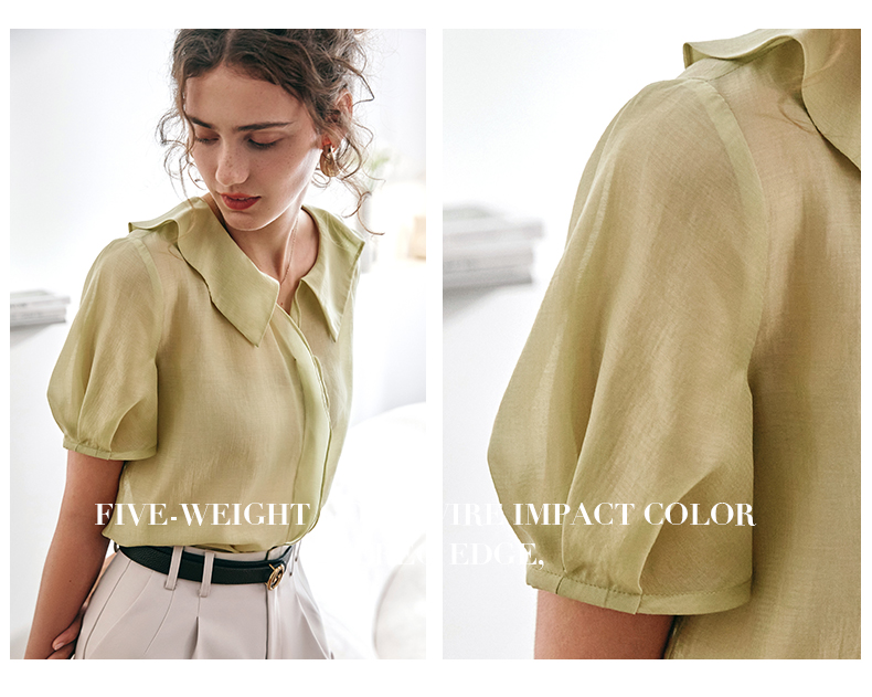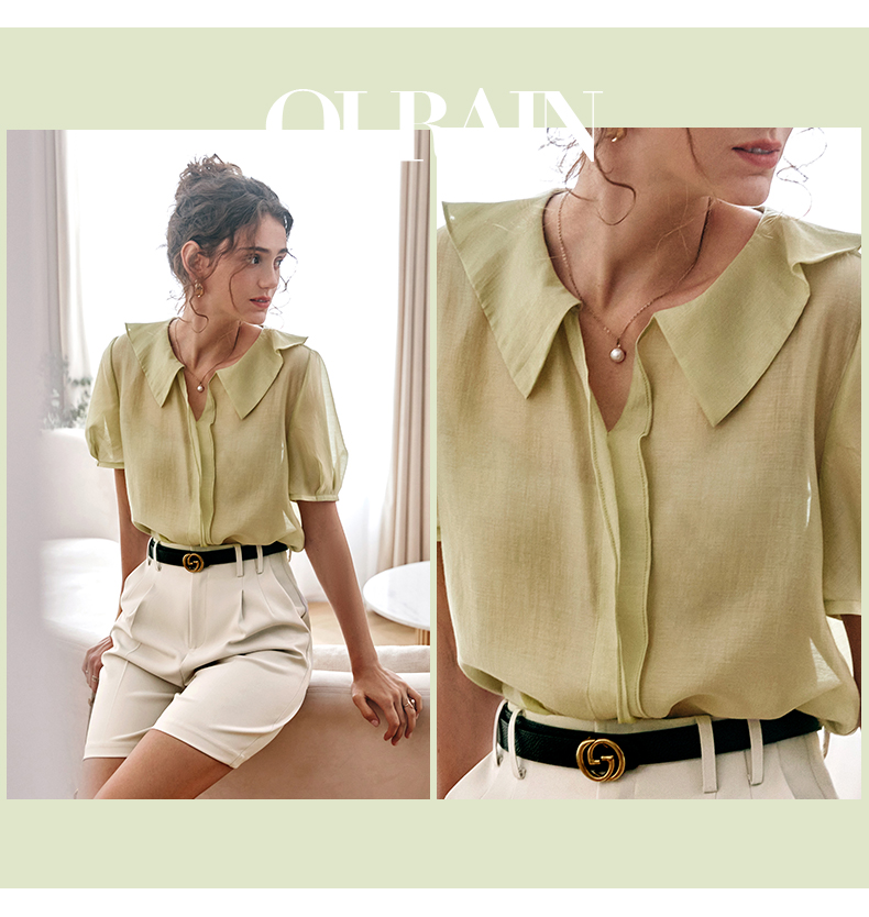 欧芮儿绿色雪纺衫女2021新款短袖荷叶边气质薄款别致小衫上衣