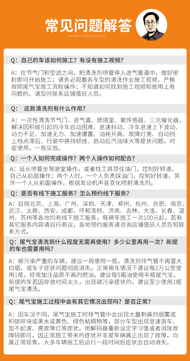 1瓶尾气宝+3瓶亲水剂,为一个组合,亲水剂一箱油加一瓶(加油前加入),加亲水剂后多跑跑,跑100公里以后,开始施工第1瓶尾气宝,间隔一周或者500公里使用第2瓶尾气宝,期间每箱油都加一瓶亲水剂,症状不严重的车辆5万公里左右最少使用一个组合,10万左右公里最少用2个组合,15万公里左右使用最少3个组合,以此类推,加过燃油宝、大排量等症状严重得车辆用量加倍彻底清洗。建议每5000-10000公里使用1个组合养护车辆。