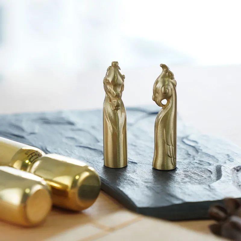 以玉带钩S型曲线为基础,黄铜材质为特色,重新设计龙、凤形象,造型大方简洁,弧度优雅,持握舒适。