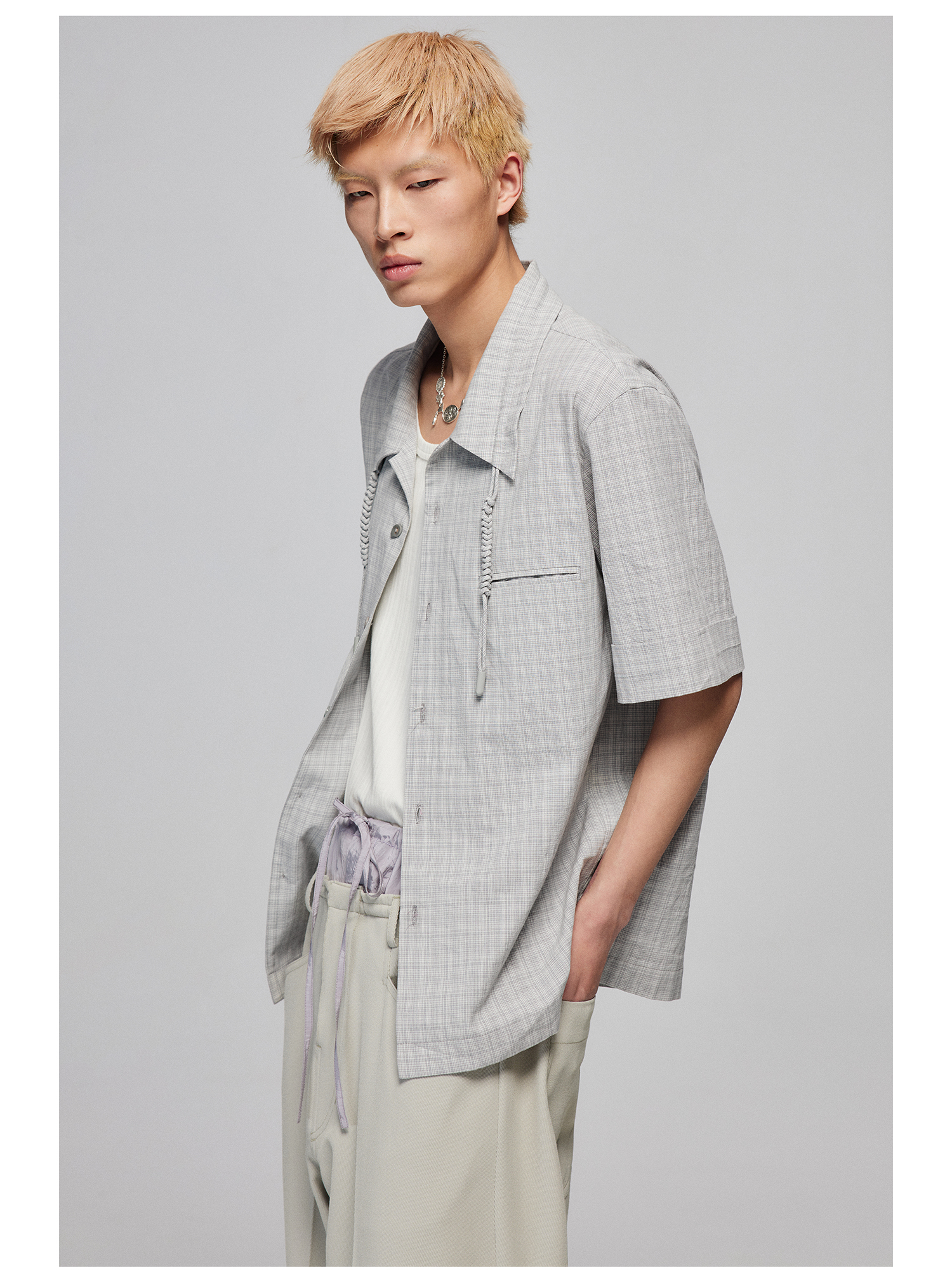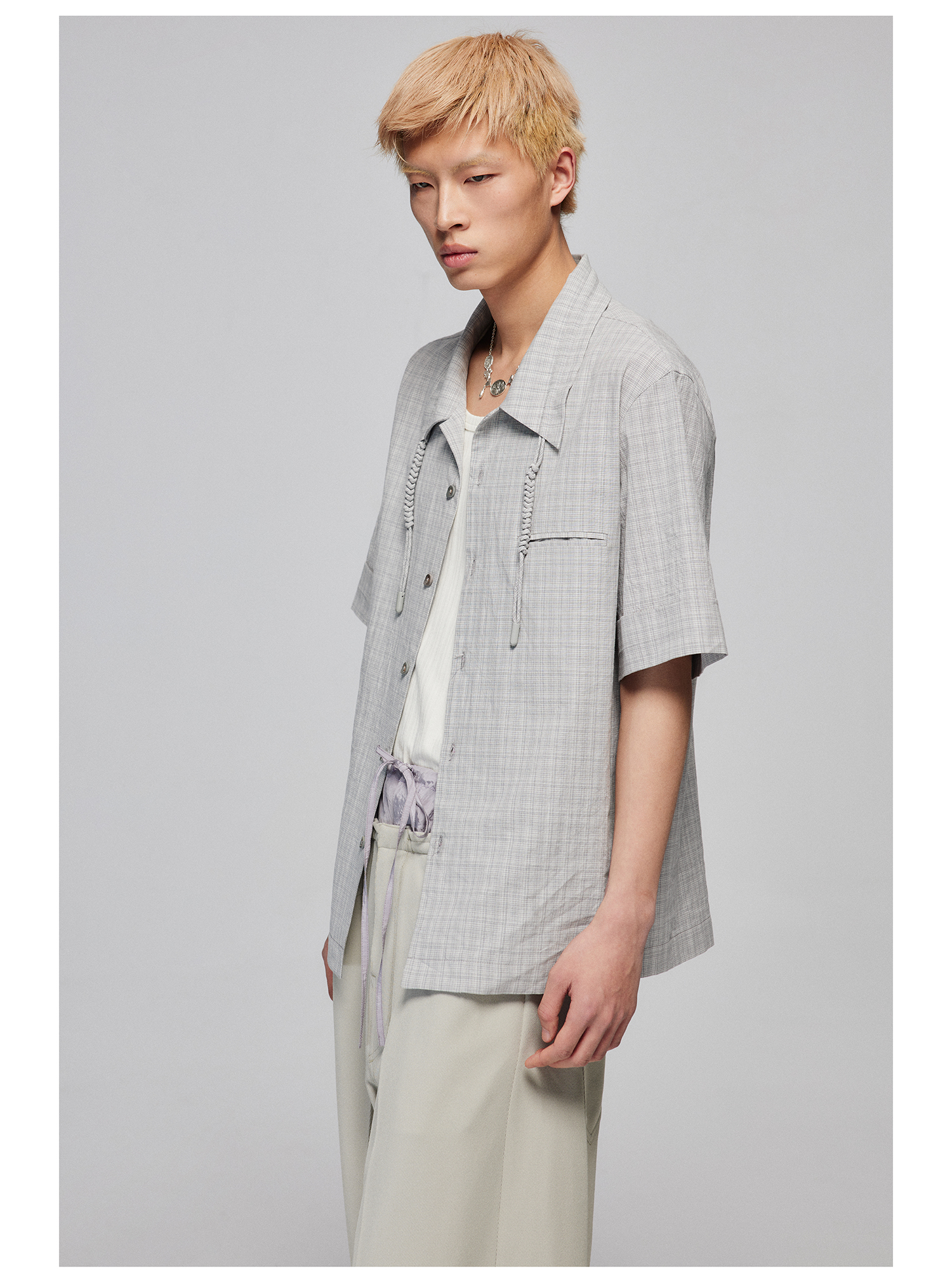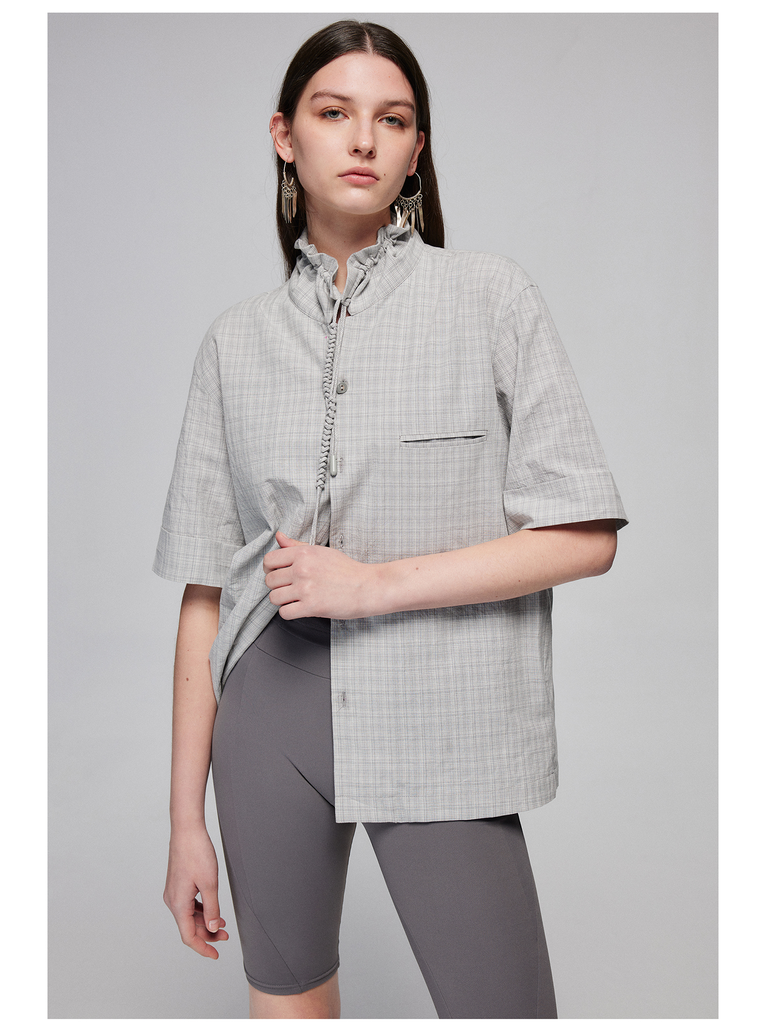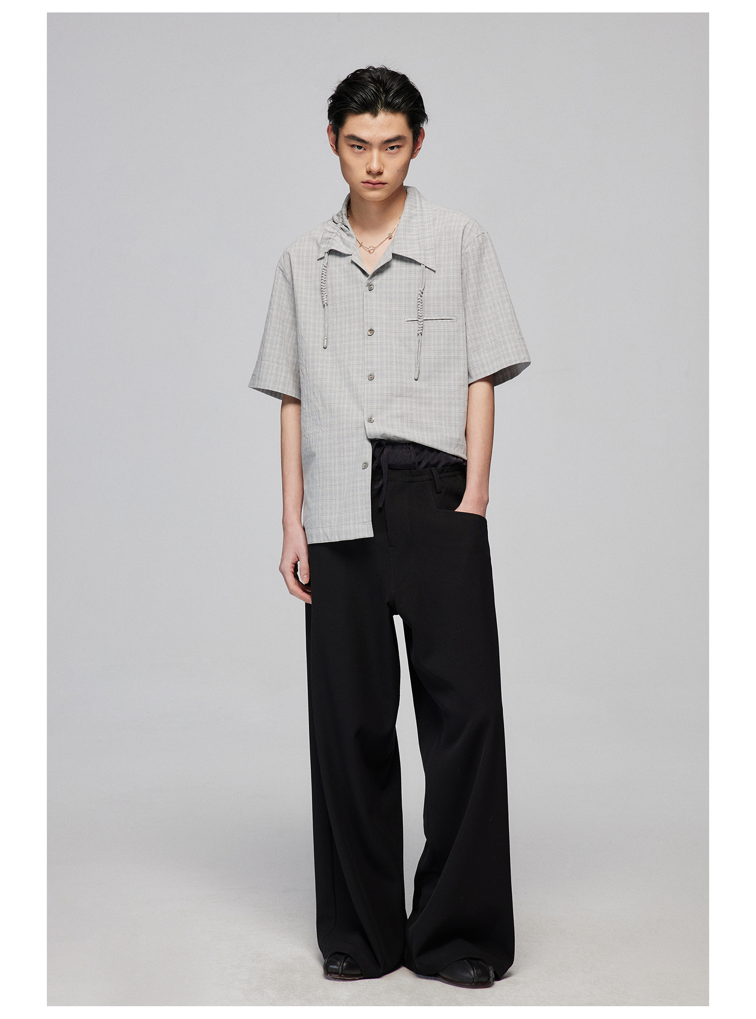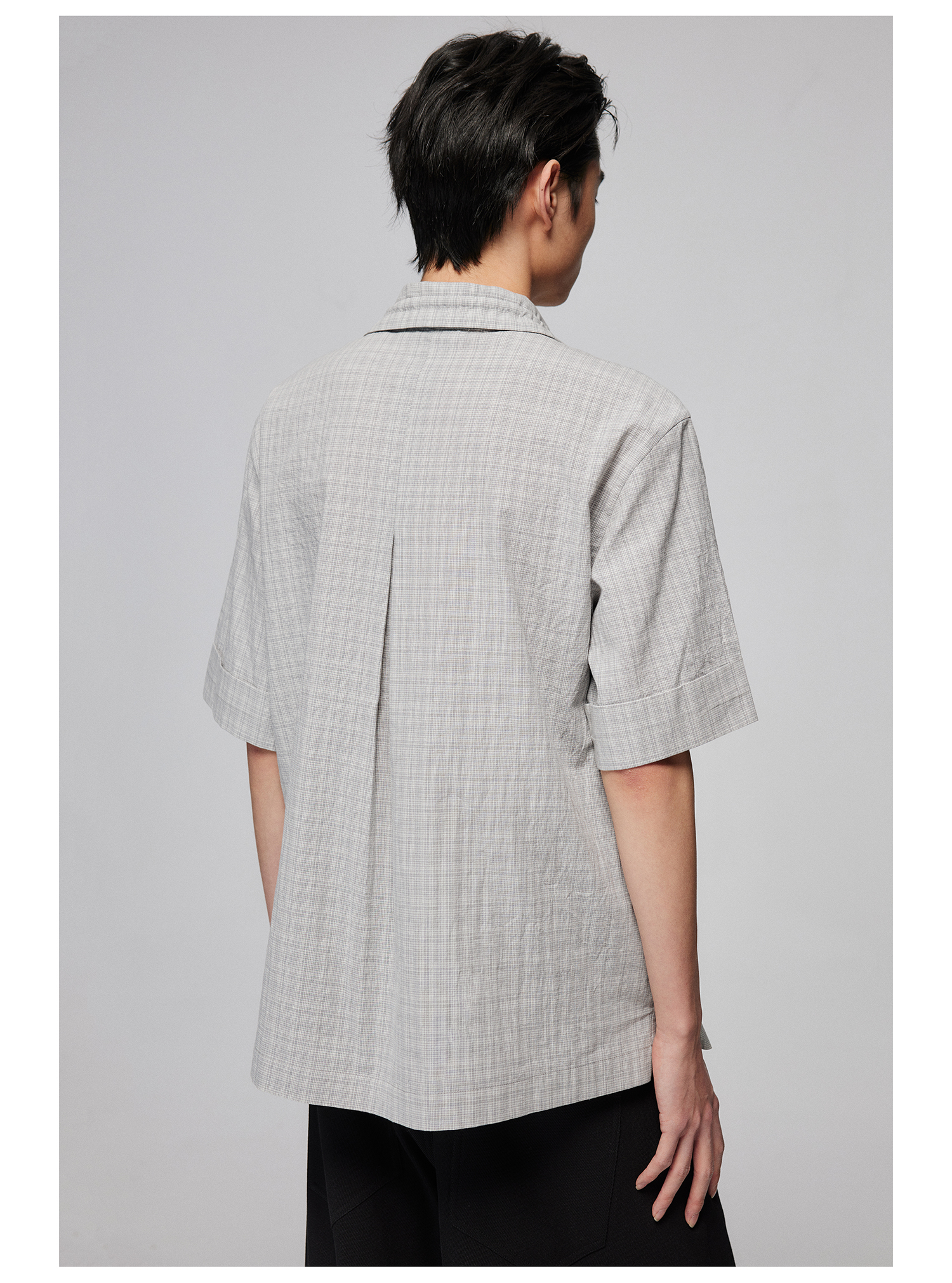 Simple Project/Y2487/纯棉格纹领子抽绳宽松古巴领短袖衬衫